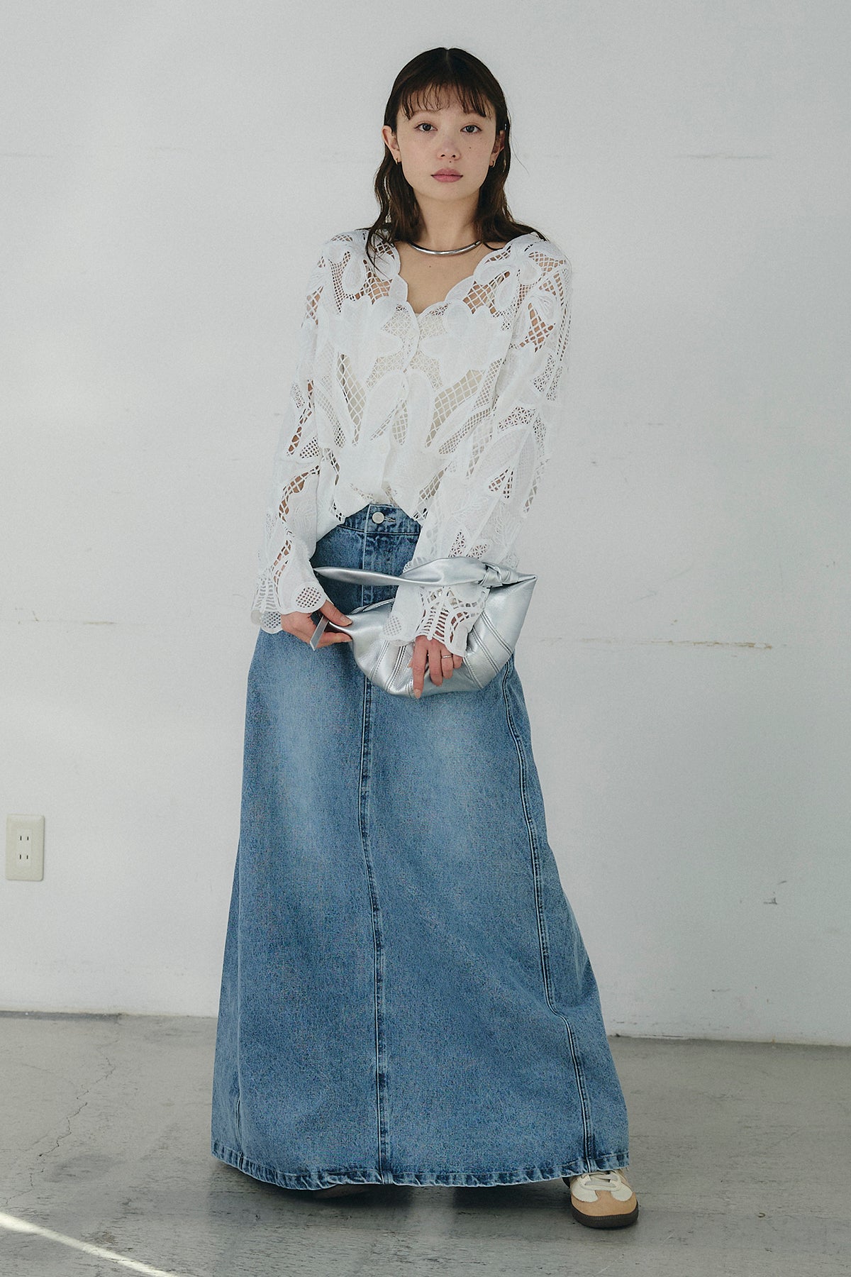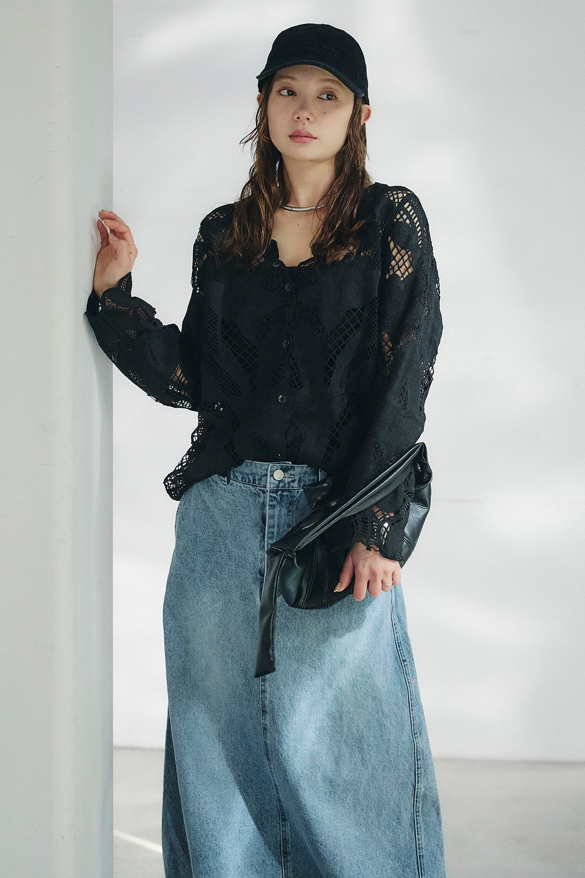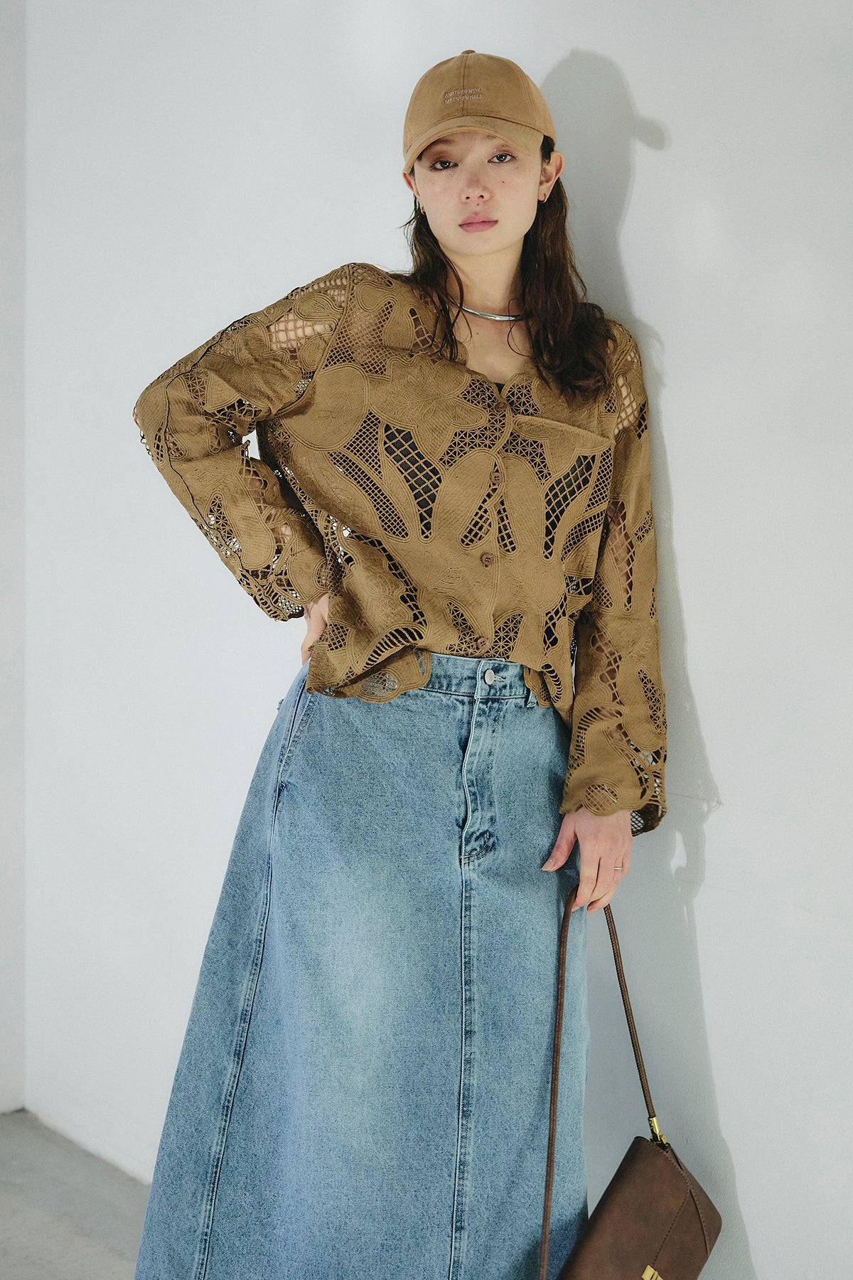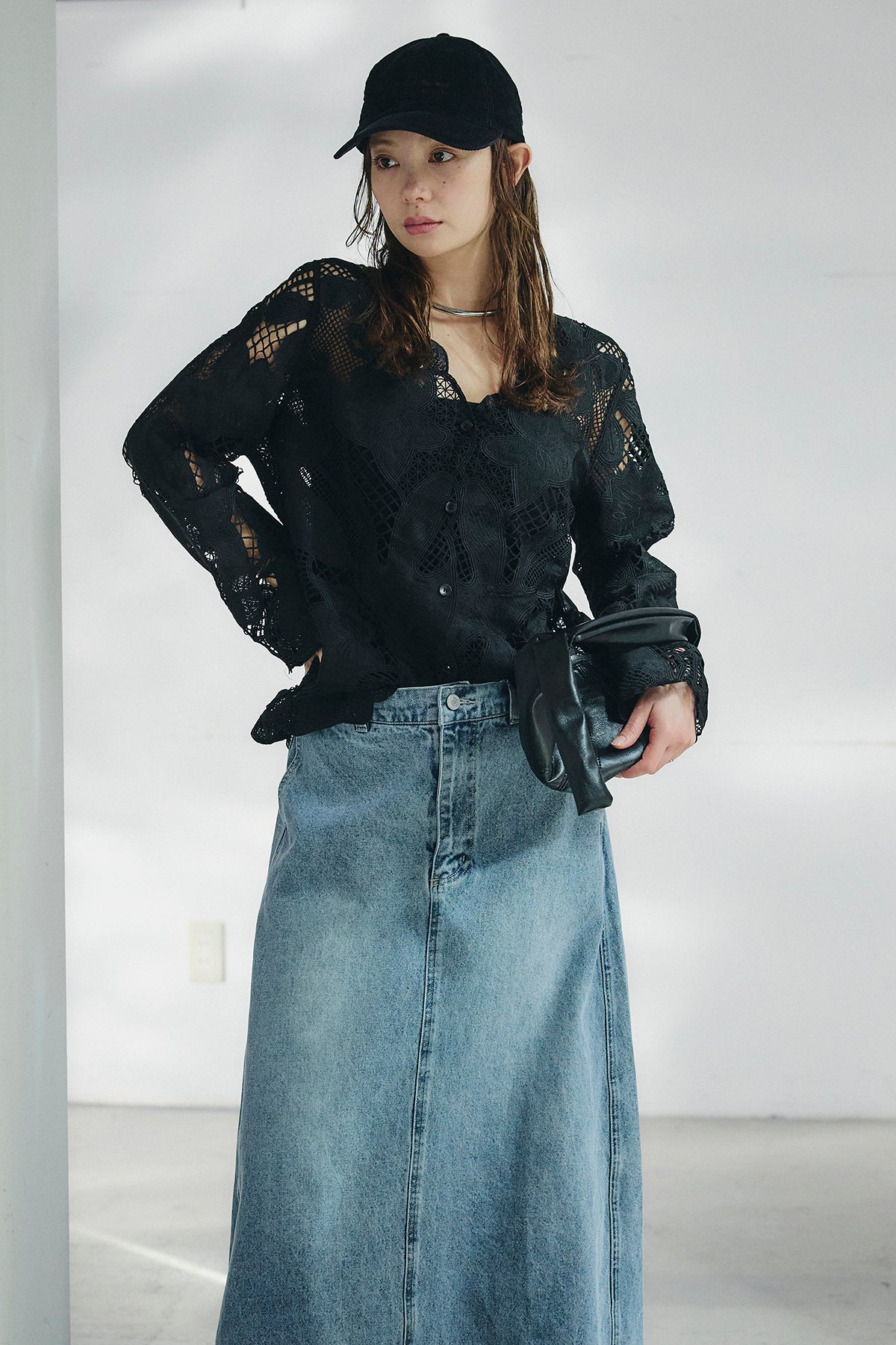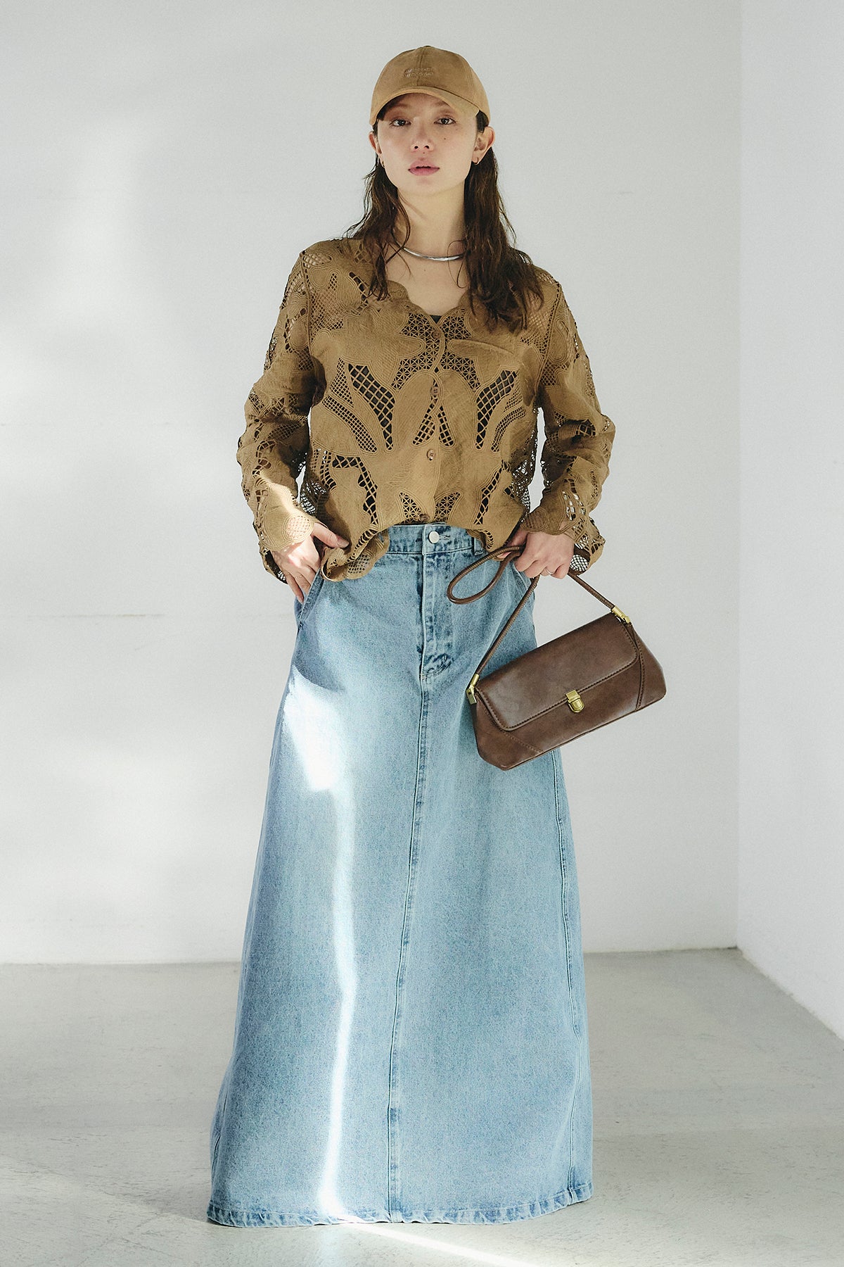 [SET]フラワー刺繍レースブラウス+デニムロングフレアスカート(2set)