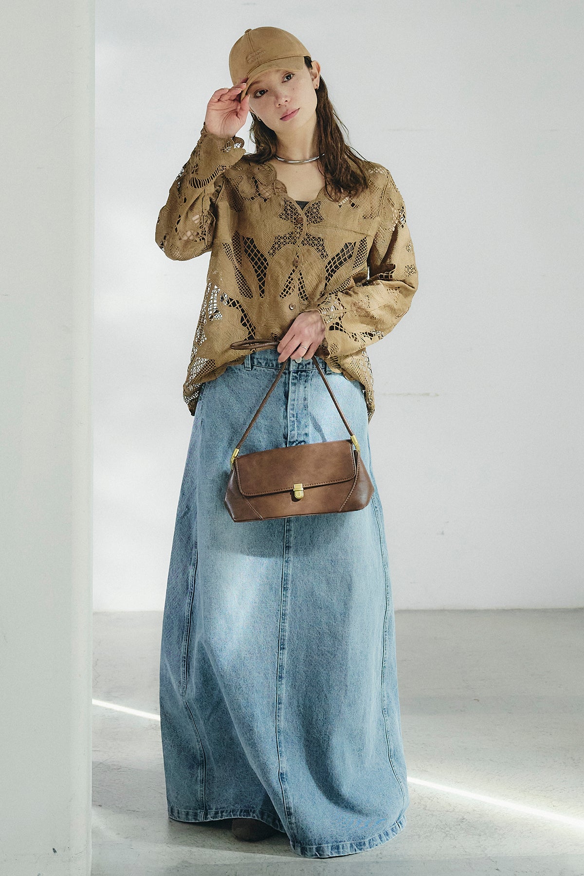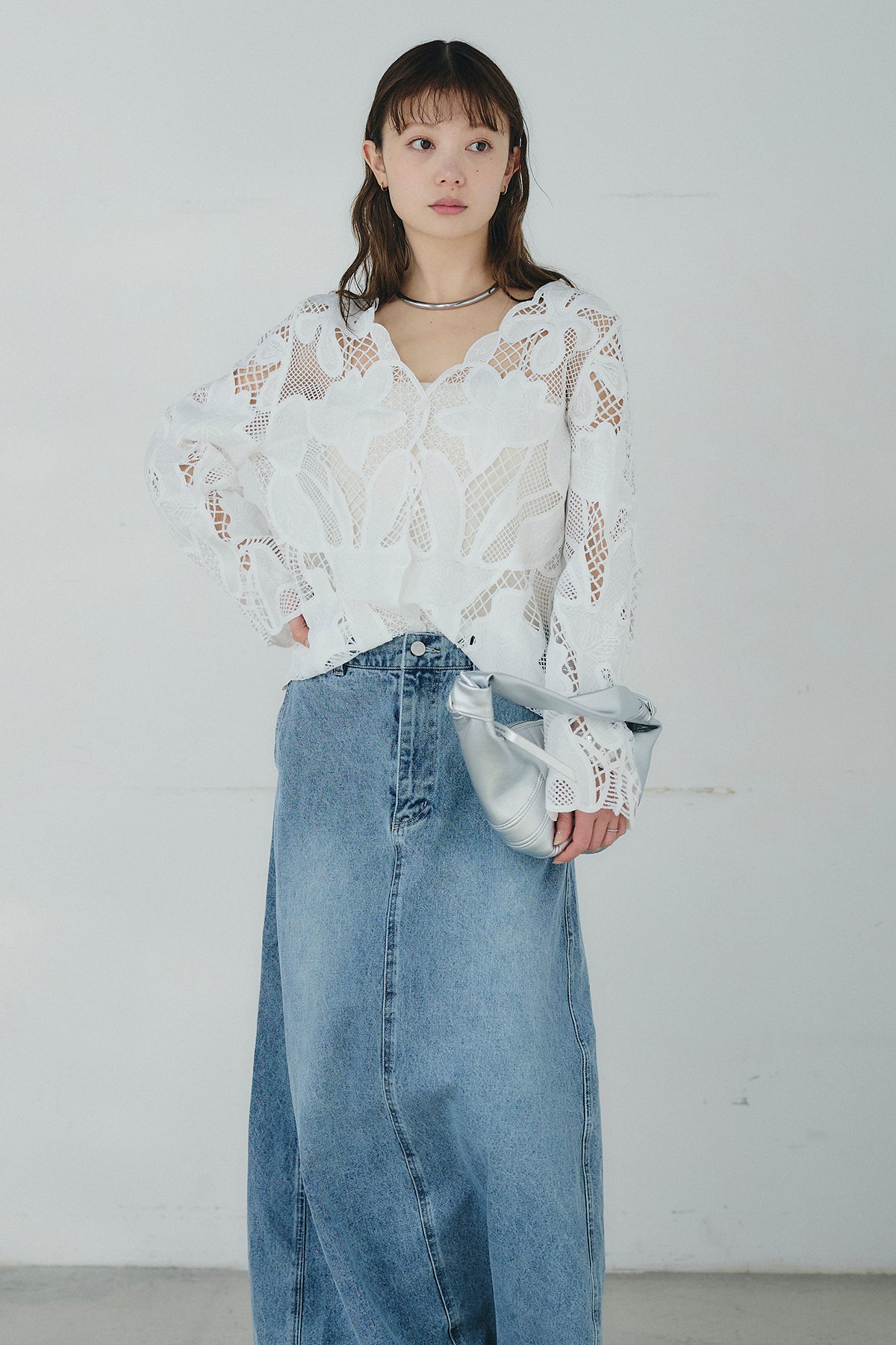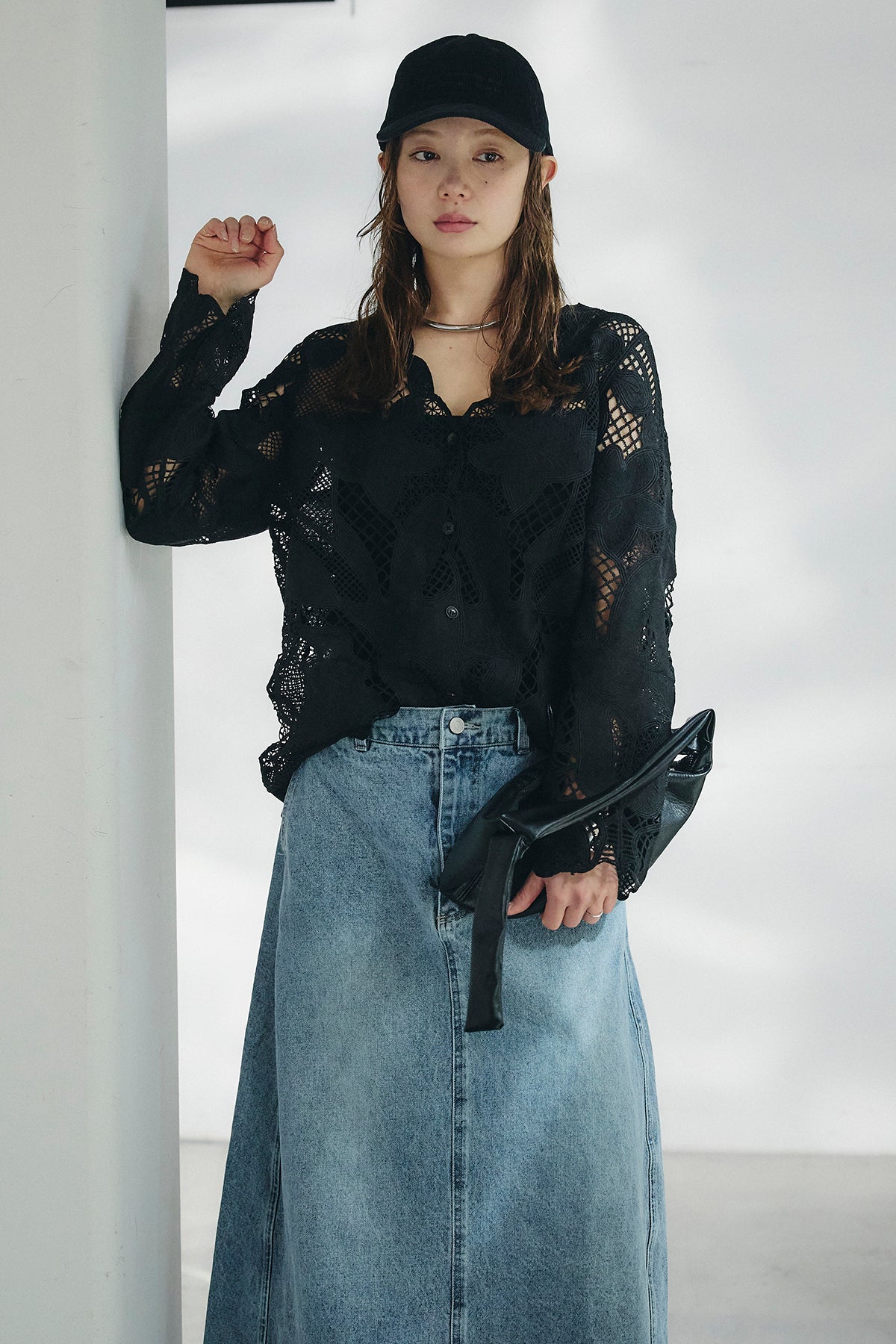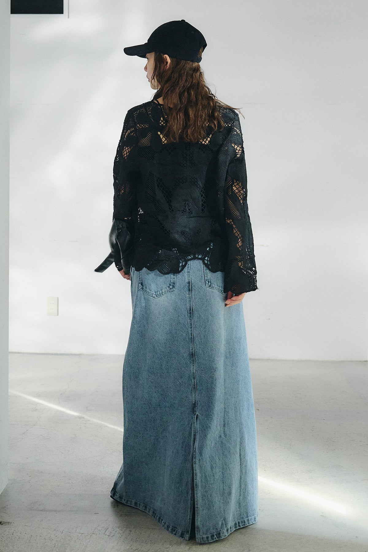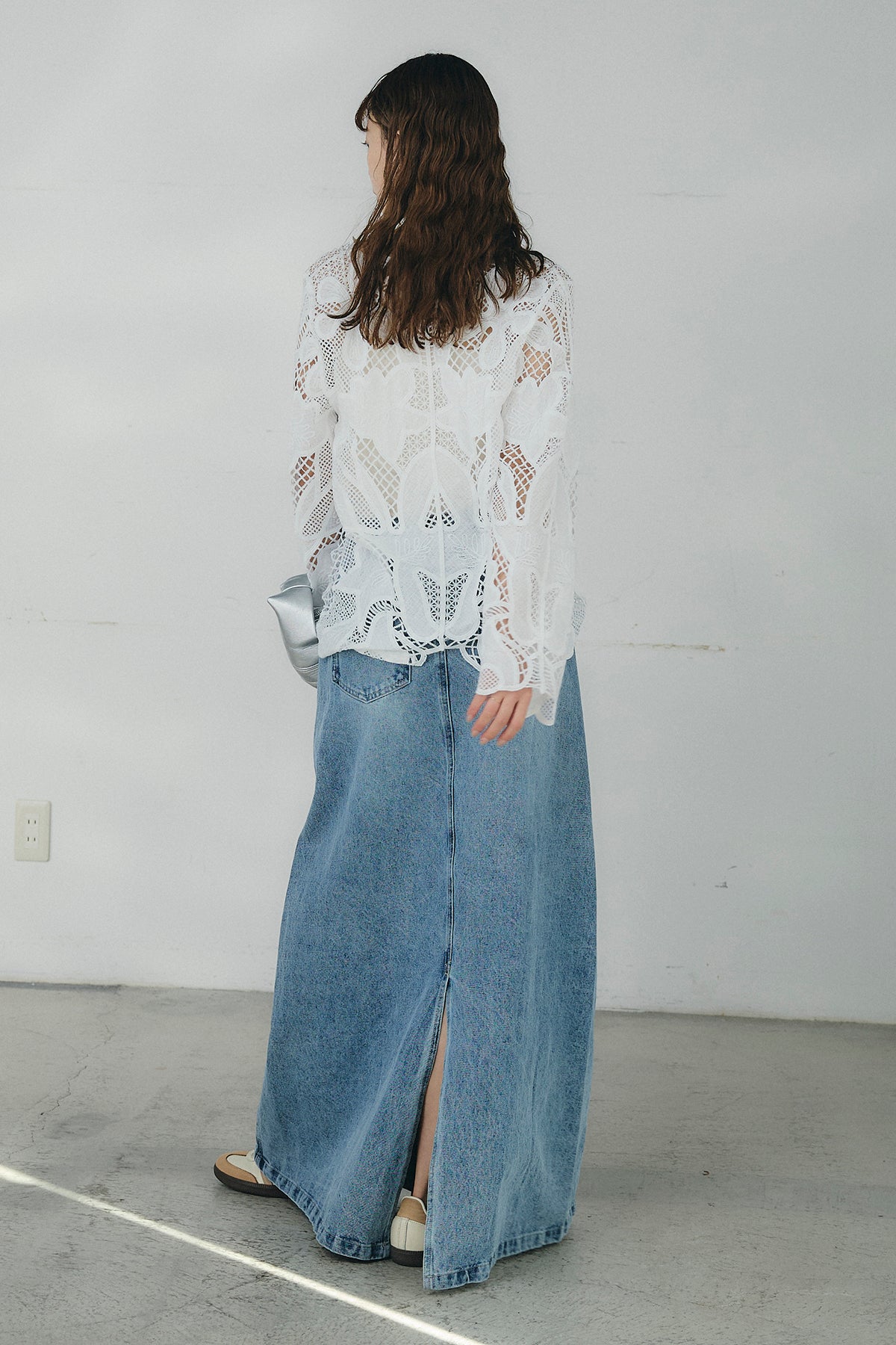 [SET]フラワー刺繍レースブラウス+デニムロングフレアスカート(2set)