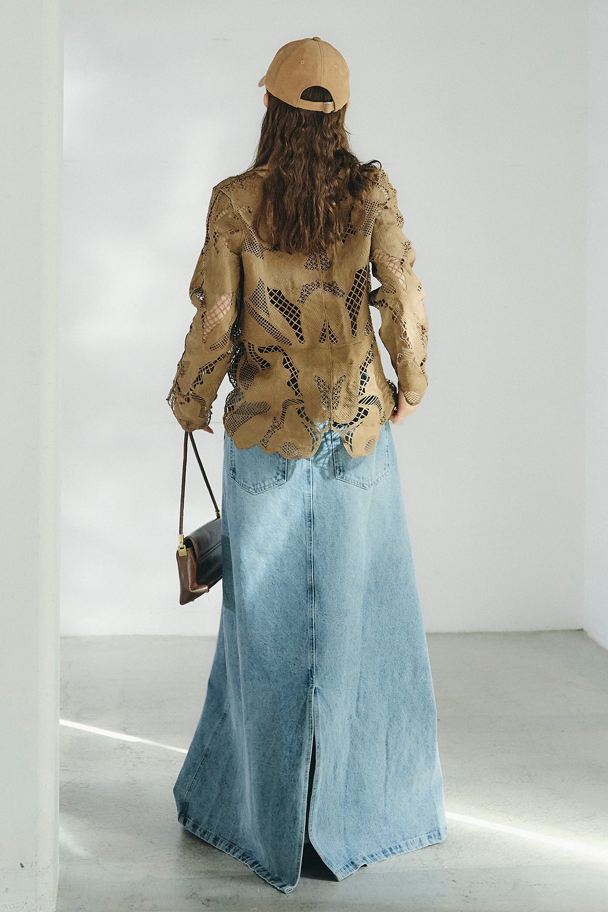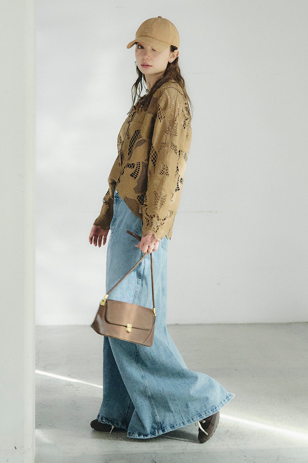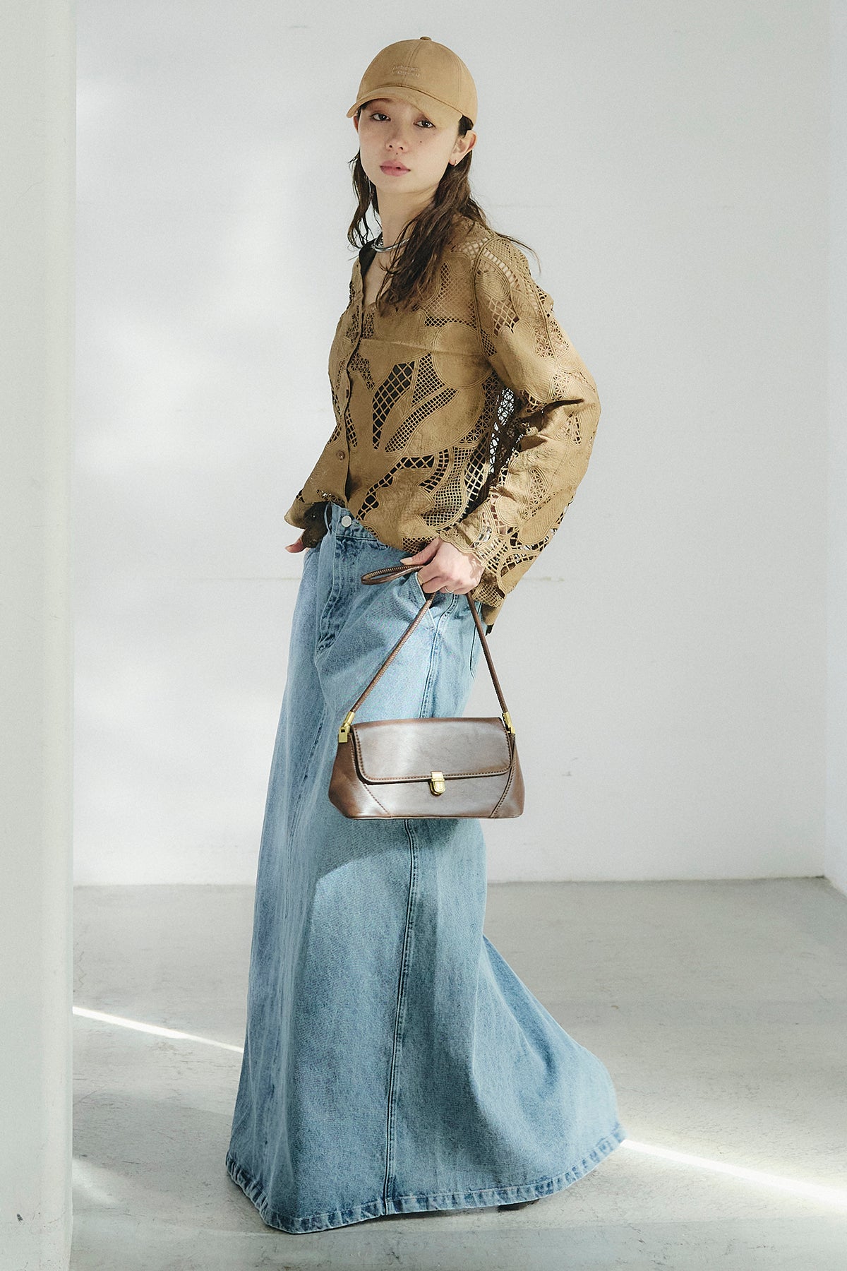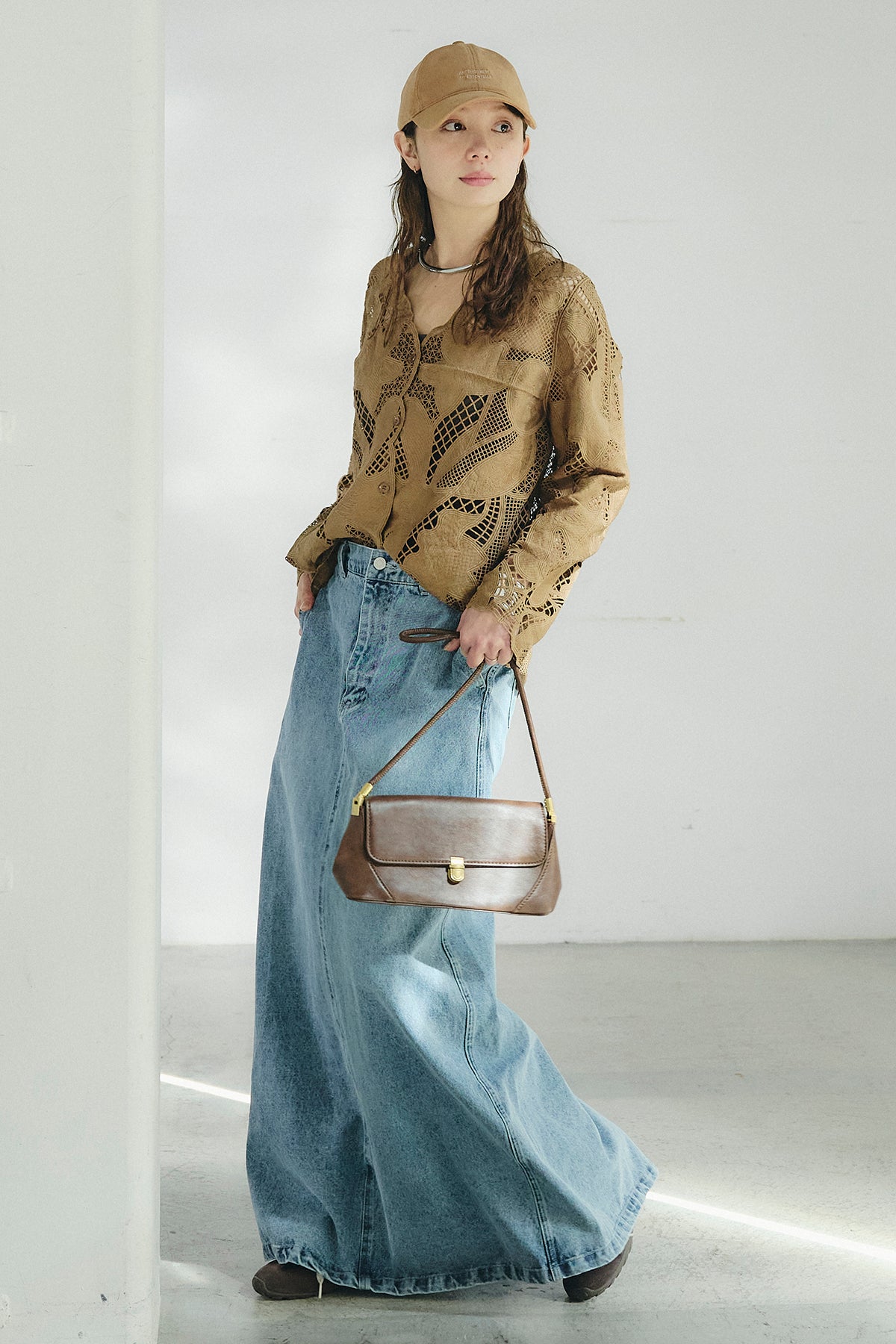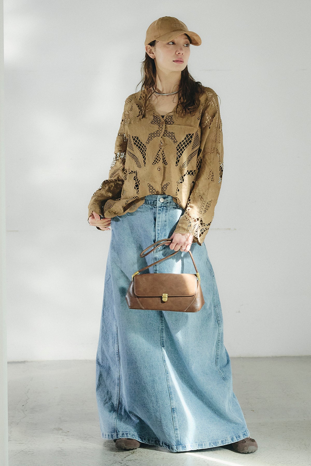 [SET]フラワー刺繍レースブラウス+デニムロングフレアスカート(2set)