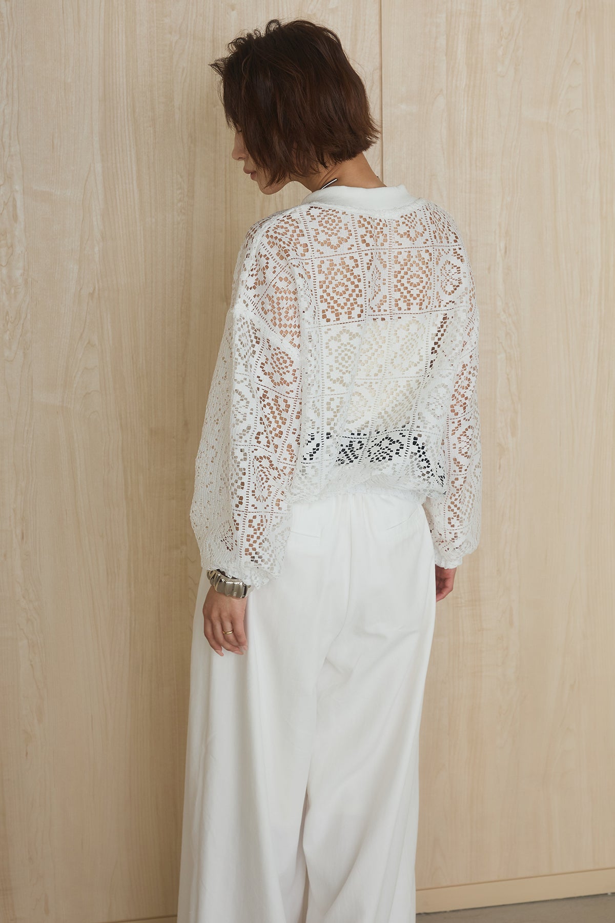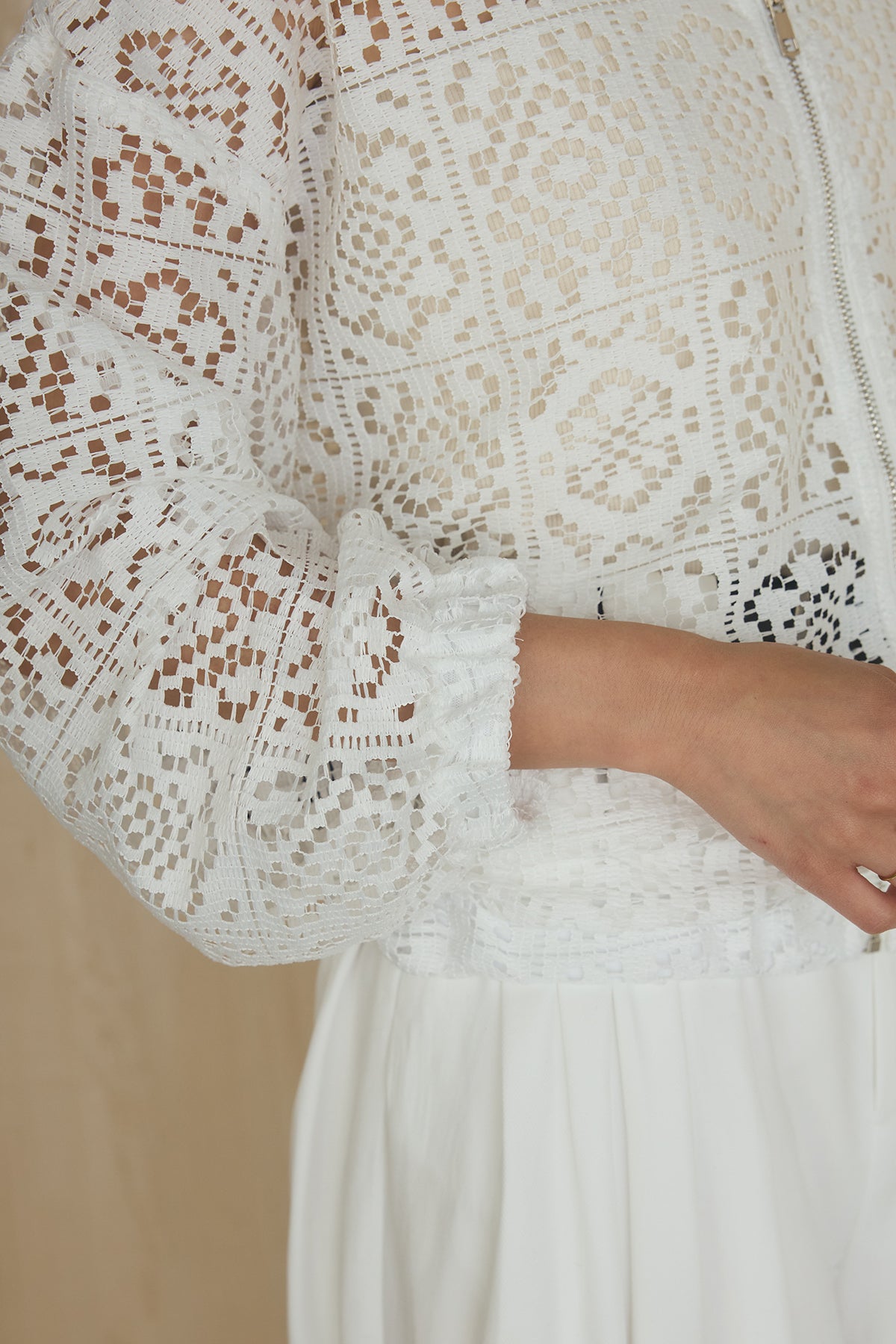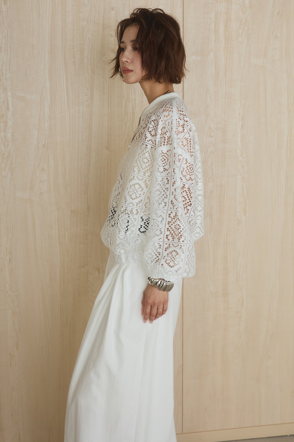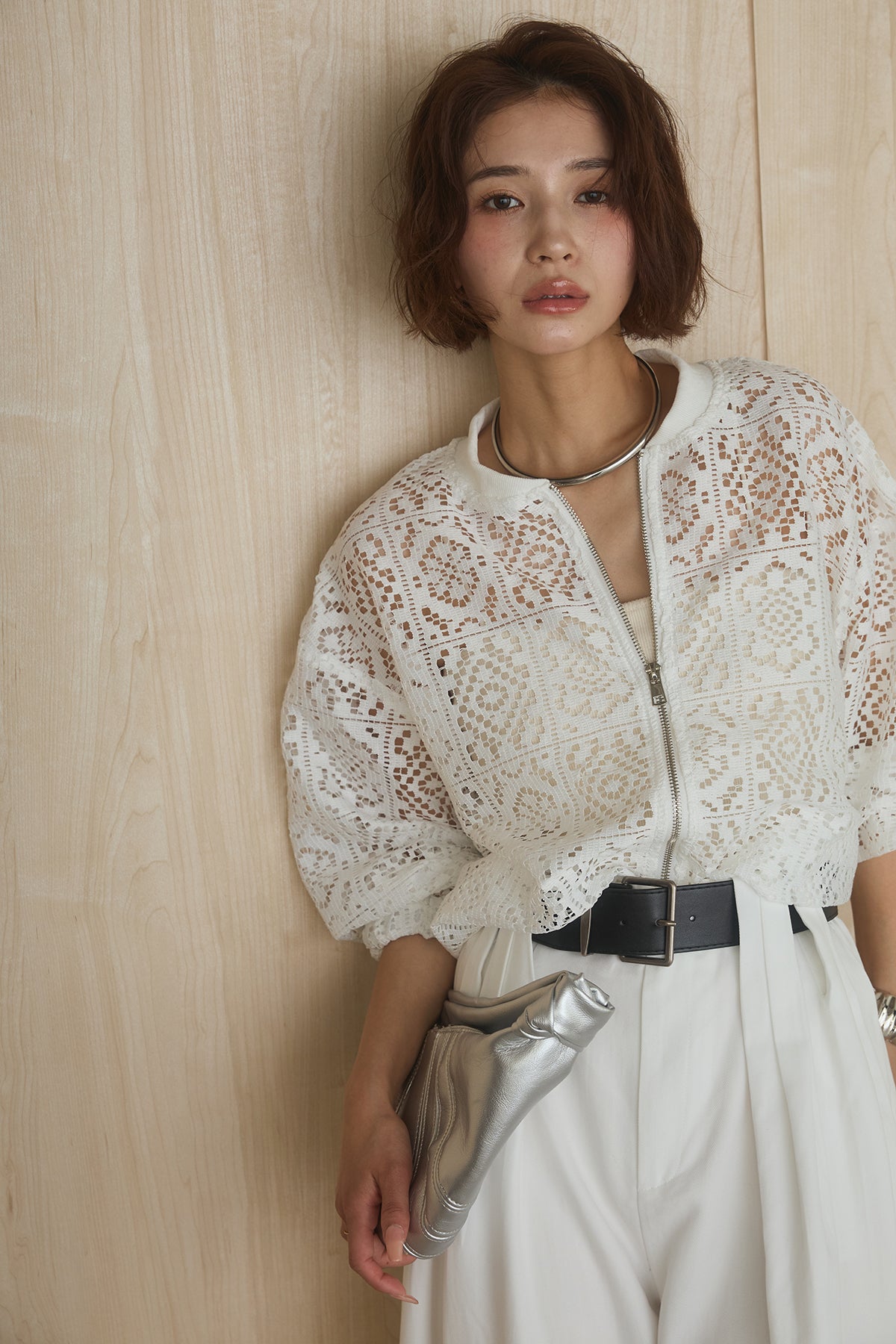 幾何レースブルゾンは、繊細な幾何学模様のレース素材を使用した、軽やかで華やかな印象の一着です。透け感のあるデザインが抜け感を演出し、シンプルなインナーに羽織るだけでコーディネートに奥行きをプラスします。フロントジップ仕様で着脱しやすく、カジュアルからきれいめまで幅広いスタイリングに取り入れやすいアイテムです。
