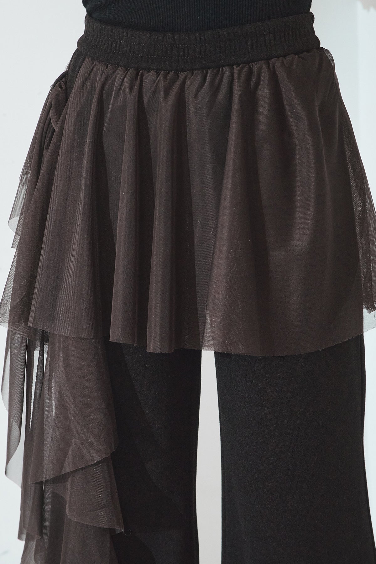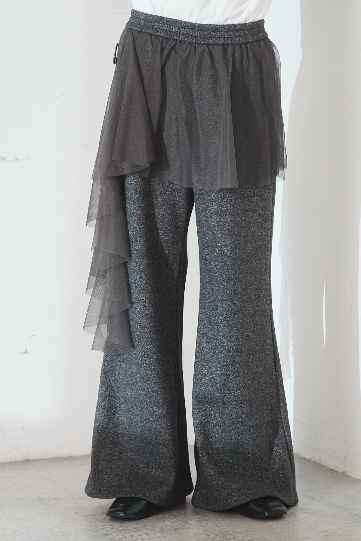 ニットパンツにチュールを重ねた、レイヤードデザインが目を引く一本。柔らかなニット素材に軽やかなチュールを合わせることで、甘さとモード感をバランスよく表現しています。縦に落ちるシルエットが脚のラインをすっきりと見せ、動くたびに表情の変化を楽しめるのも魅力。シンプルなトップスを合わせるだけで、スタイリングに奥行きを添えてくれるアイテムです。