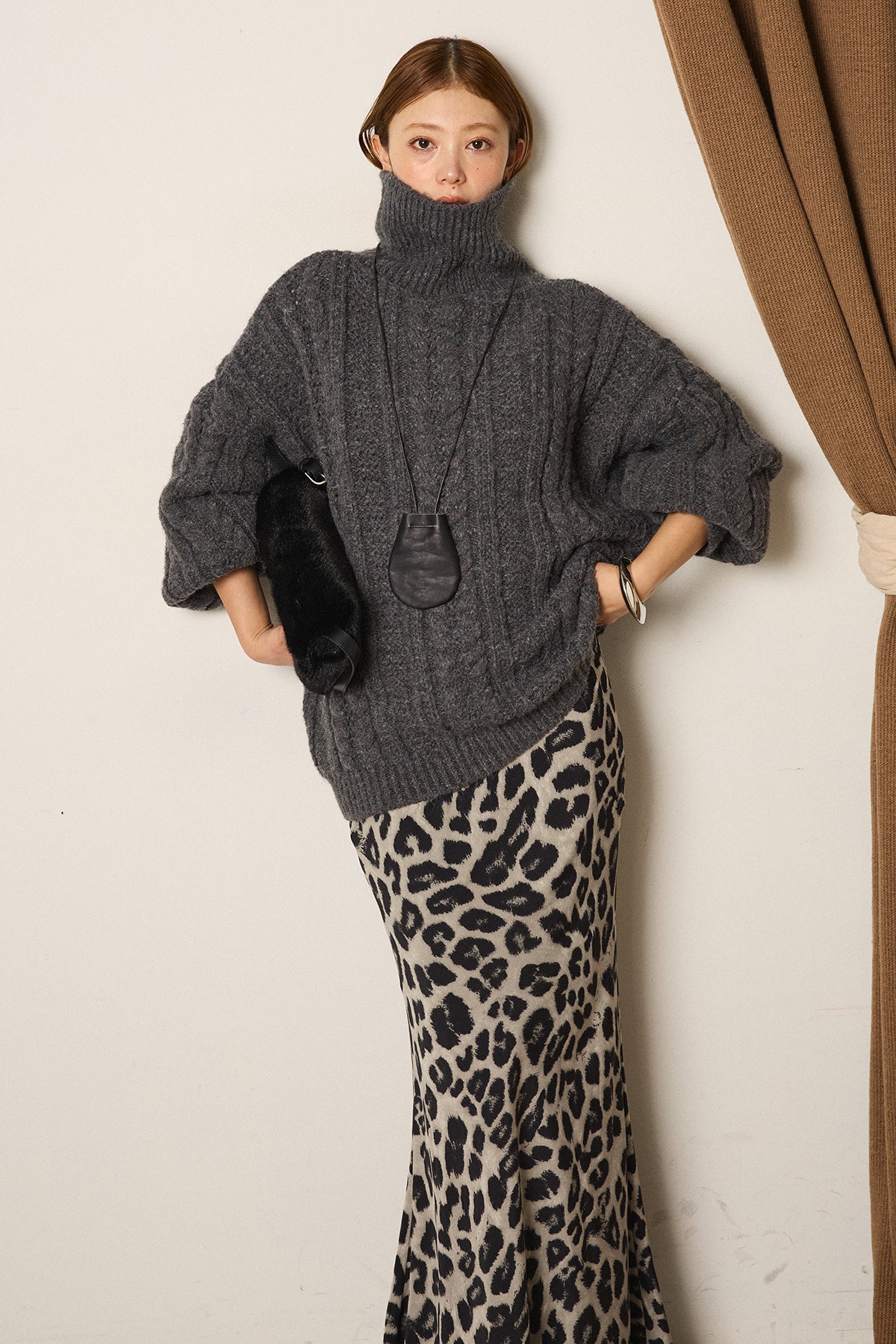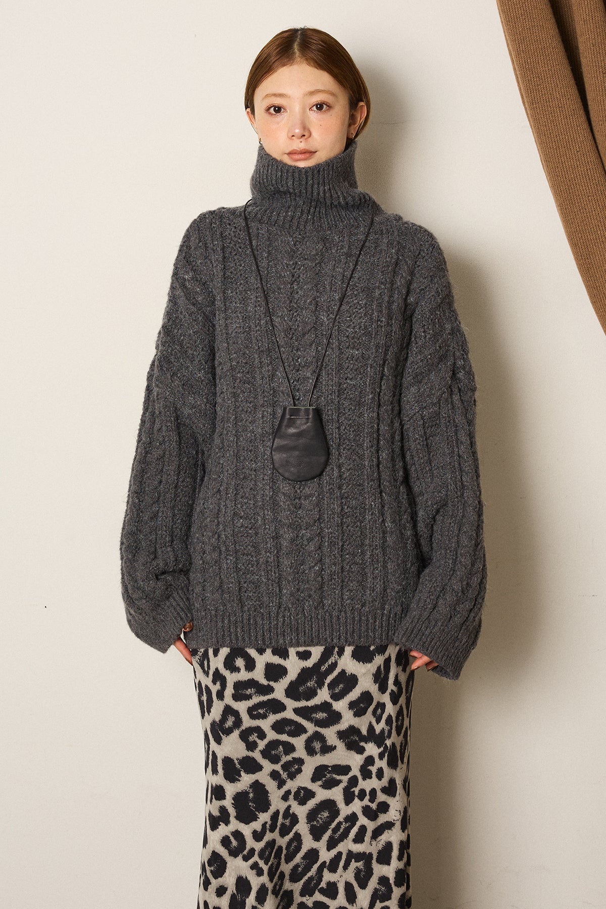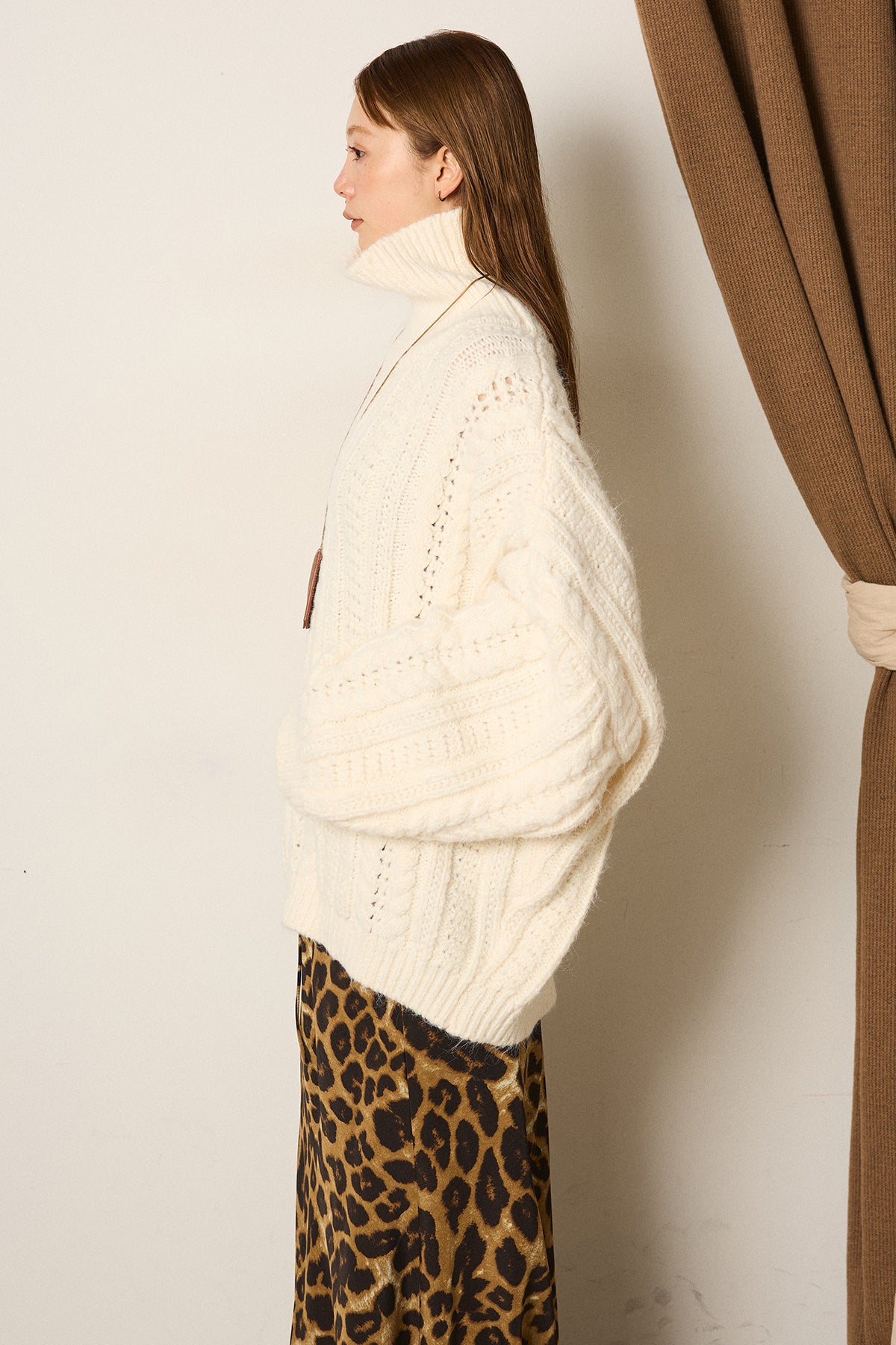 立体感のある編み柄が印象的なハイネックニットトップス。縦ラインを強調するケーブルとリブの組み合わせで、オーバーシルエットでもすっきりとしたバランスに仕上げています。首元をやさしく包むハイネックデザインは、顔まわりに自然な存在感をプラス。程よくゆとりのあるサイズ感で、レイヤードもしやすく、ボトムを選ばず取り入れやすい一枚です。一枚で主役になる編み地の表情が、シンプルなスタイリングにも奥行きを添えます。
