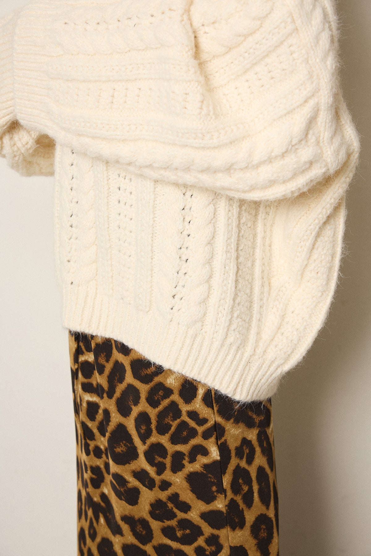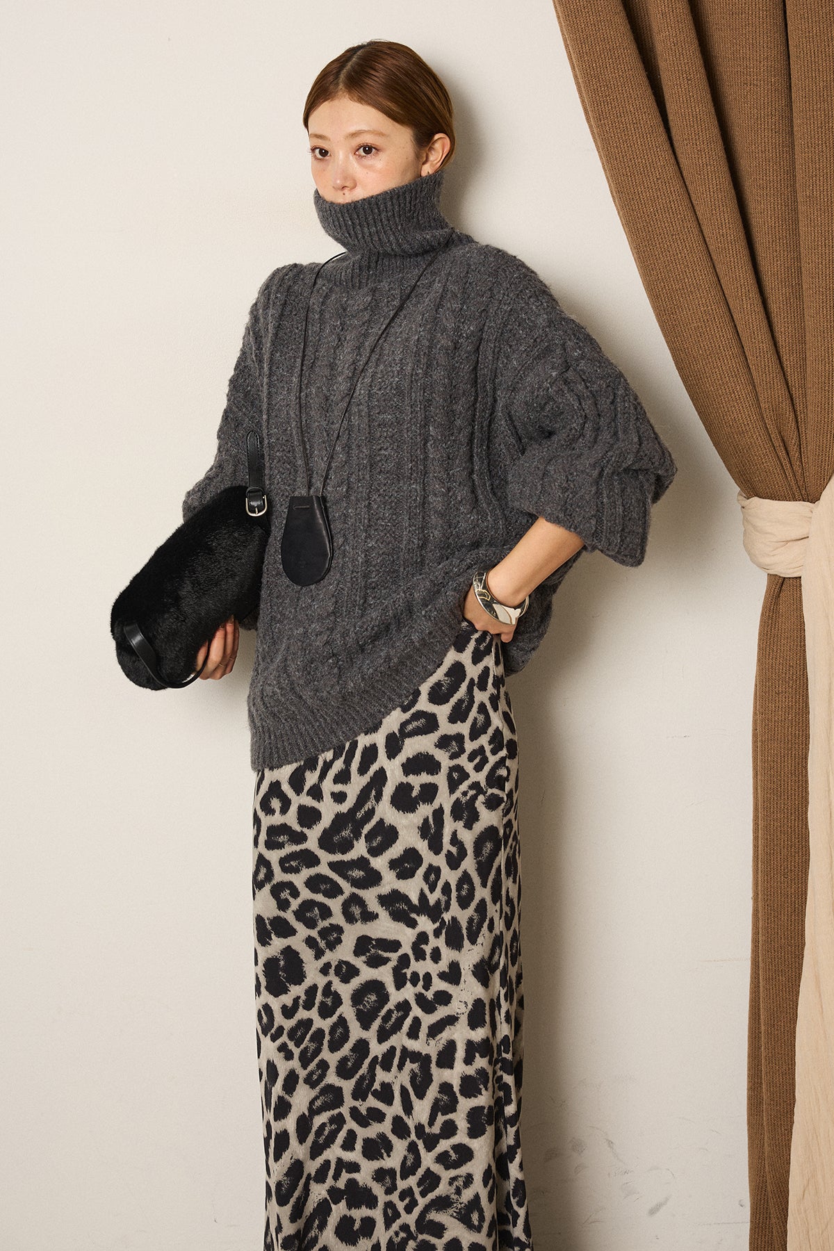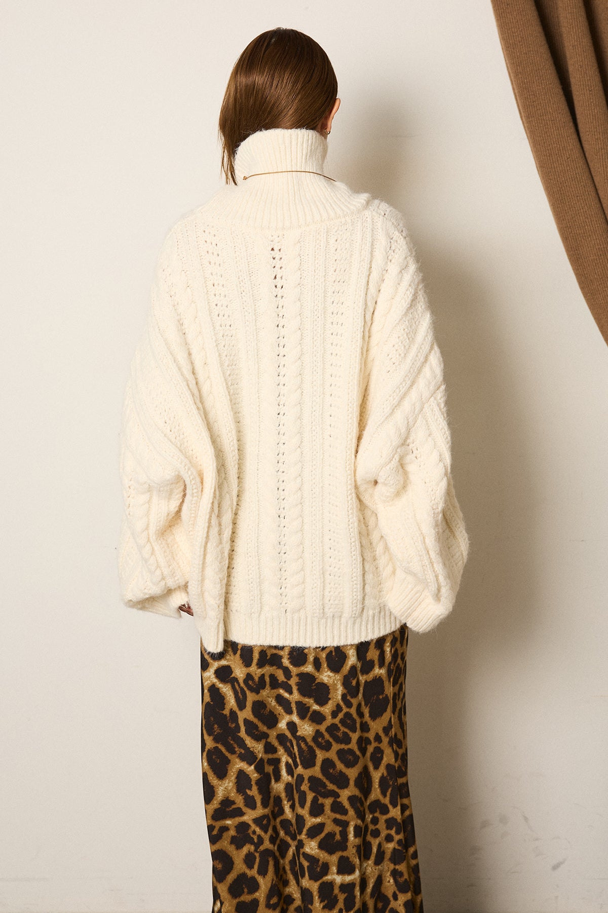 立体感のある編み柄が印象的なハイネックニットトップス。縦ラインを強調するケーブルとリブの組み合わせで、オーバーシルエットでもすっきりとしたバランスに仕上げています。首元をやさしく包むハイネックデザインは、顔まわりに自然な存在感をプラス。程よくゆとりのあるサイズ感で、レイヤードもしやすく、ボトムを選ばず取り入れやすい一枚です。一枚で主役になる編み地の表情が、シンプルなスタイリングにも奥行きを添えます。