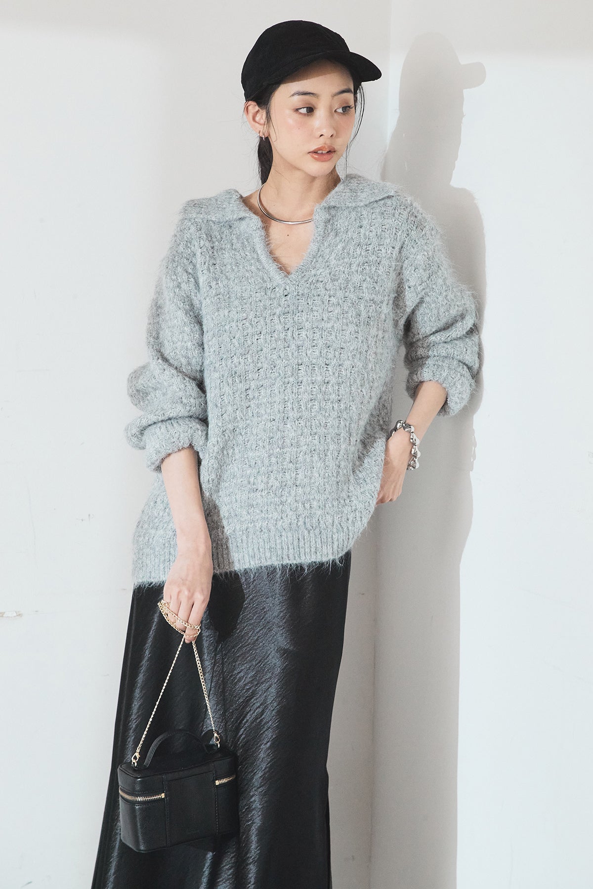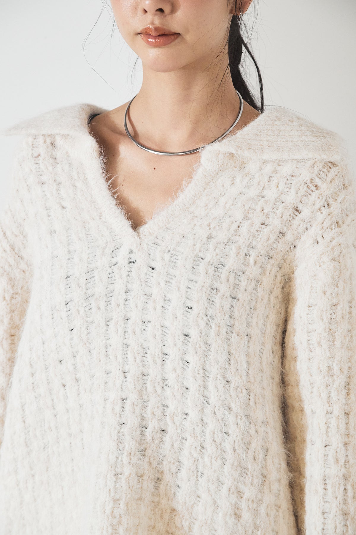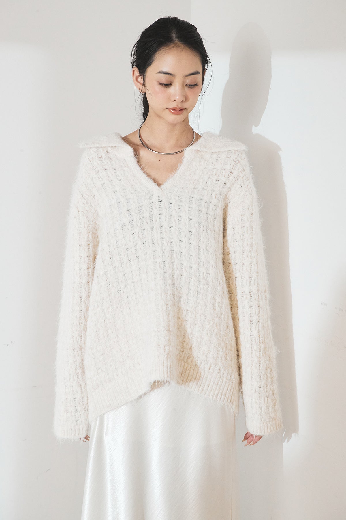 柔らかな風合いのニットに、襟付きのVネックデザインを取り入れたトップス。程よく開いたVラインが顔まわりをすっきり見せ、きちんと感と抜け感を両立します。ゆとりのあるシルエットでリラックスした着心地ながら、上品な印象に仕上がるのも魅力。パンツにもスカートにも合わせやすく、デイリーに活躍する一枚です。