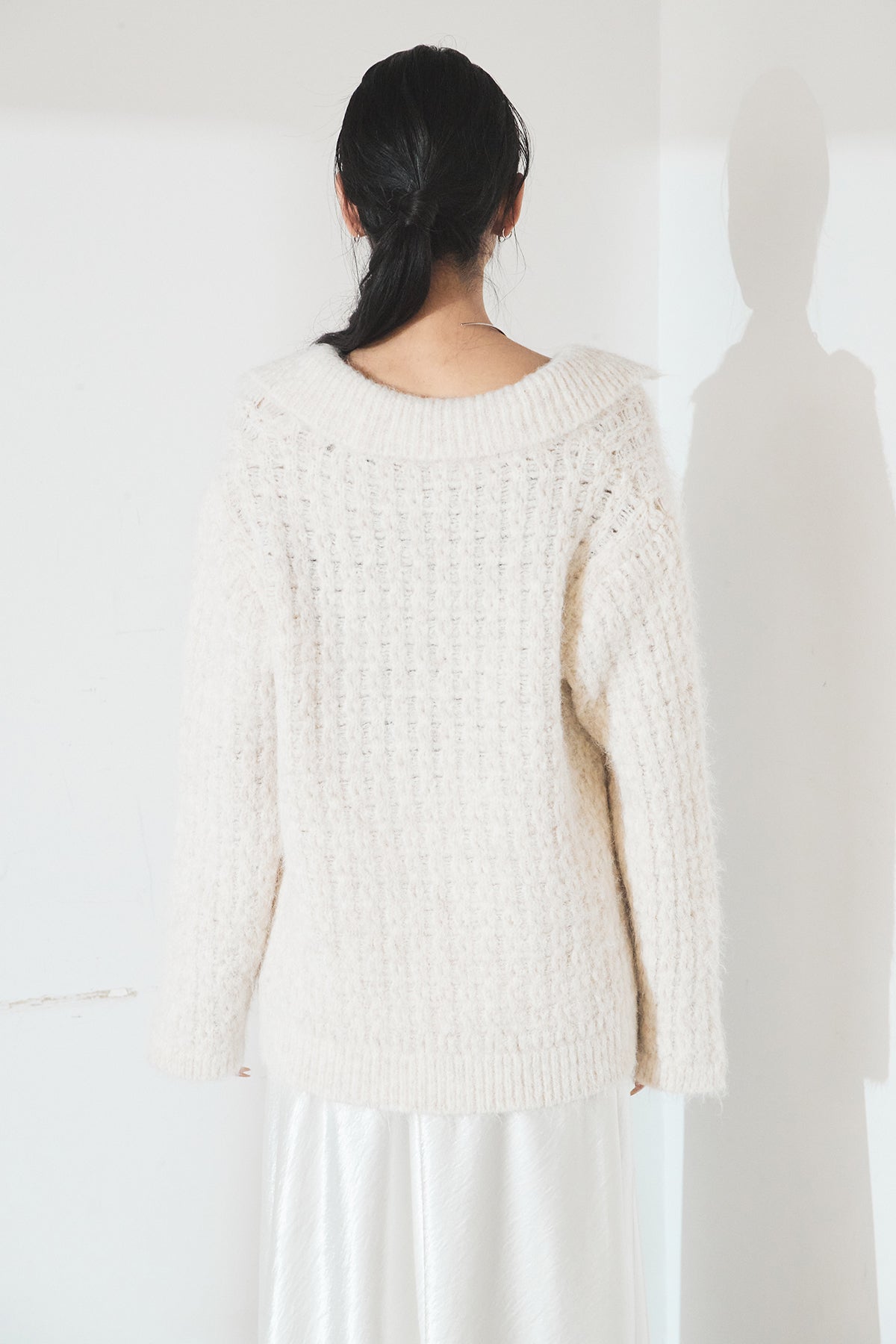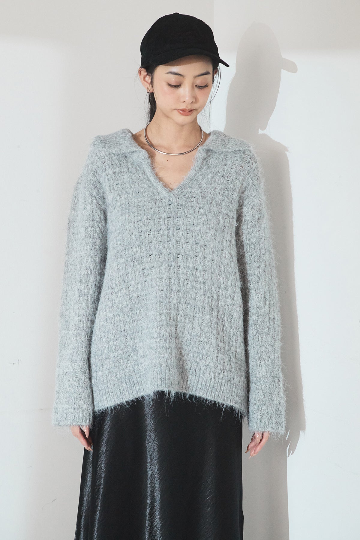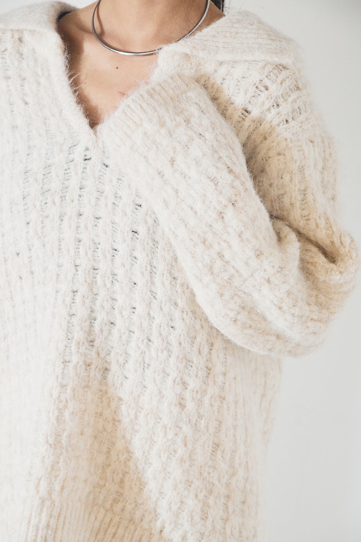 柔らかな風合いのニットに、襟付きのVネックデザインを取り入れたトップス。程よく開いたVラインが顔まわりをすっきり見せ、きちんと感と抜け感を両立します。ゆとりのあるシルエットでリラックスした着心地ながら、上品な印象に仕上がるのも魅力。パンツにもスカートにも合わせやすく、デイリーに活躍する一枚です。
