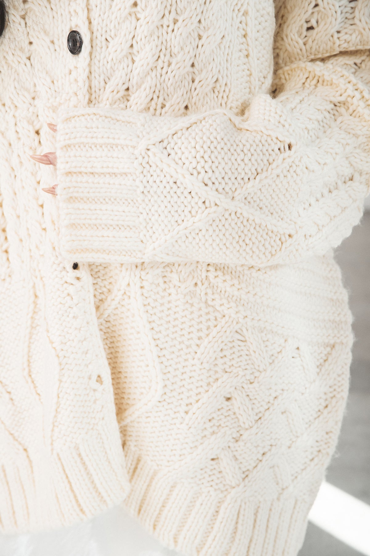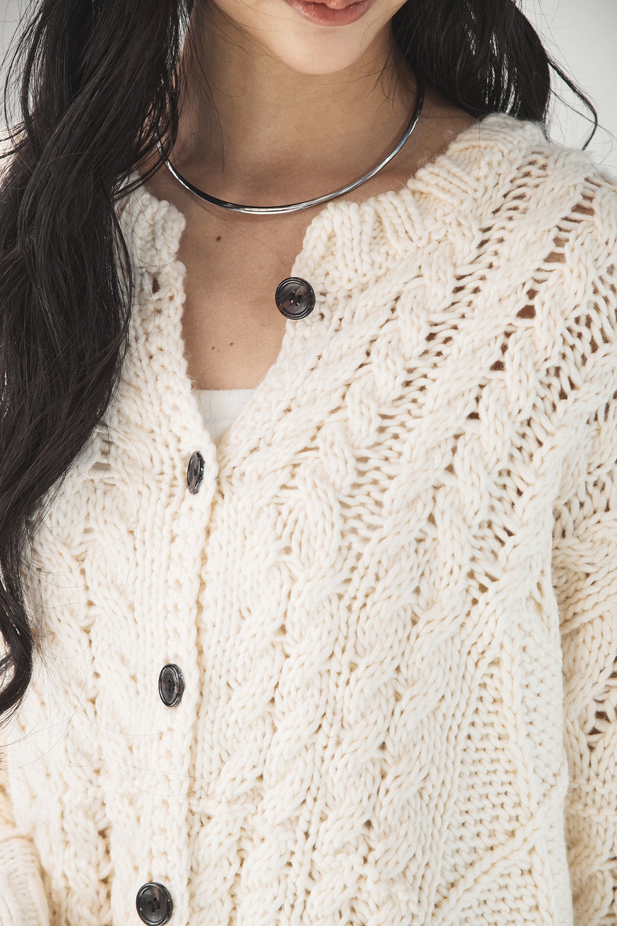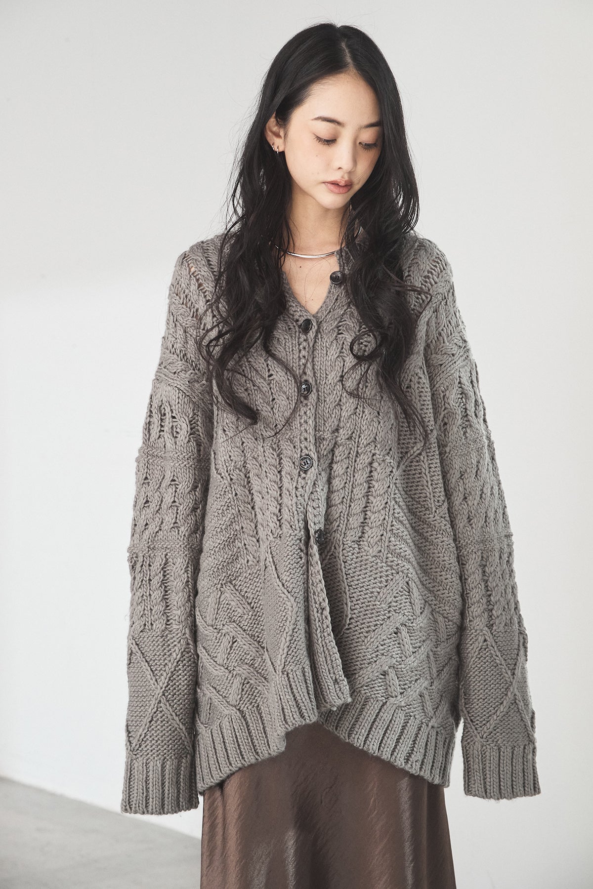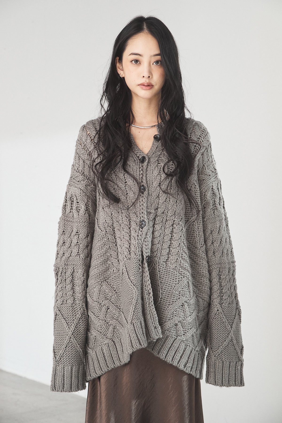 異なる編み柄を組み合わせた、表情豊かなニットカーディガン。立体感のある編地が奥行きを生み、羽織るだけで存在感のあるスタイリングに仕上がります。ゆったりとしたシルエットでリラックス感がありながら、ボタンデザインが全体を程よく引き締めるバランスに。パンツにもスカートにも合わせやすく、季節感を楽しめる一枚です。