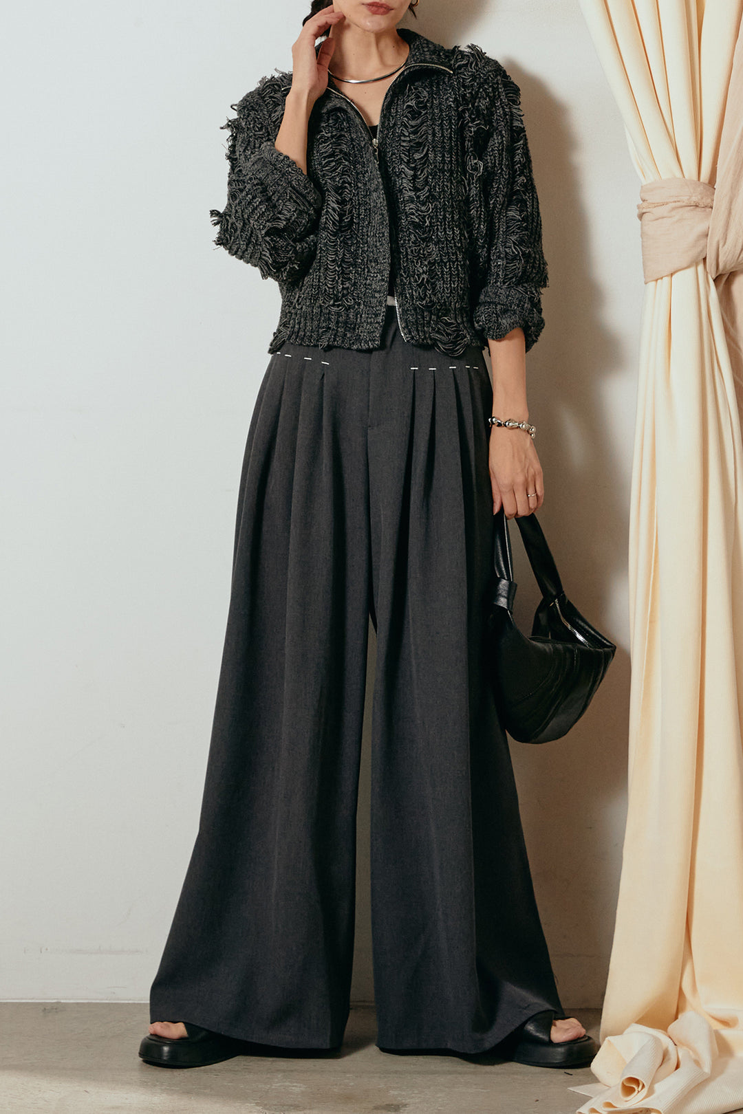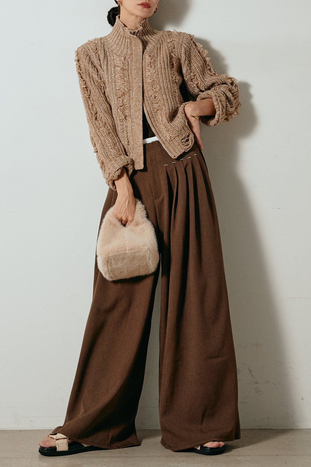 [SET]ハイネックフリンジジップニットトップス+ウエストステッチデザインワイドスラックス(2set)