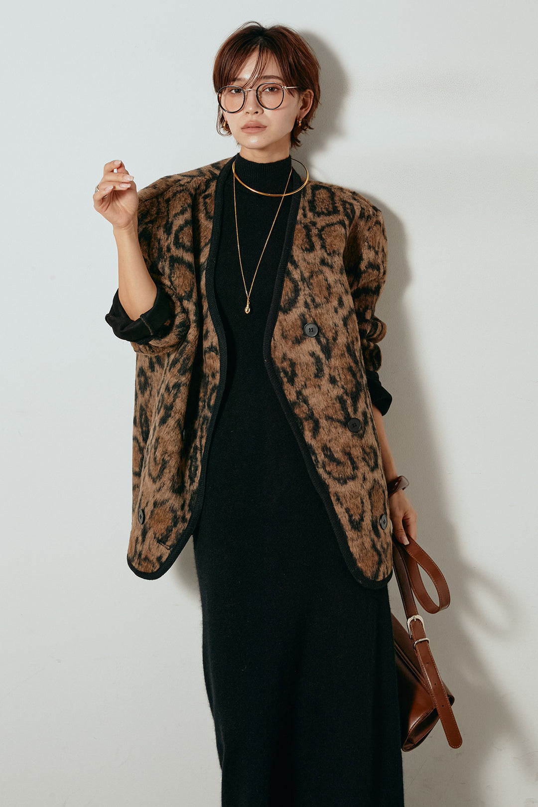 [SET]ノーカラーレオパード柄アウター+ノースリーブニットロングワンピース(2set)