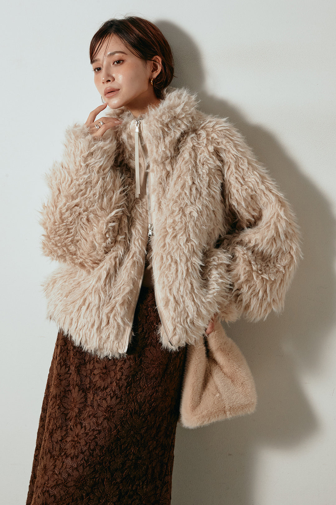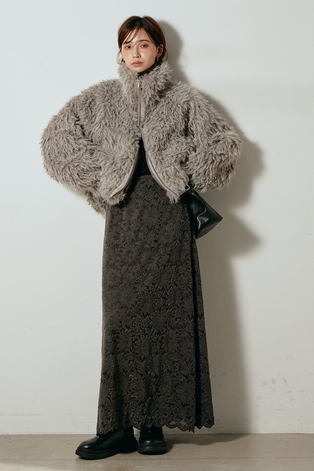 [SET]ミックスシープファースタンドブルゾン+花柄刺繍ベロアフレアスカート(2set)