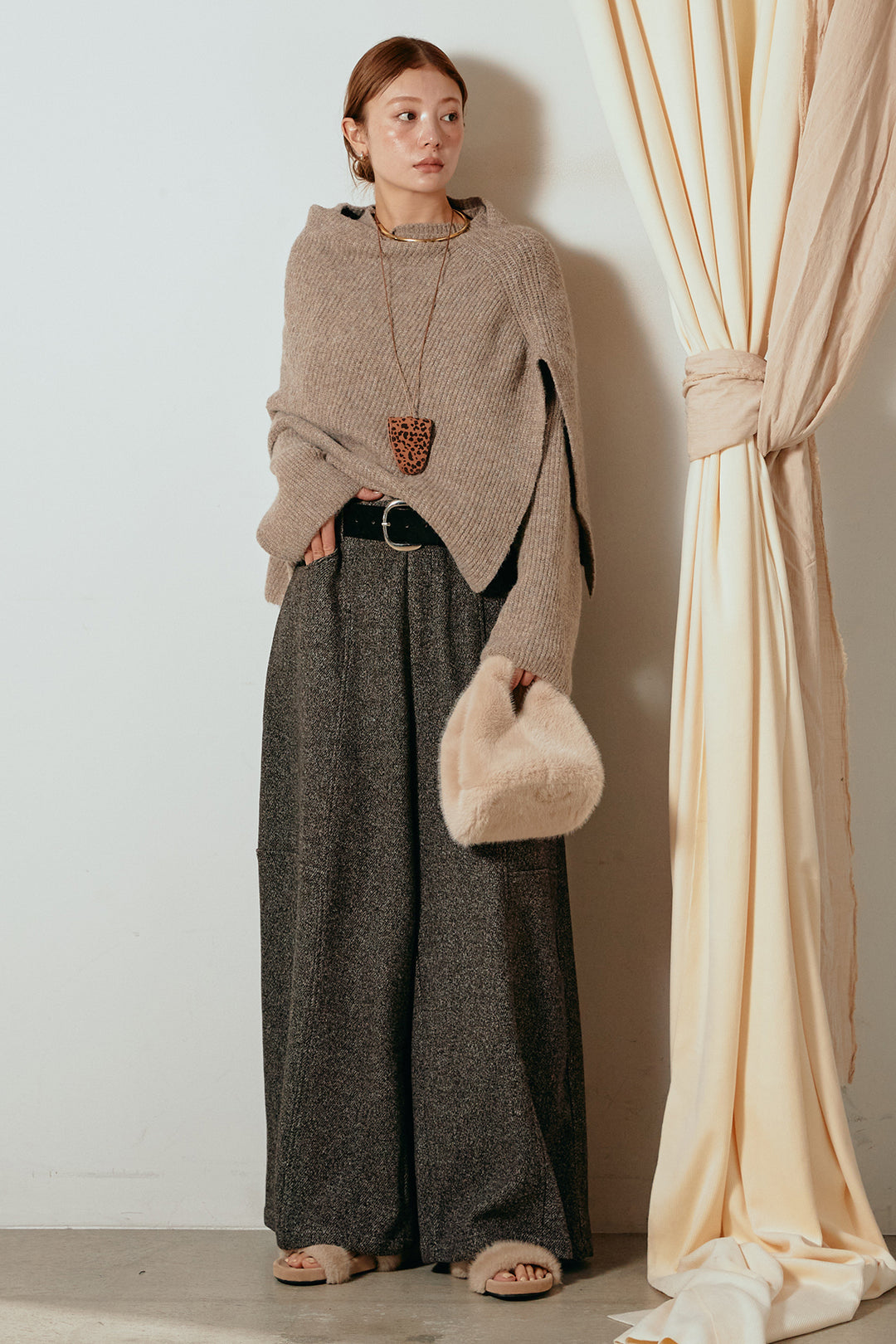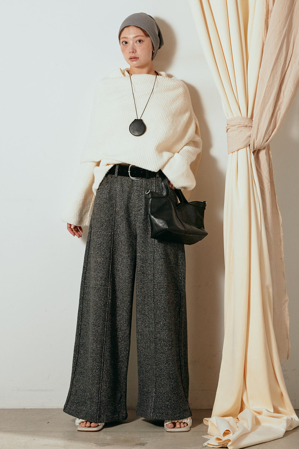 [SET]ケープデザインリブニットトップス+太ベルト付きツイードワイドパンツ(2set)