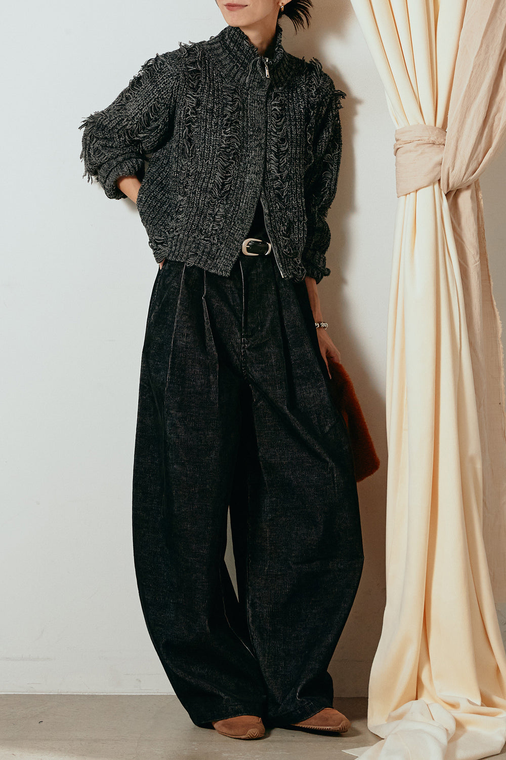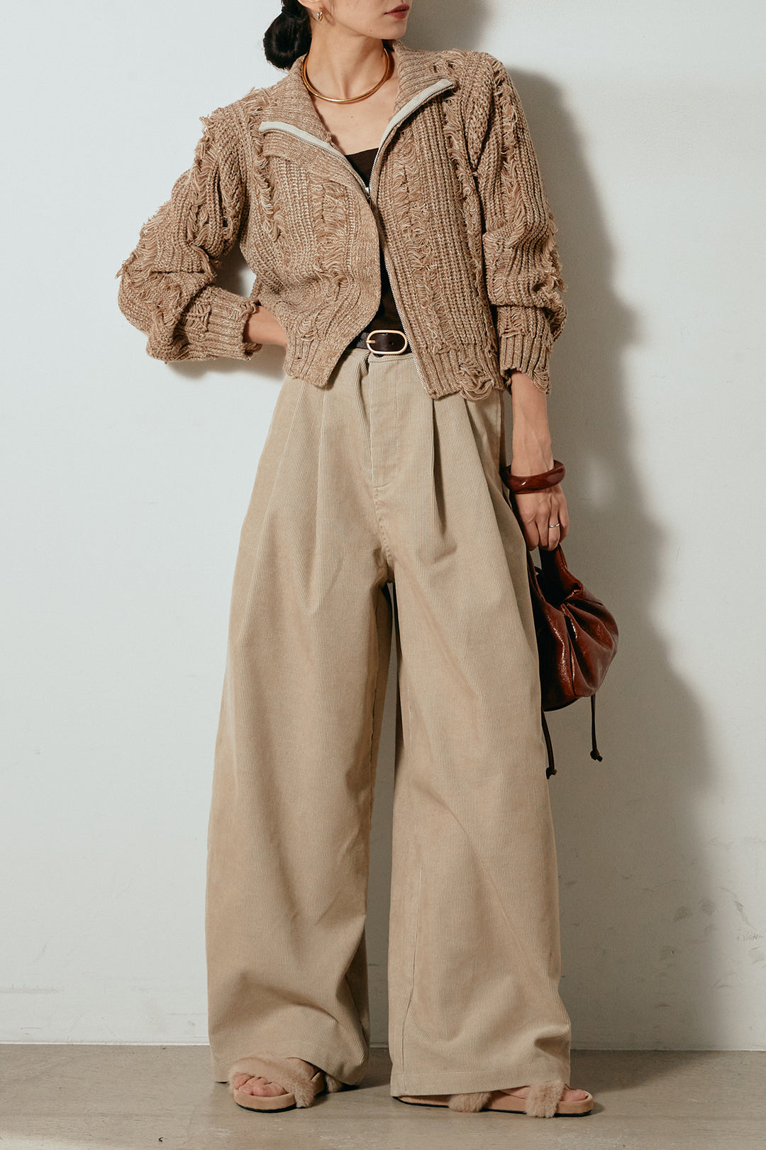 [SET]シャギージャガードニットトップス+太ベルト付きコーデュロイタックパンツ(2set)