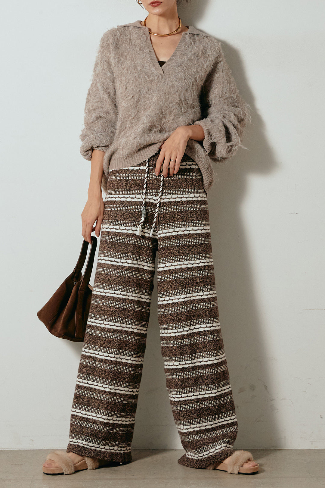 [SET]襟付きシャギーニットポロトップス+マルチライン柄リラックスニットパンツ(2set)
