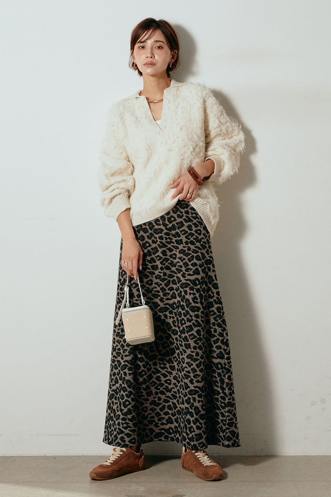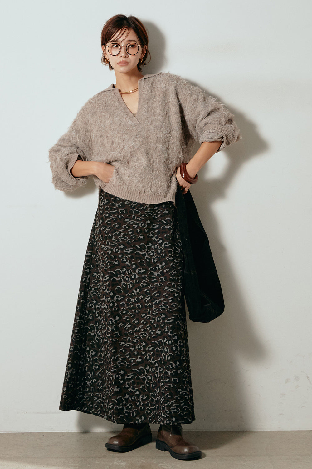 [SET]襟付きシャギーニットポロトップス+レオパードロングスカート(2set)