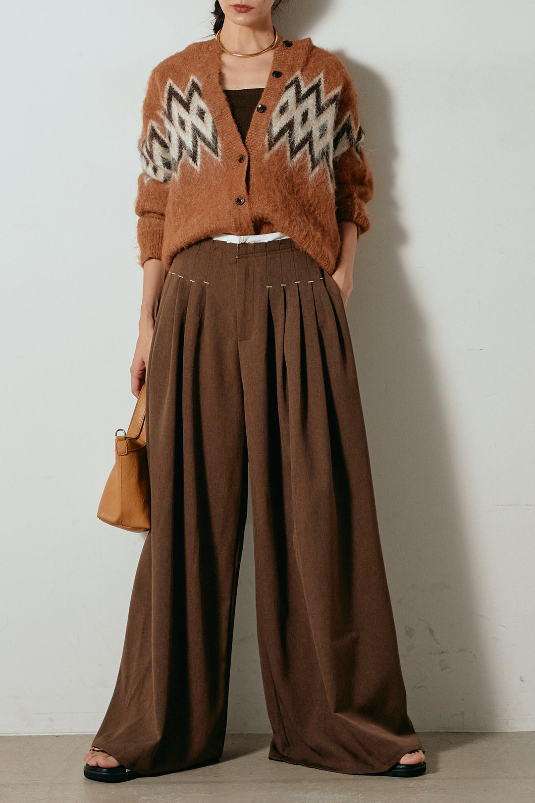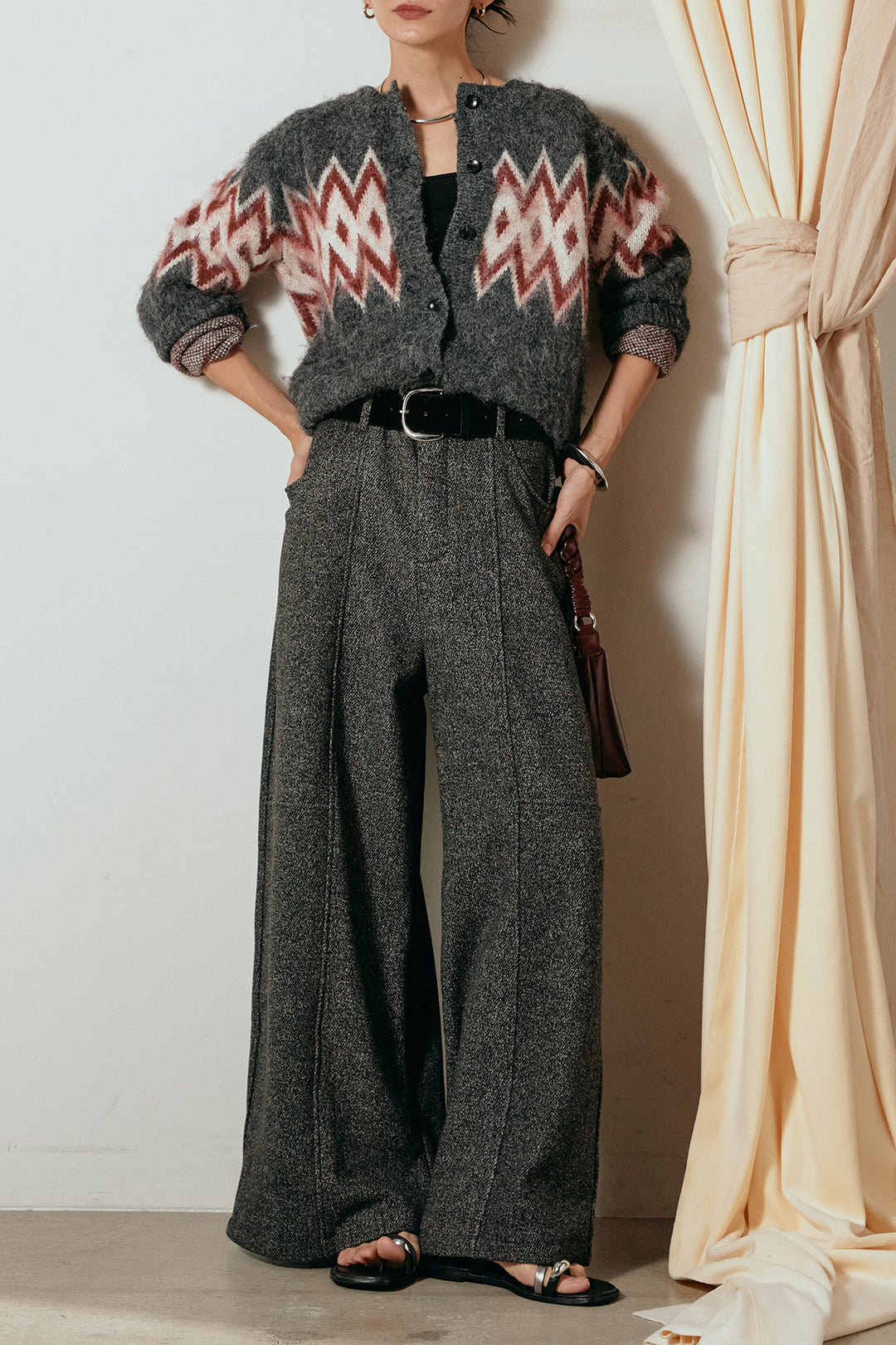 [SET]起毛ノルディック柄ニットカーディガン+太ベルト付きツイードワイドパンツ(2set)