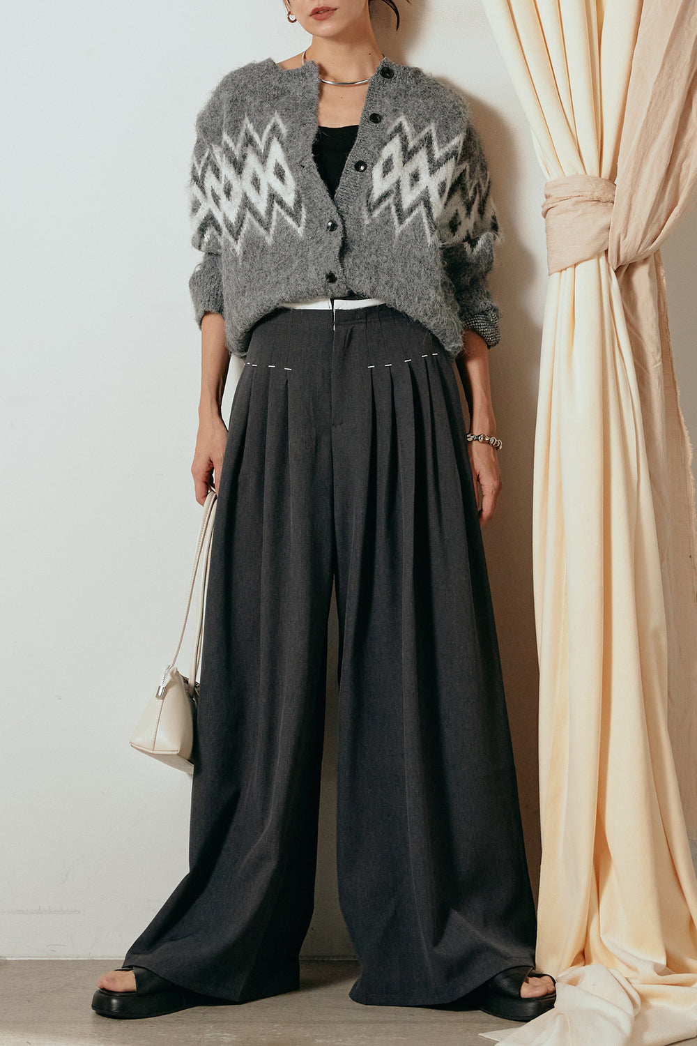 [SET]起毛ノルディック柄ニットカーディガン+ウエストステッチデザインワイドスラックス(2set)