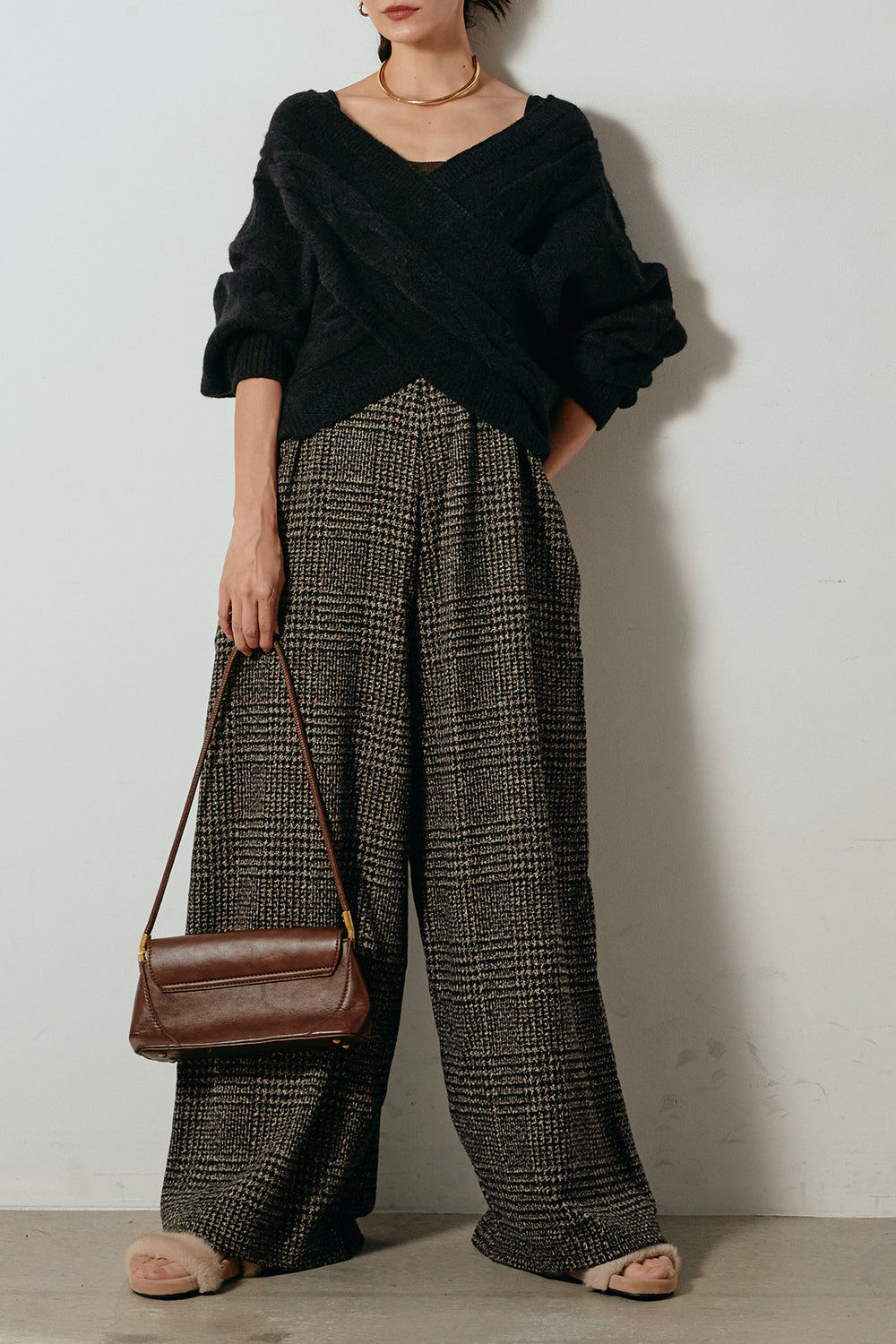 [SET]襟付きシャギーニットポロトップス+タータンチェック柄タックパンツ(2set)
