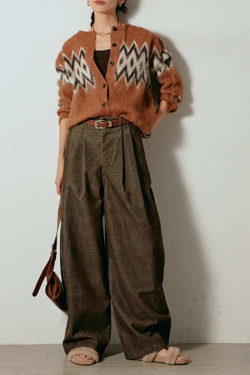 [SET]起毛ノルディック柄ニットカーディガン+フロントタック入りコーデュロイパンツ(2set)