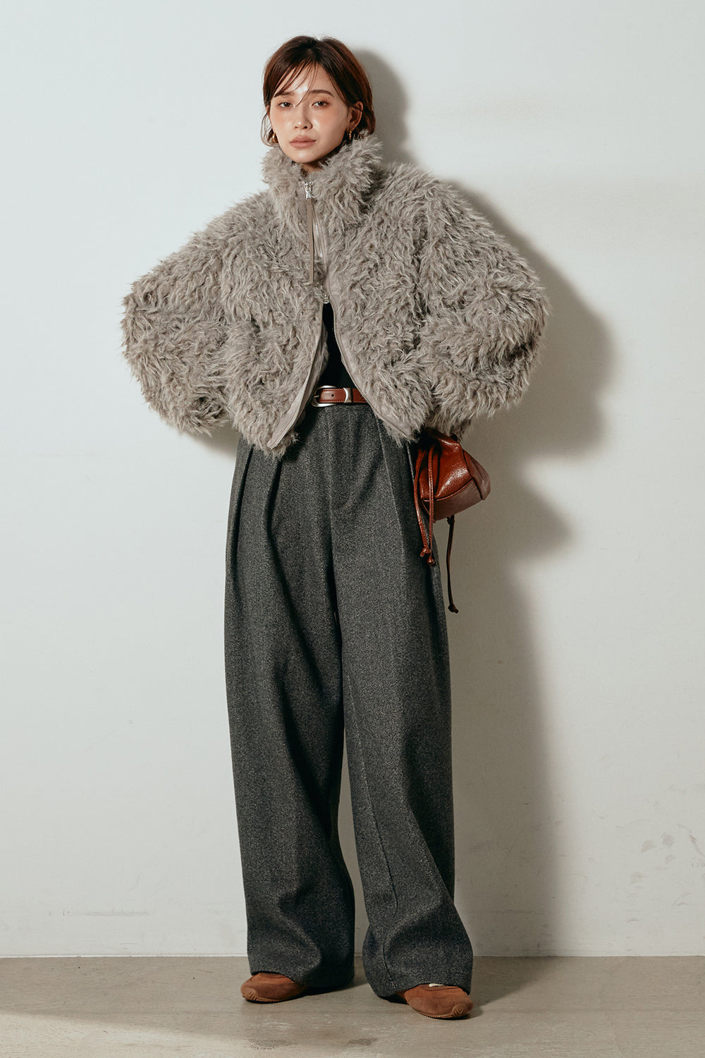 [SET]ミックスシープファースタンドブルゾン+フェイクウールタックトラウザーズパンツ(2set)