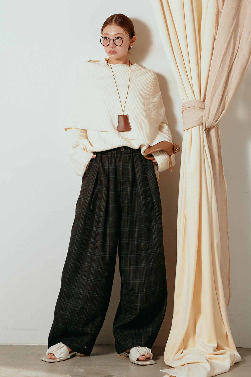[SET]ケープデザインリブニットトップス+タータンチェック柄タックパンツ(2set)