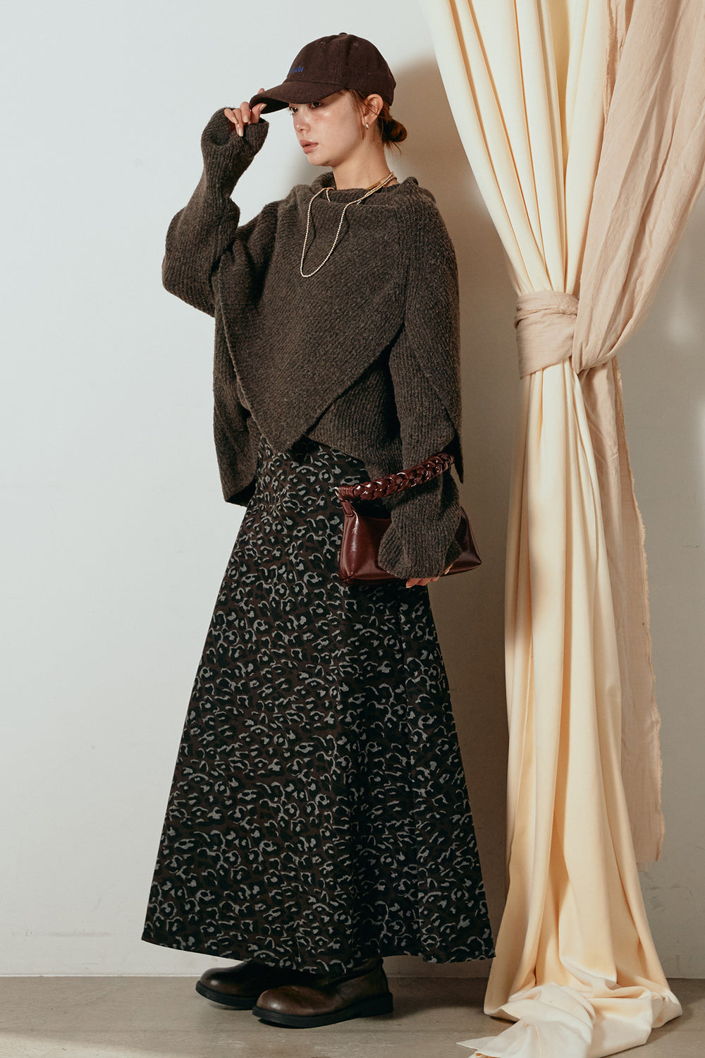 [SET]ケープデザインリブニットトップス+レオパードロングスカート(2set)