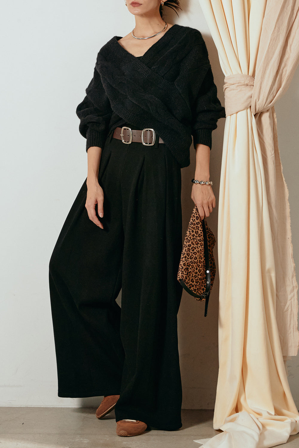 [SET]ケーブルカシュクールニットトップス+フェイクレザー太ベルト付きタックワイドパンツ(2set)