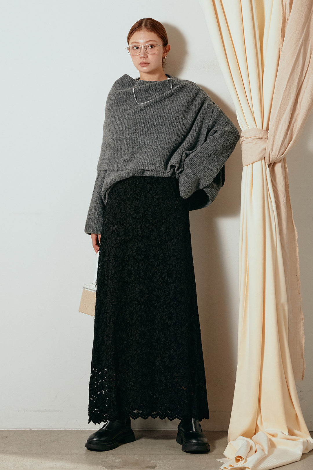 [SET]ミックスニットポケットカーディガン+紐付きフェイクレザーワイドスカート(2set)