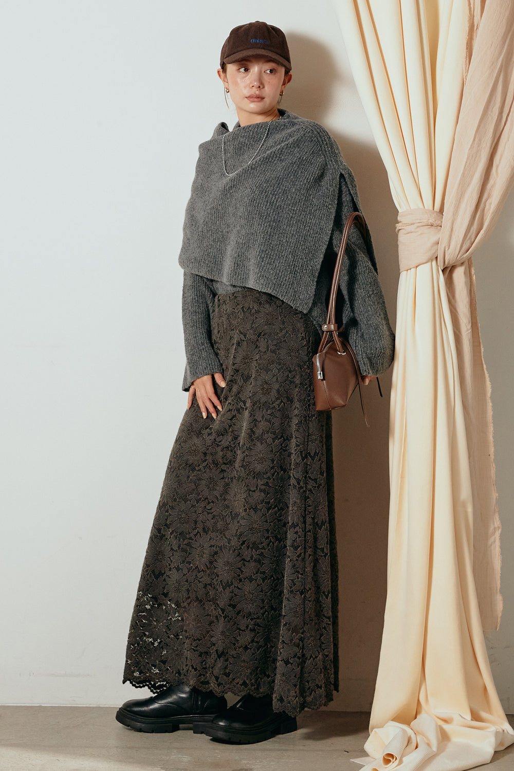 [SET]ケープデザインリブニットトップス+花柄刺繍ベロアフレアスカート(2set)