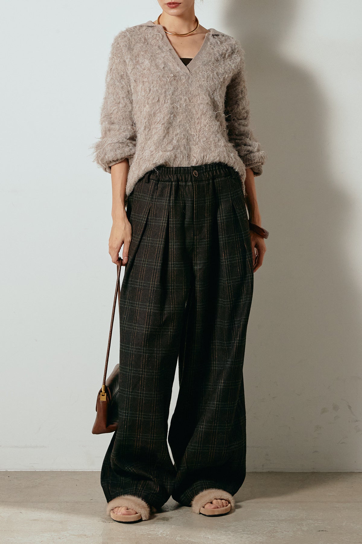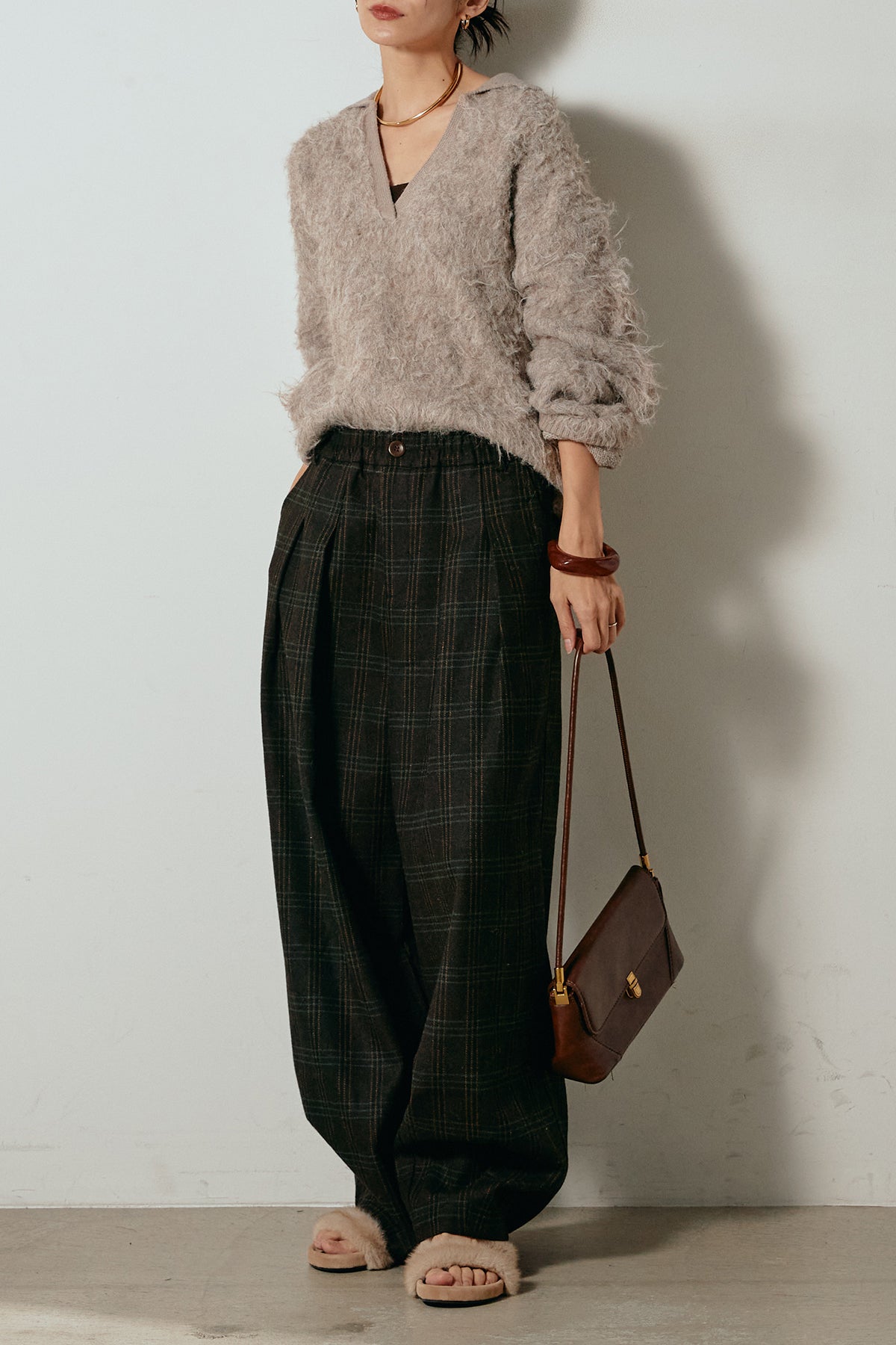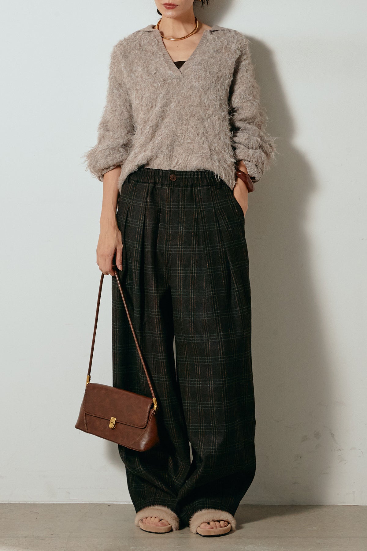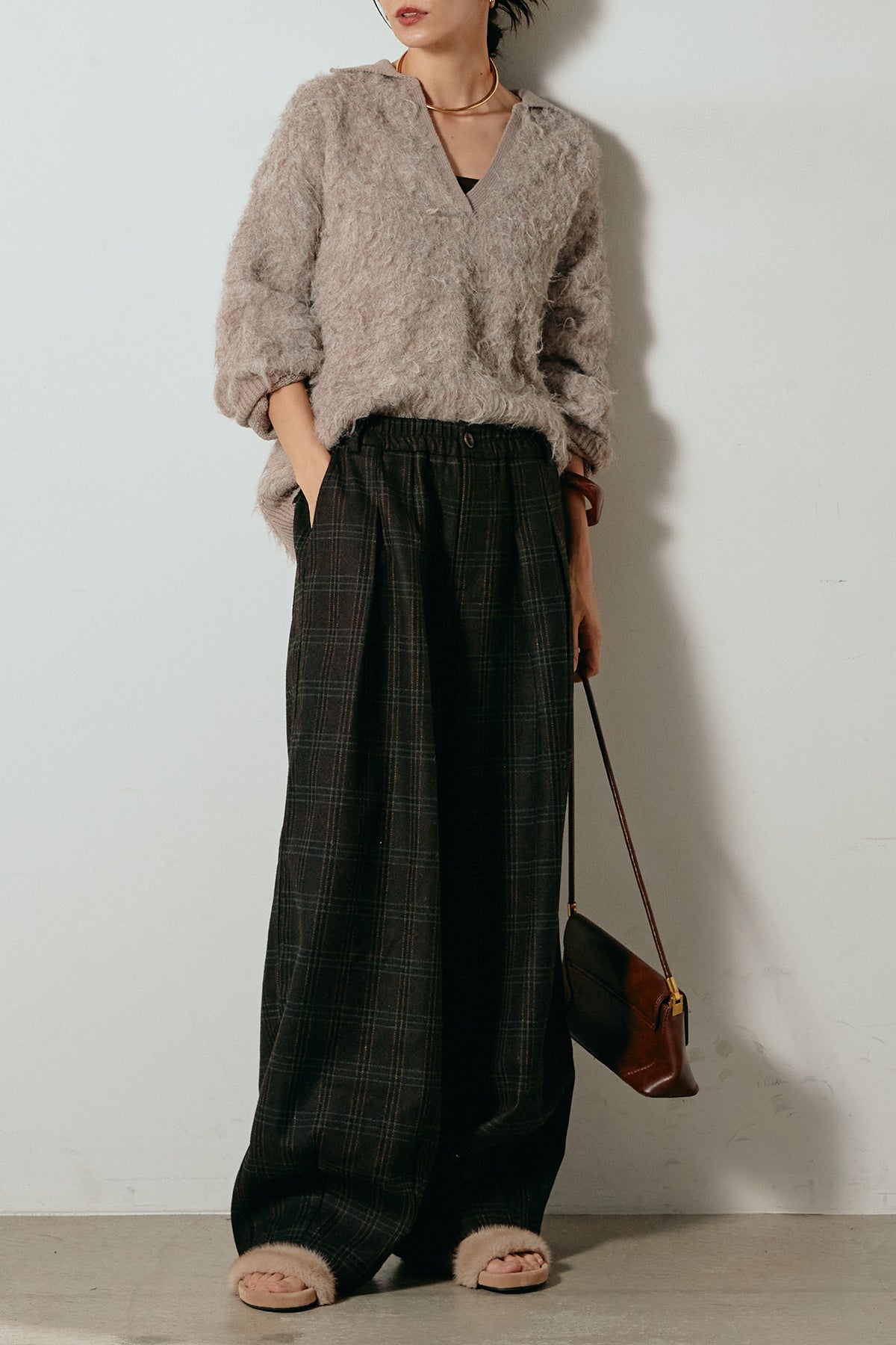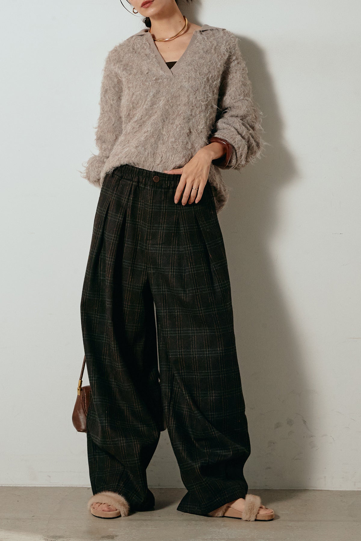 [SET]襟付きシャギーニットポロトップス+タータンチェック柄タックパンツ(2set)