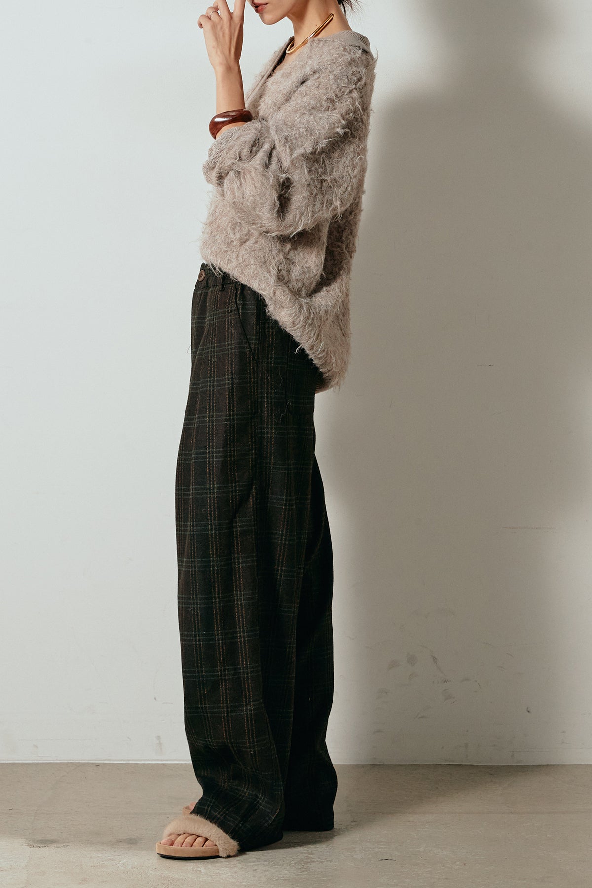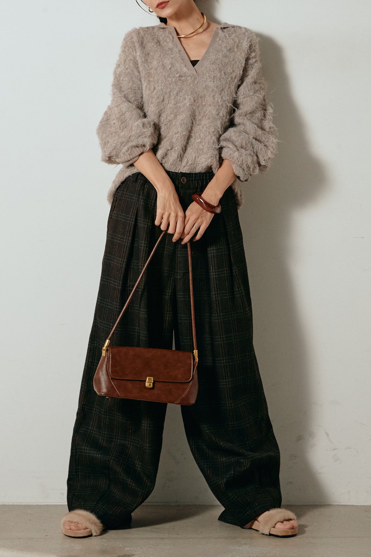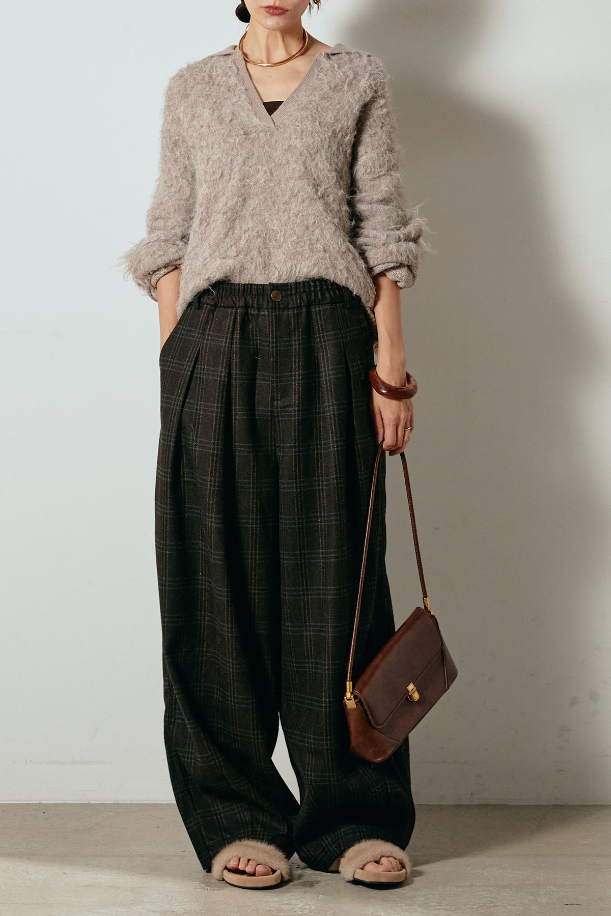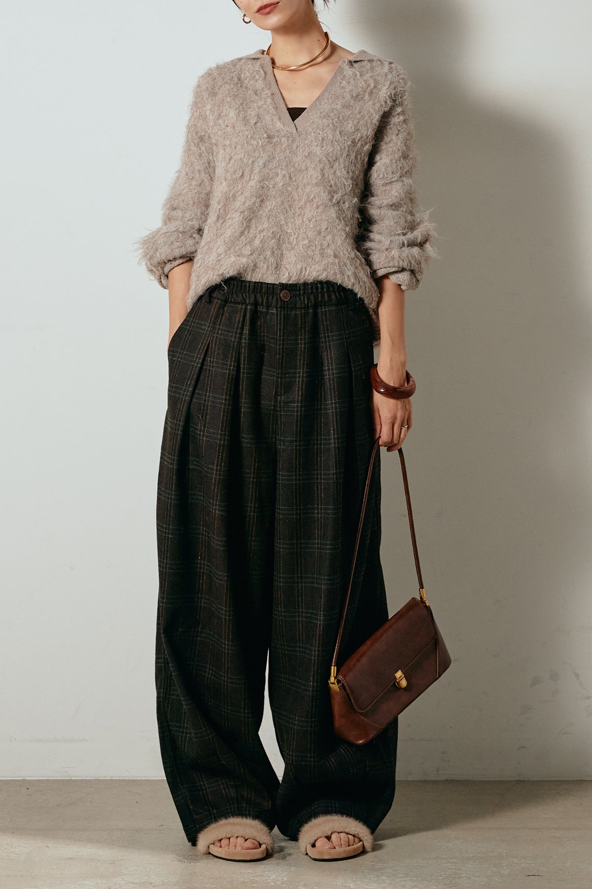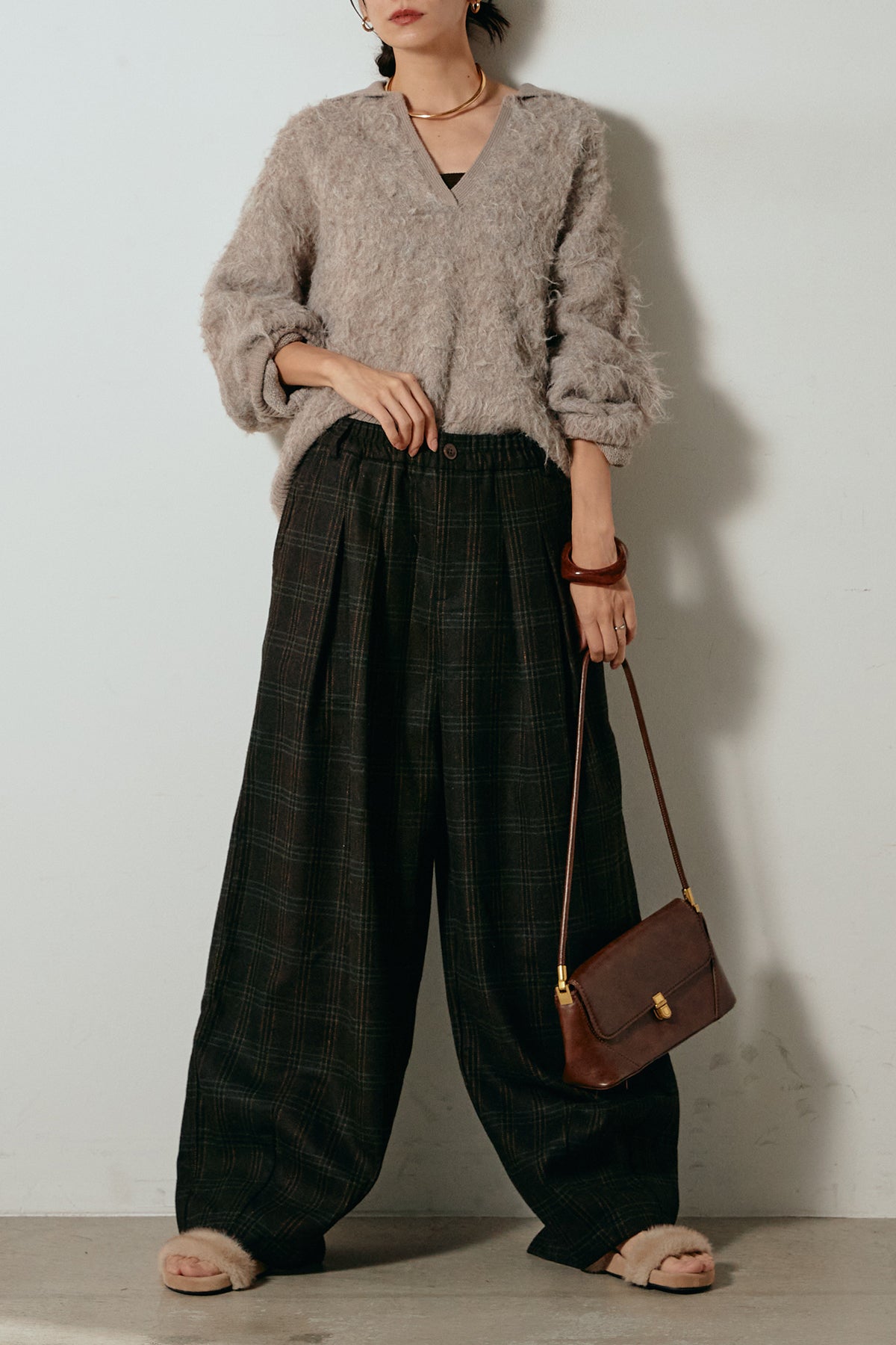 [SET]襟付きシャギーニットポロトップス+タータンチェック柄タックパンツ(2set)