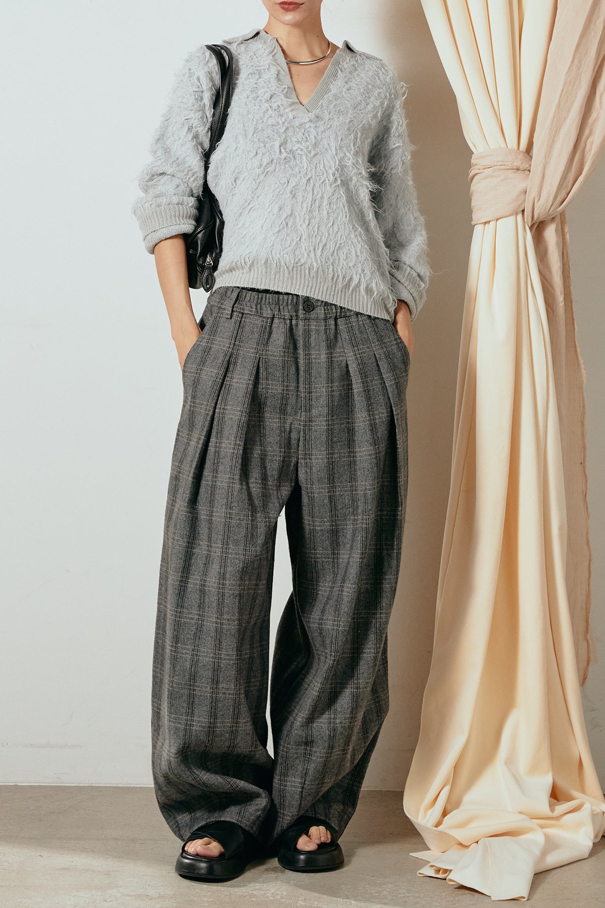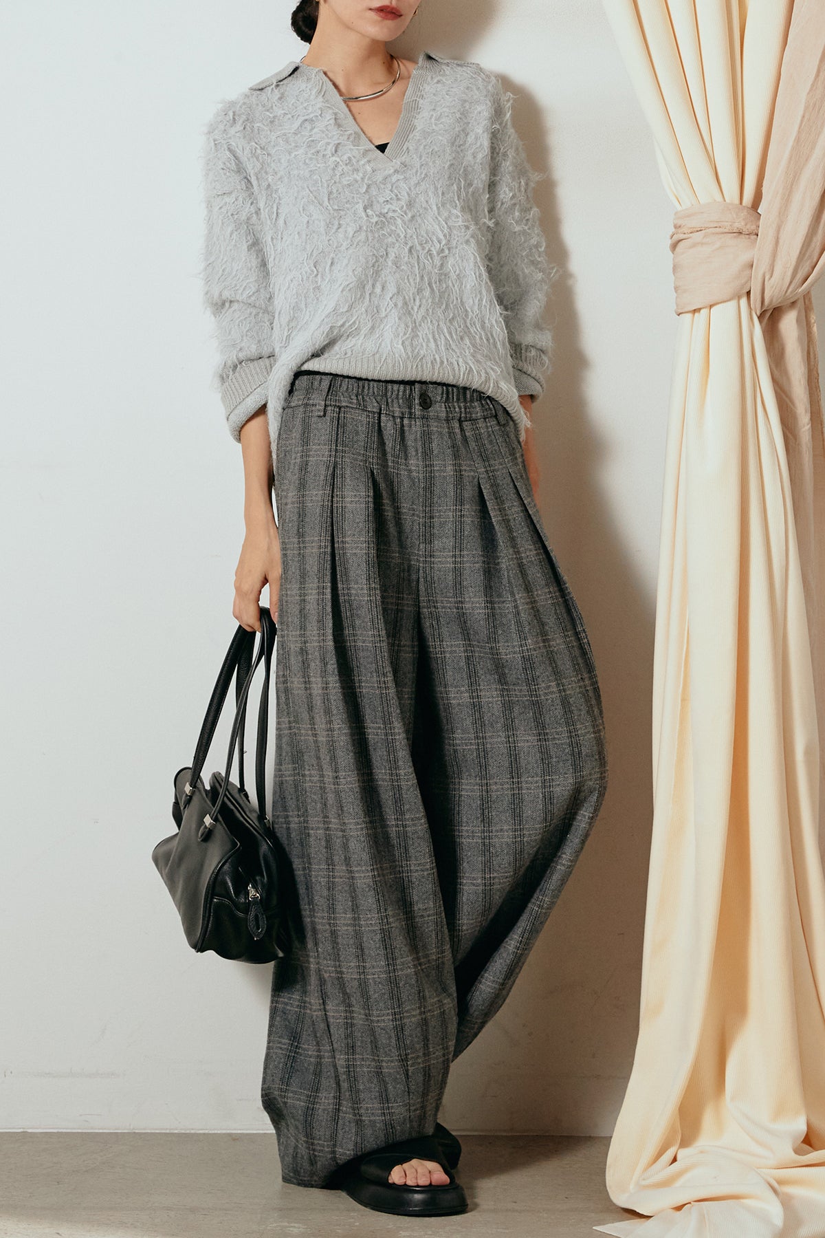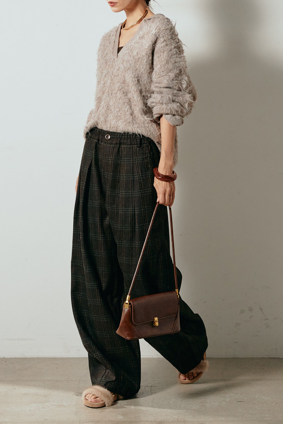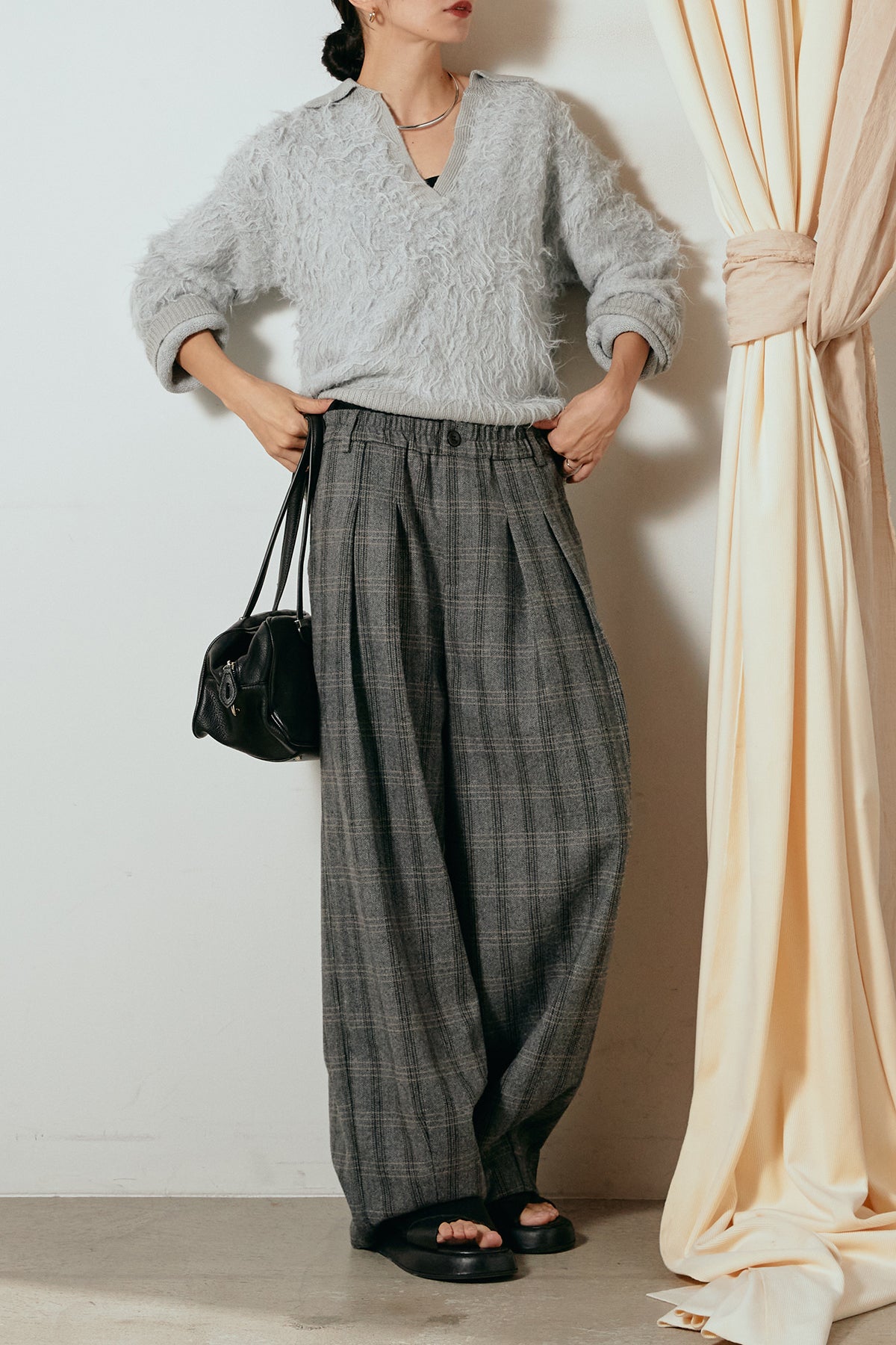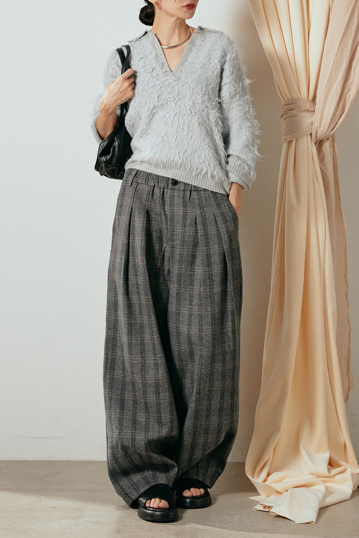 [SET]襟付きシャギーニットポロトップス+タータンチェック柄タックパンツ(2set)