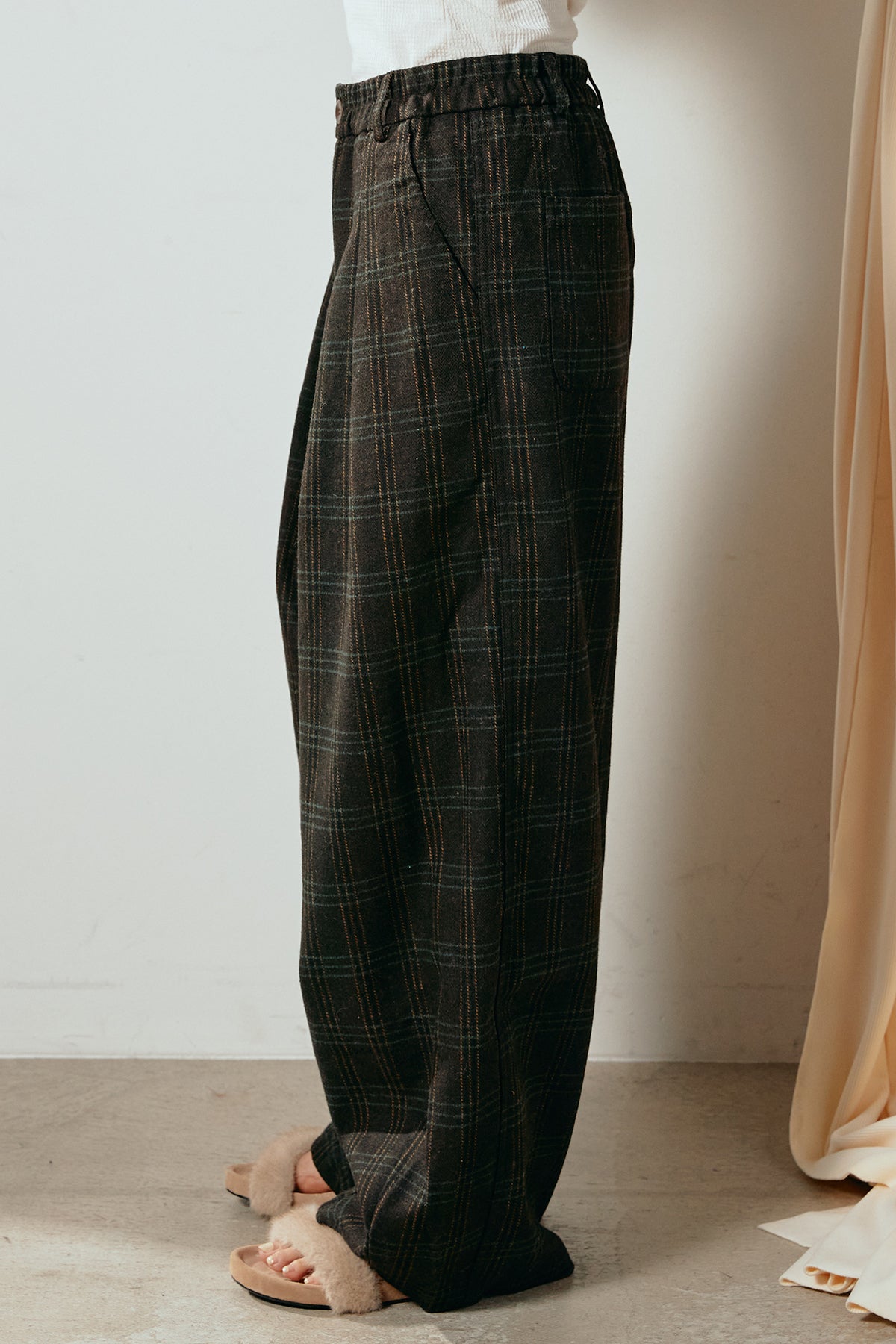クラシックな雰囲気漂うタータンチェック柄タックパンツ。 ウエストに施されたタックが立体感を生み、ゆとりのあるワイドシルエットでこなれた印象に。 落ち着いた配色のチェック柄がシーズンムードを高め、ニットやシャツとの相性も抜群です。 ウエスト後ろはゴム仕様で、リラックス感のある穿き心地も魅力。
