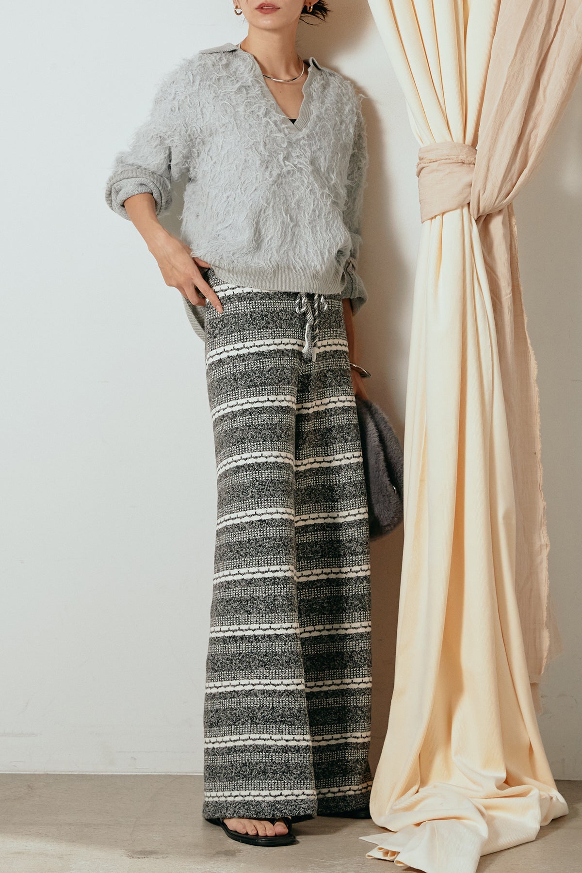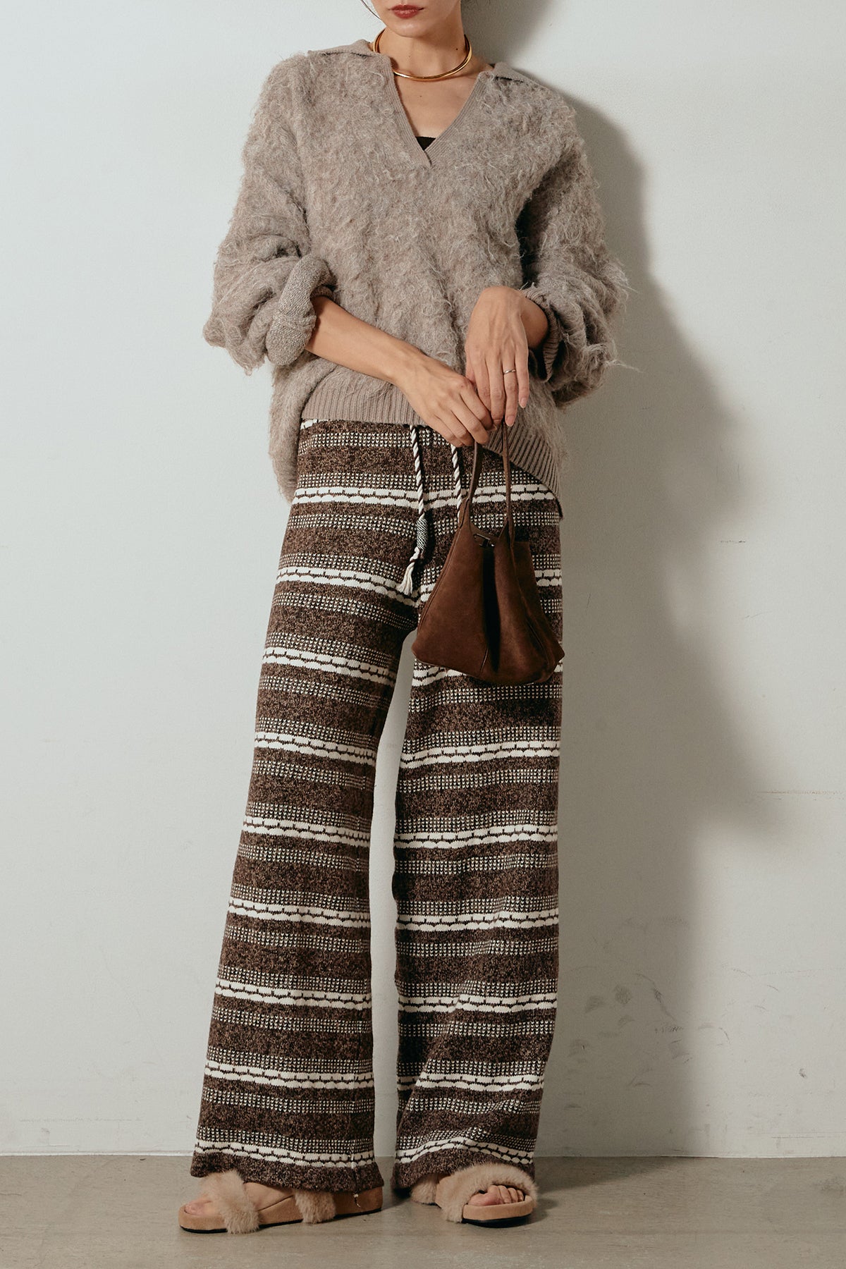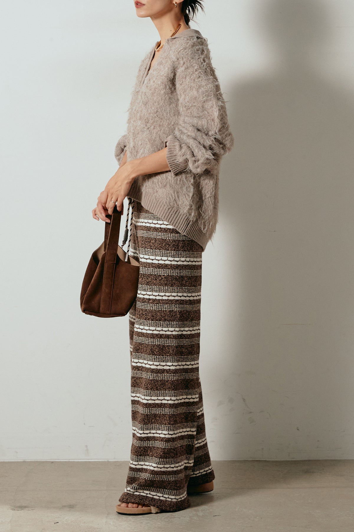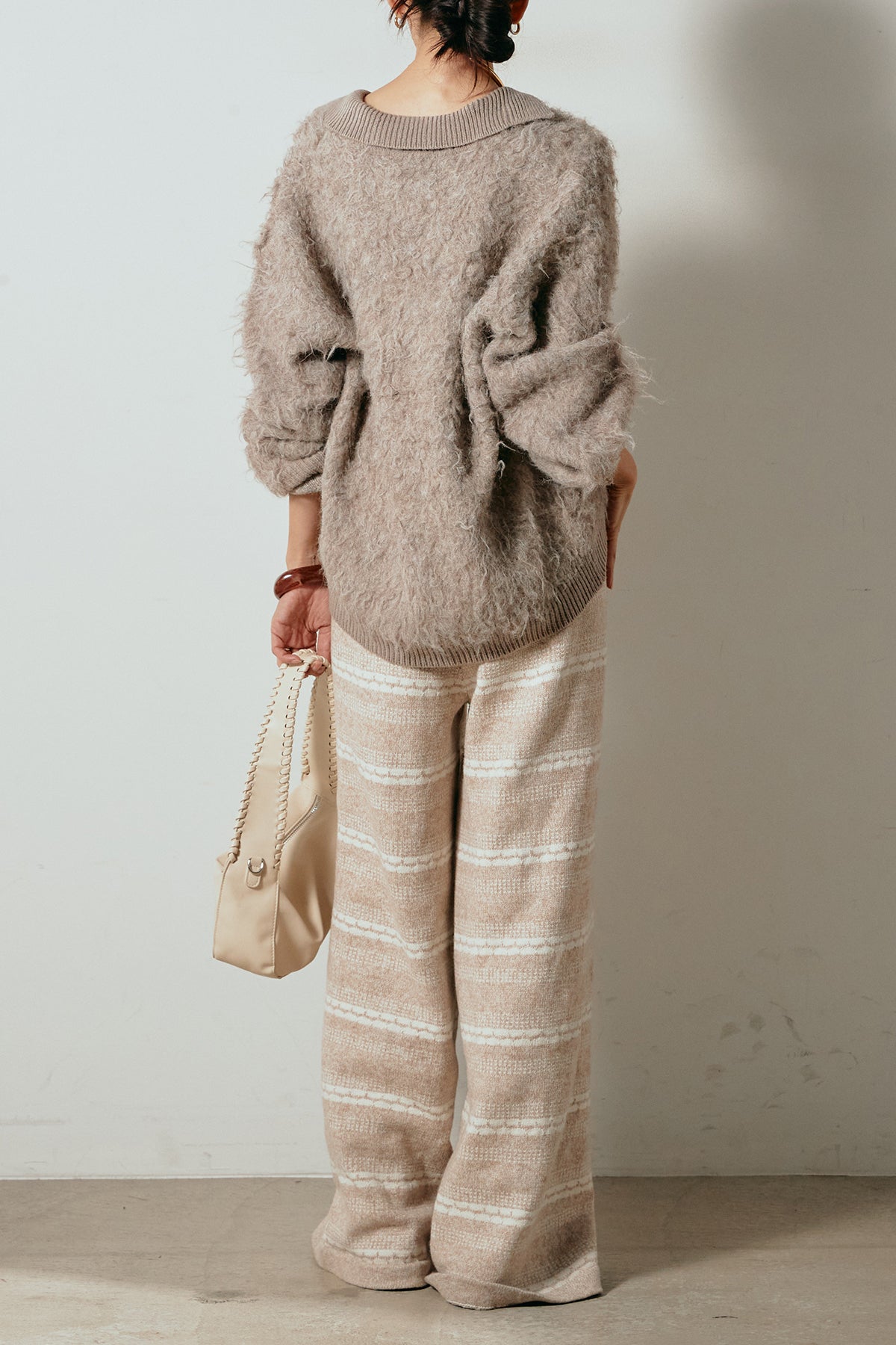 [SET]襟付きシャギーニットポロトップス+マルチライン柄リラックスニットパンツ(2set)