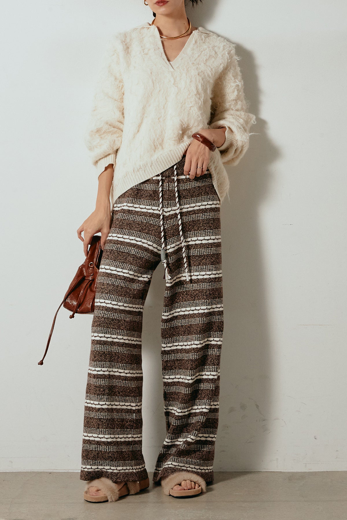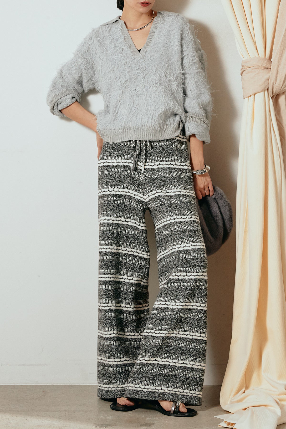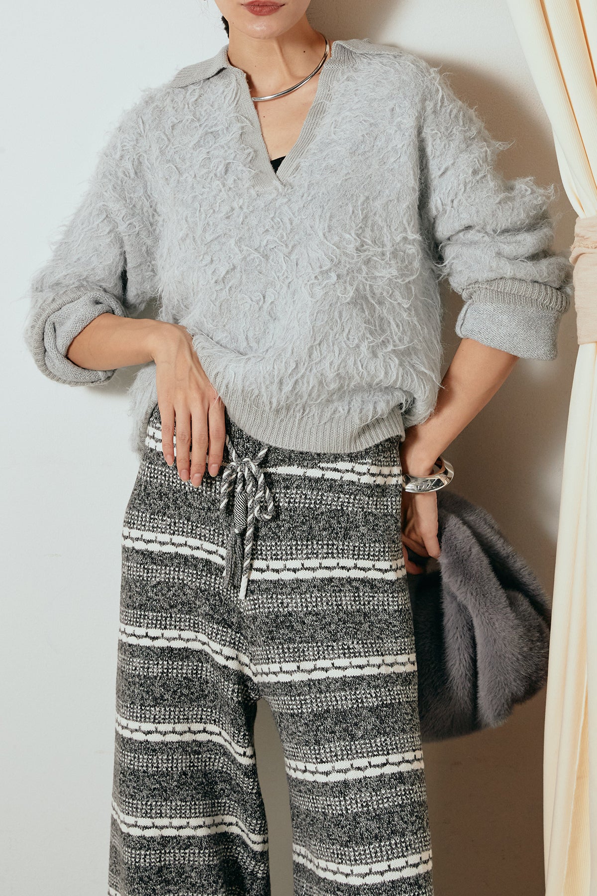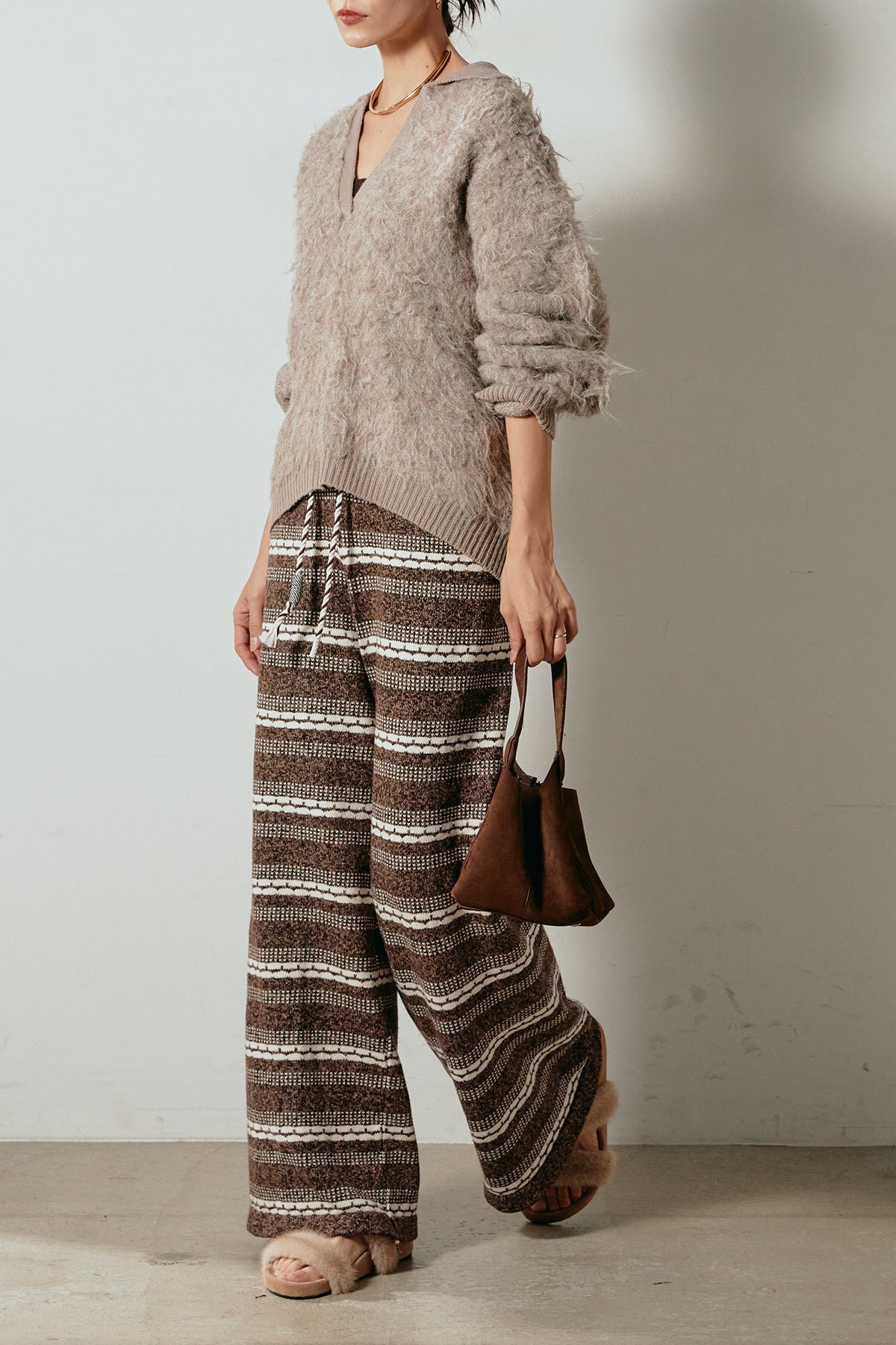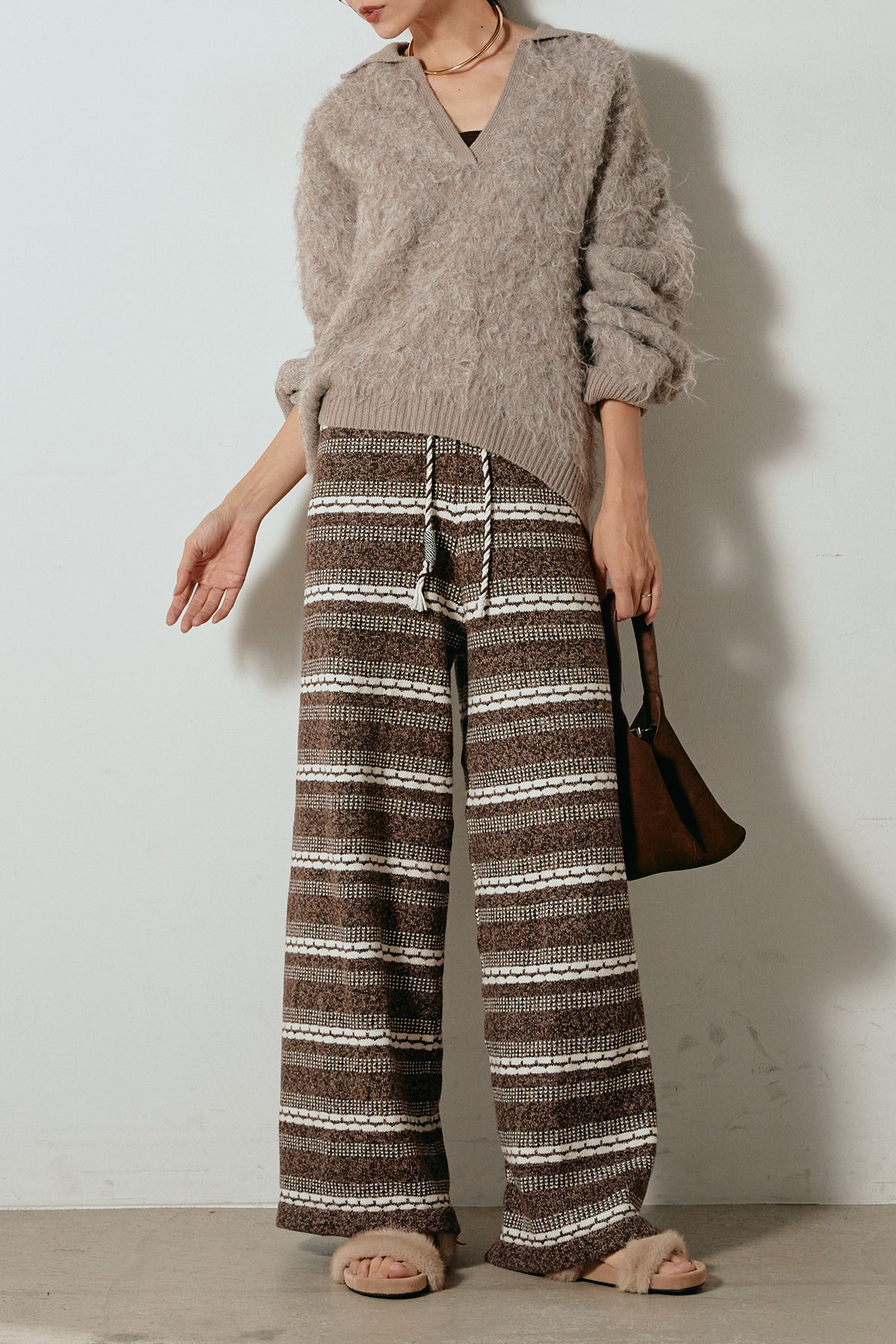 [SET]襟付きシャギーニットポロトップス+マルチライン柄リラックスニットパンツ(2set)
