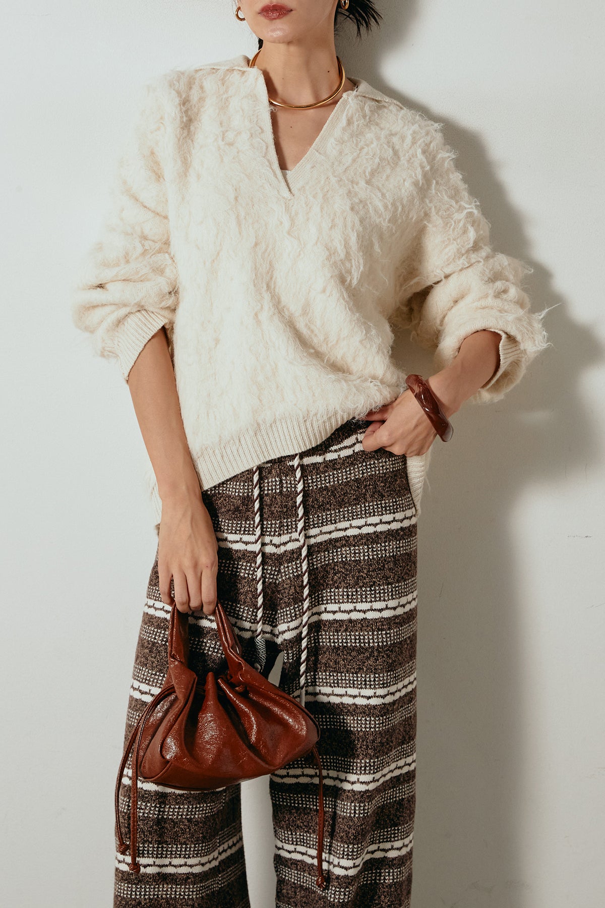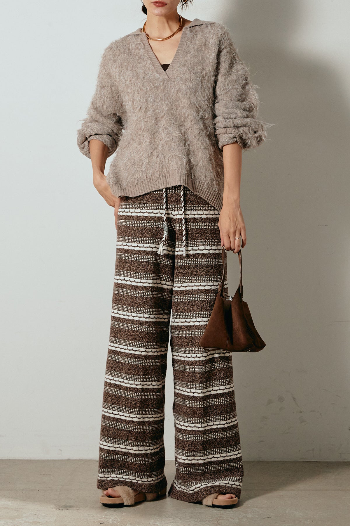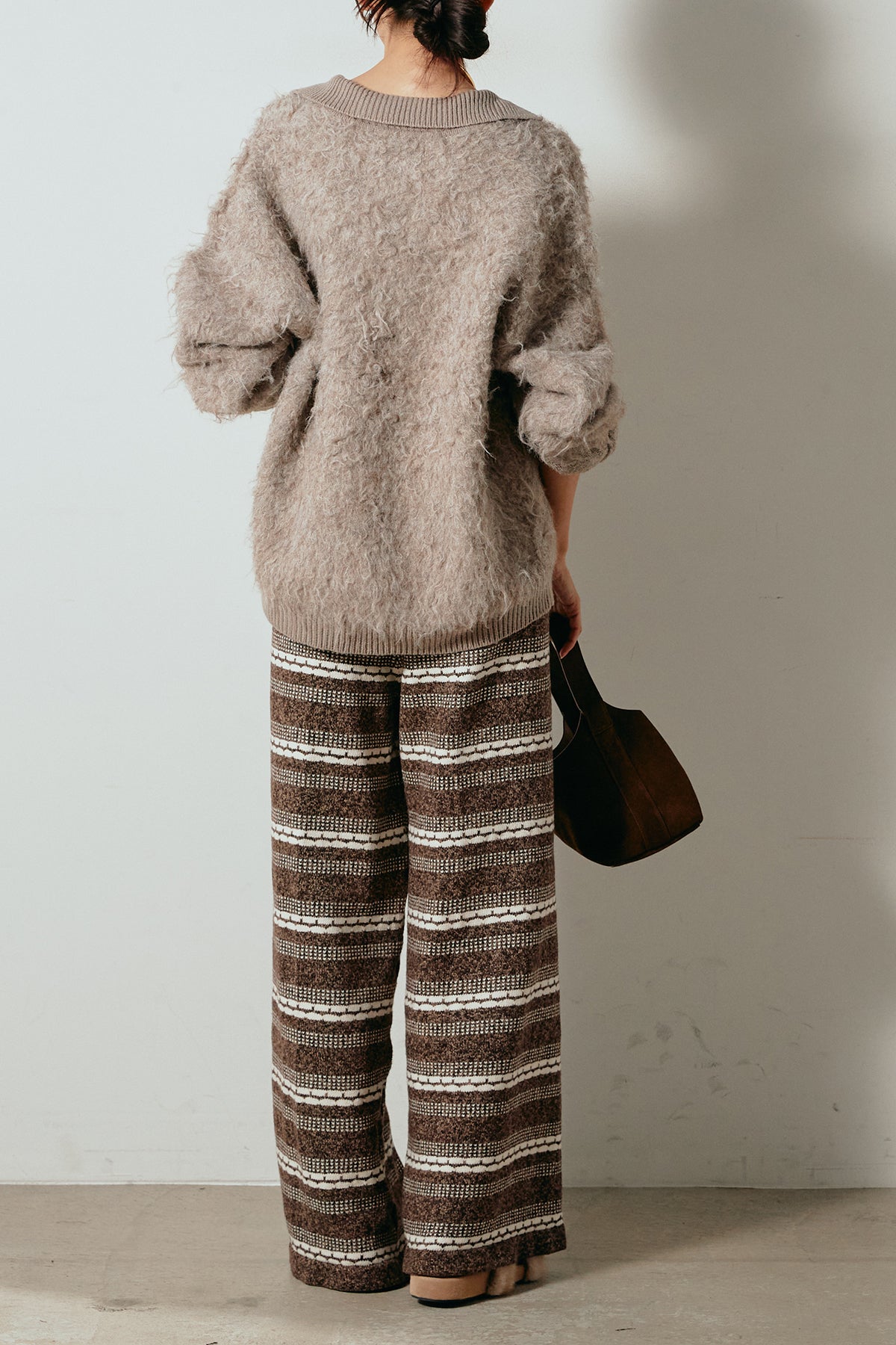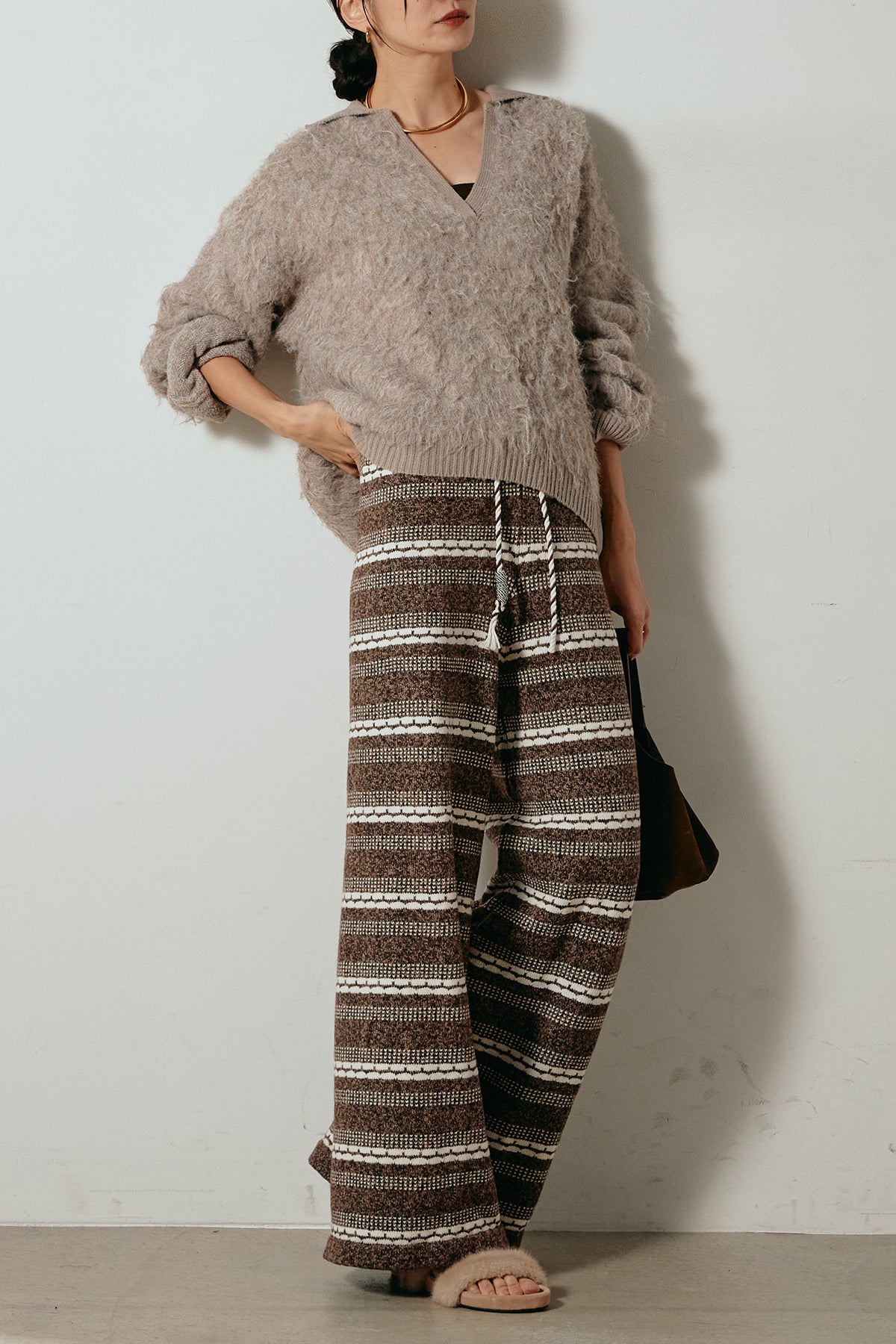 [SET]襟付きシャギーニットポロトップス+マルチライン柄リラックスニットパンツ(2set)