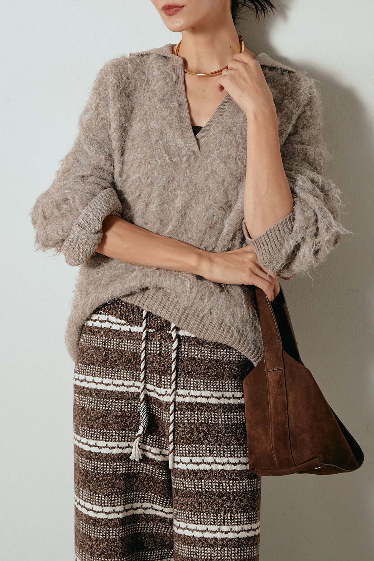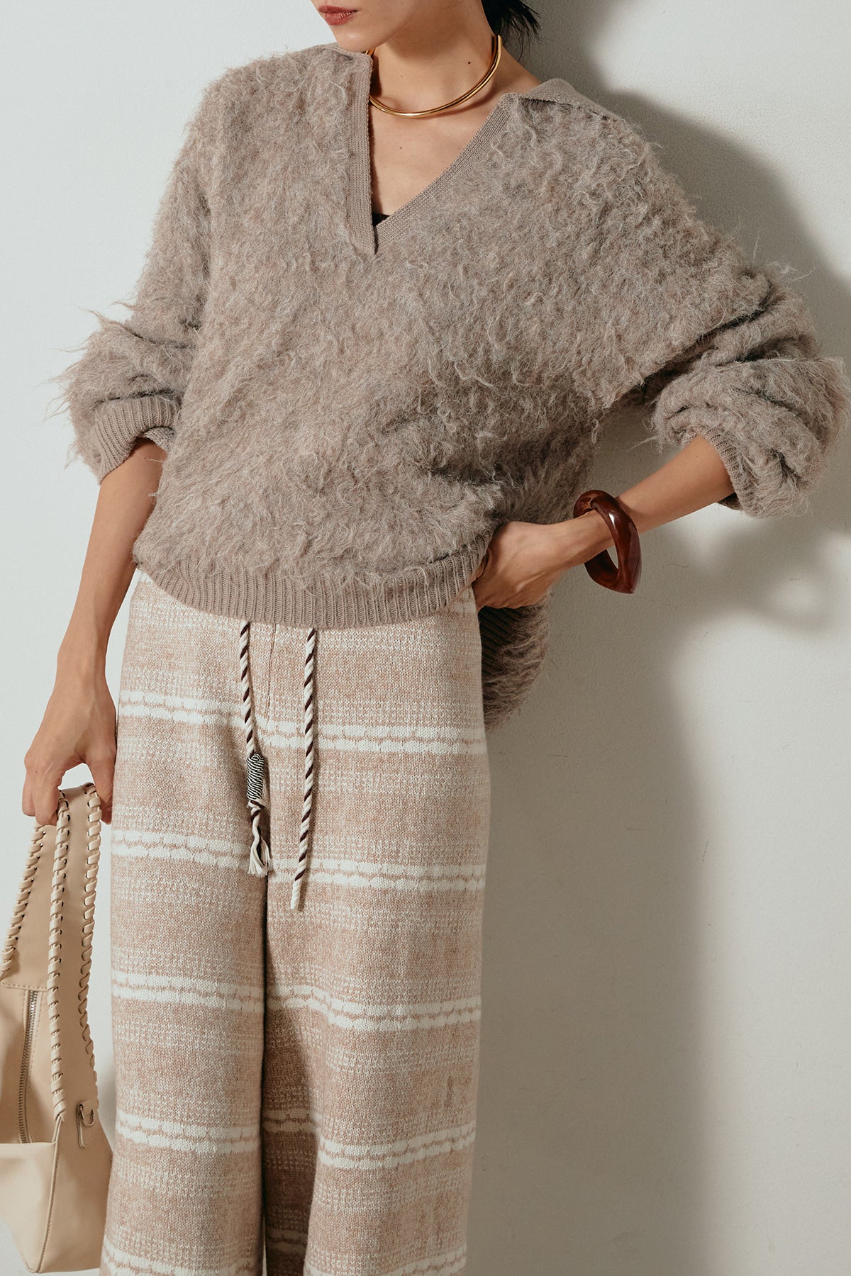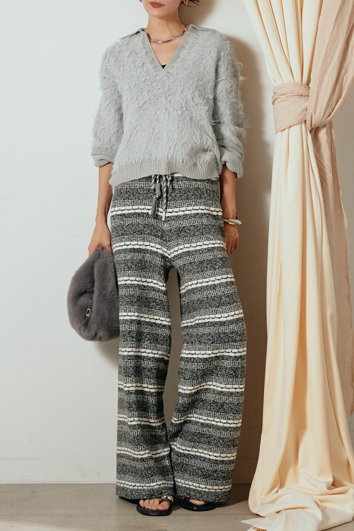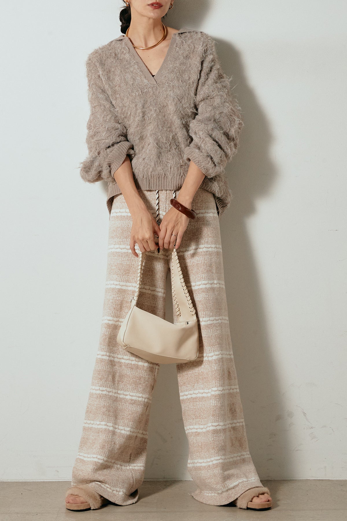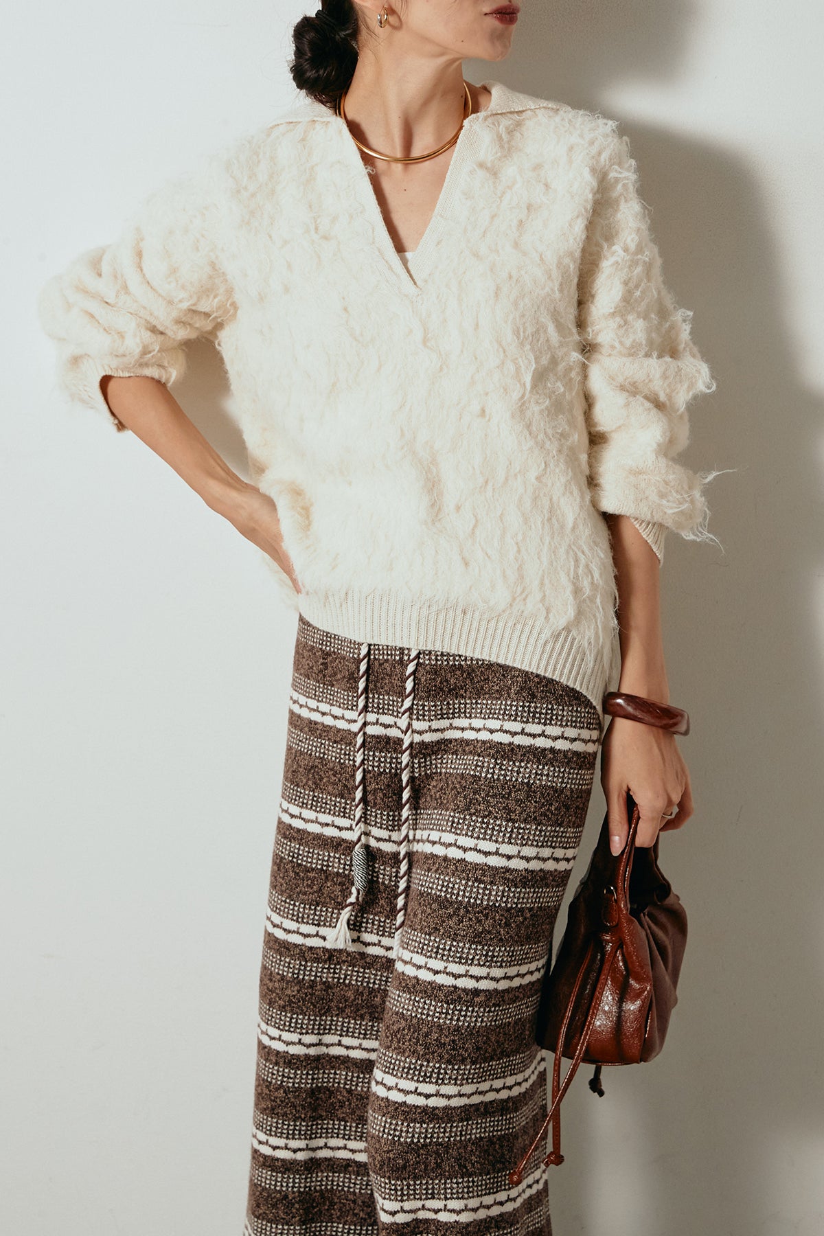 [SET]襟付きシャギーニットポロトップス+マルチライン柄リラックスニットパンツ(2set)