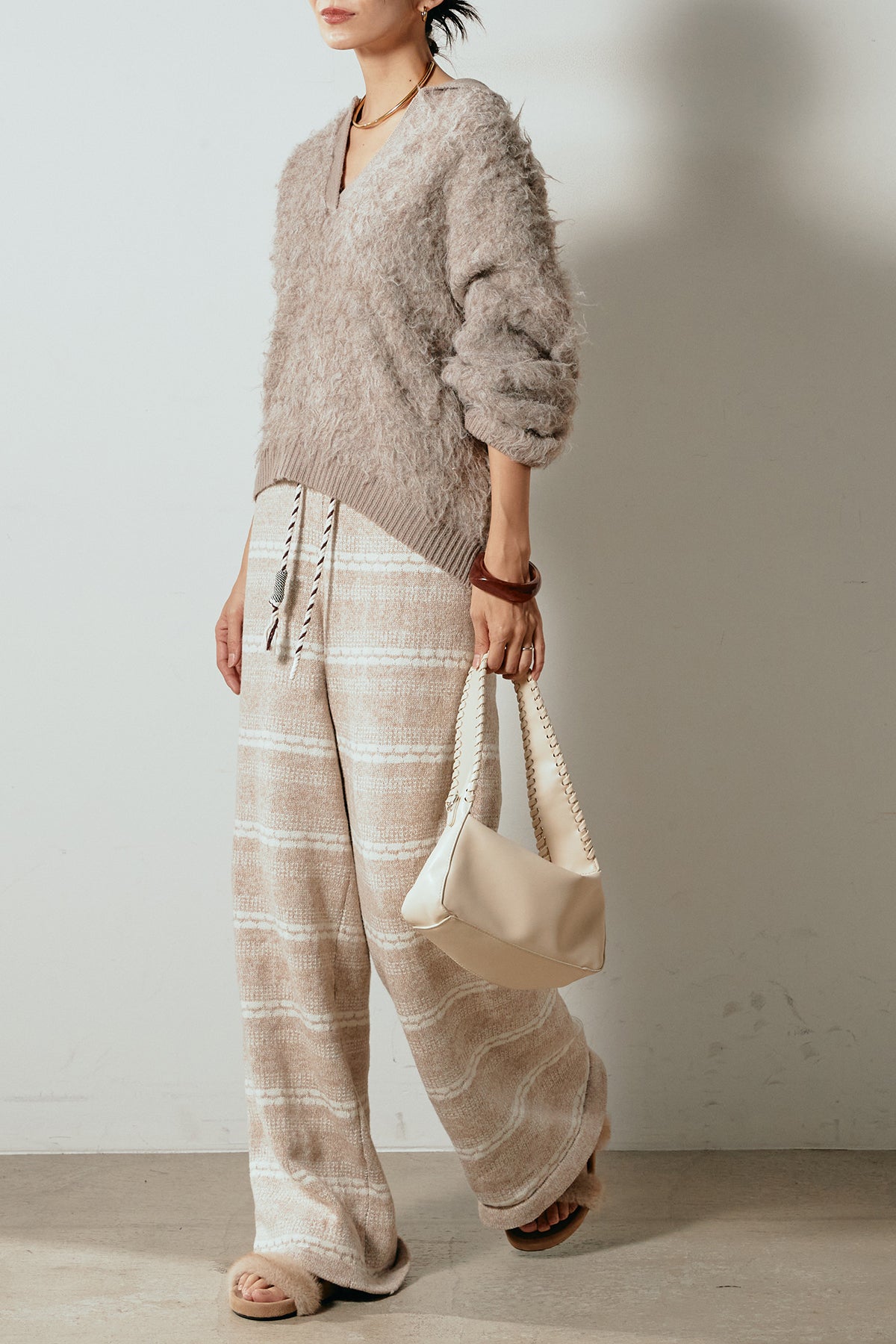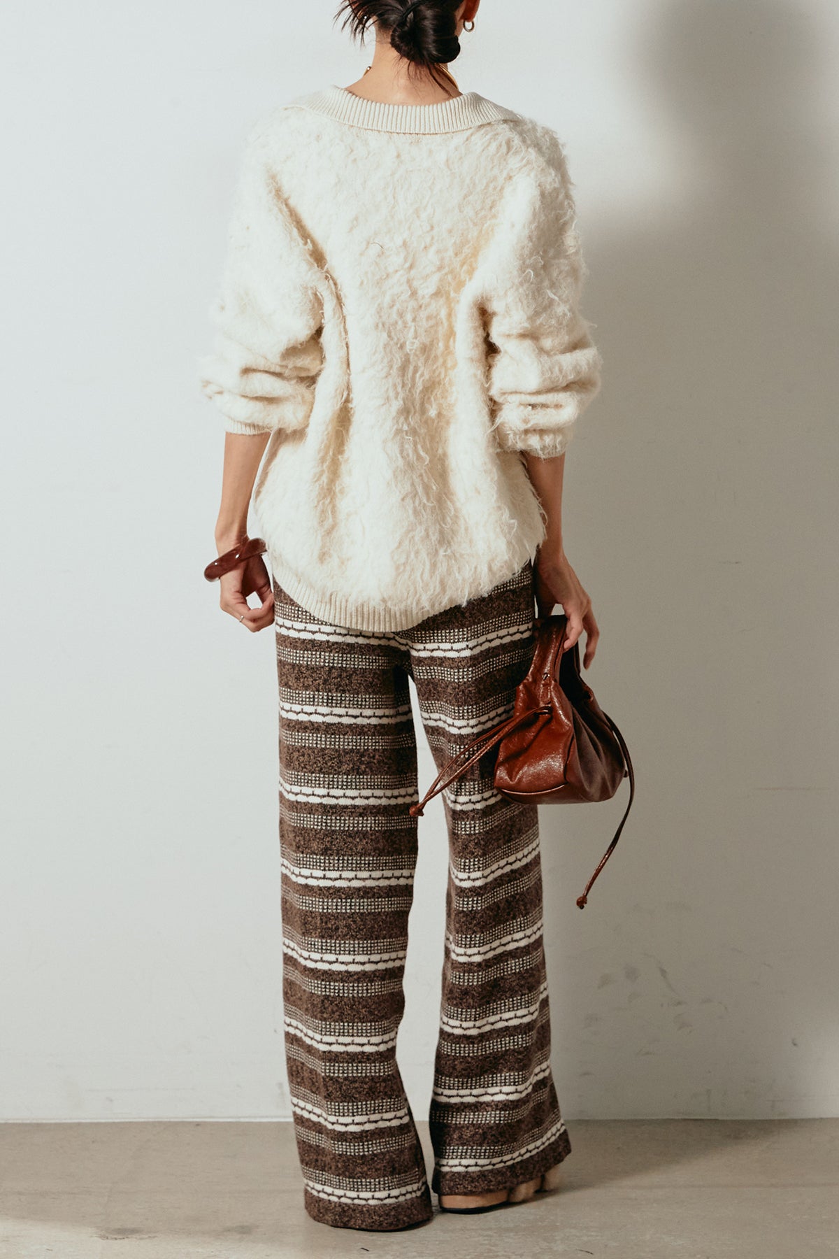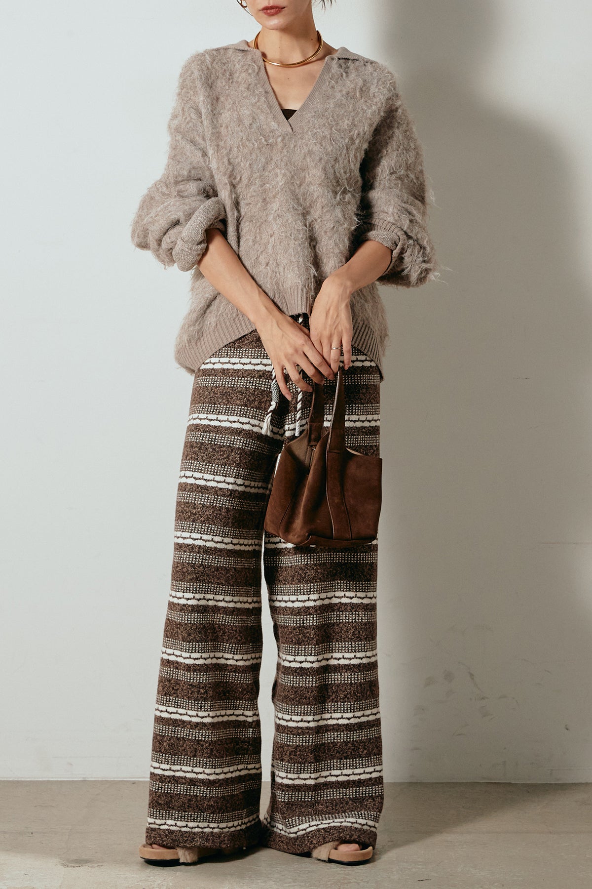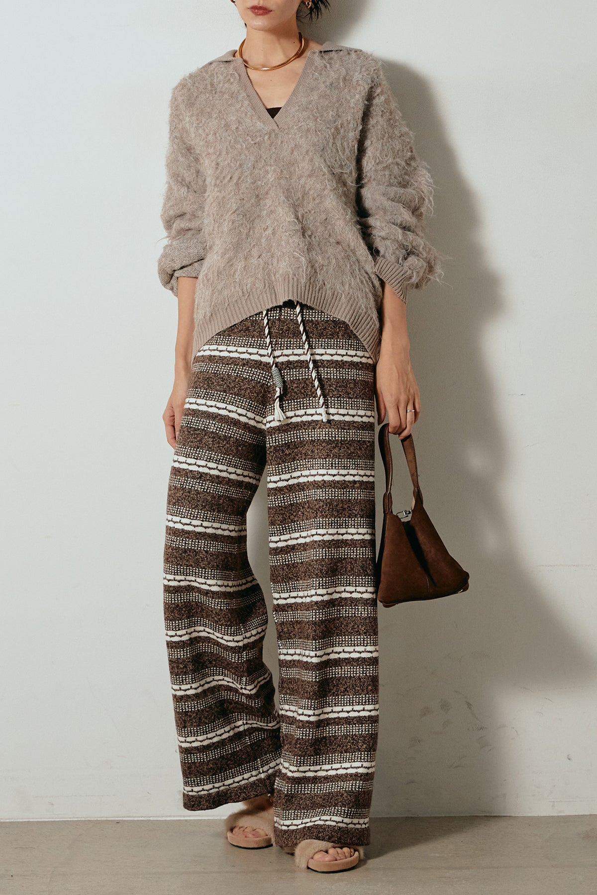 [SET]襟付きシャギーニットポロトップス+マルチライン柄リラックスニットパンツ(2set)