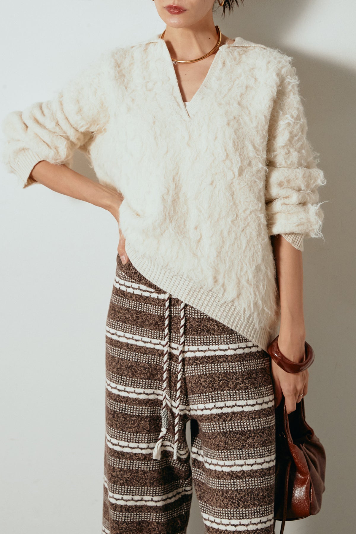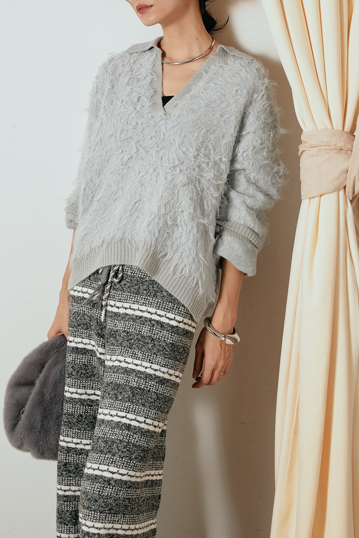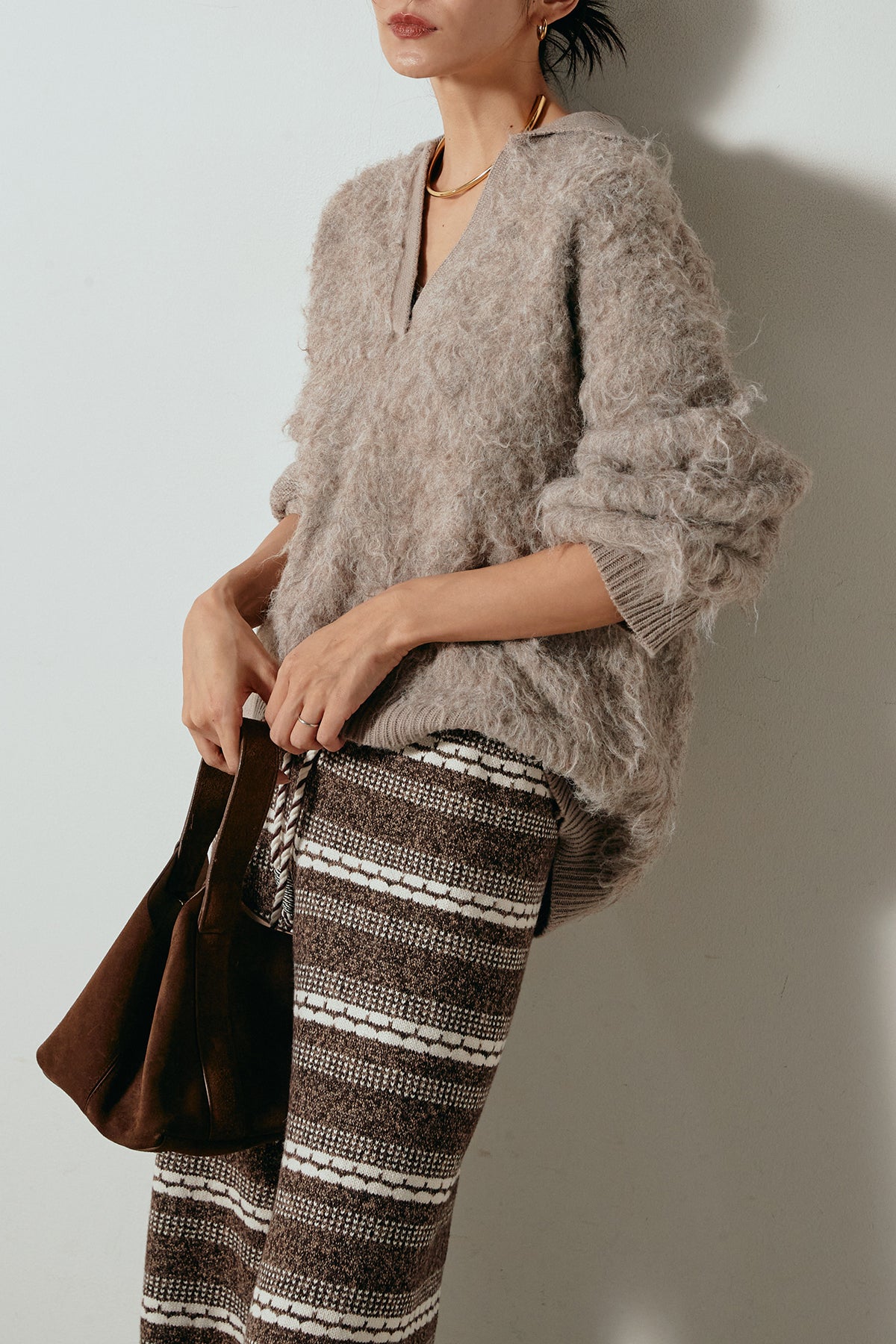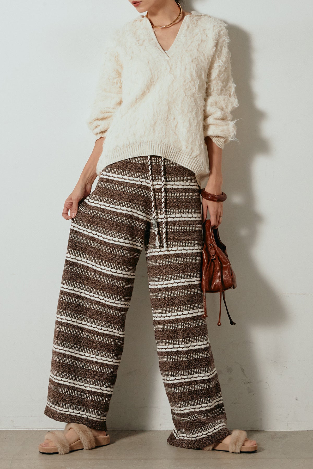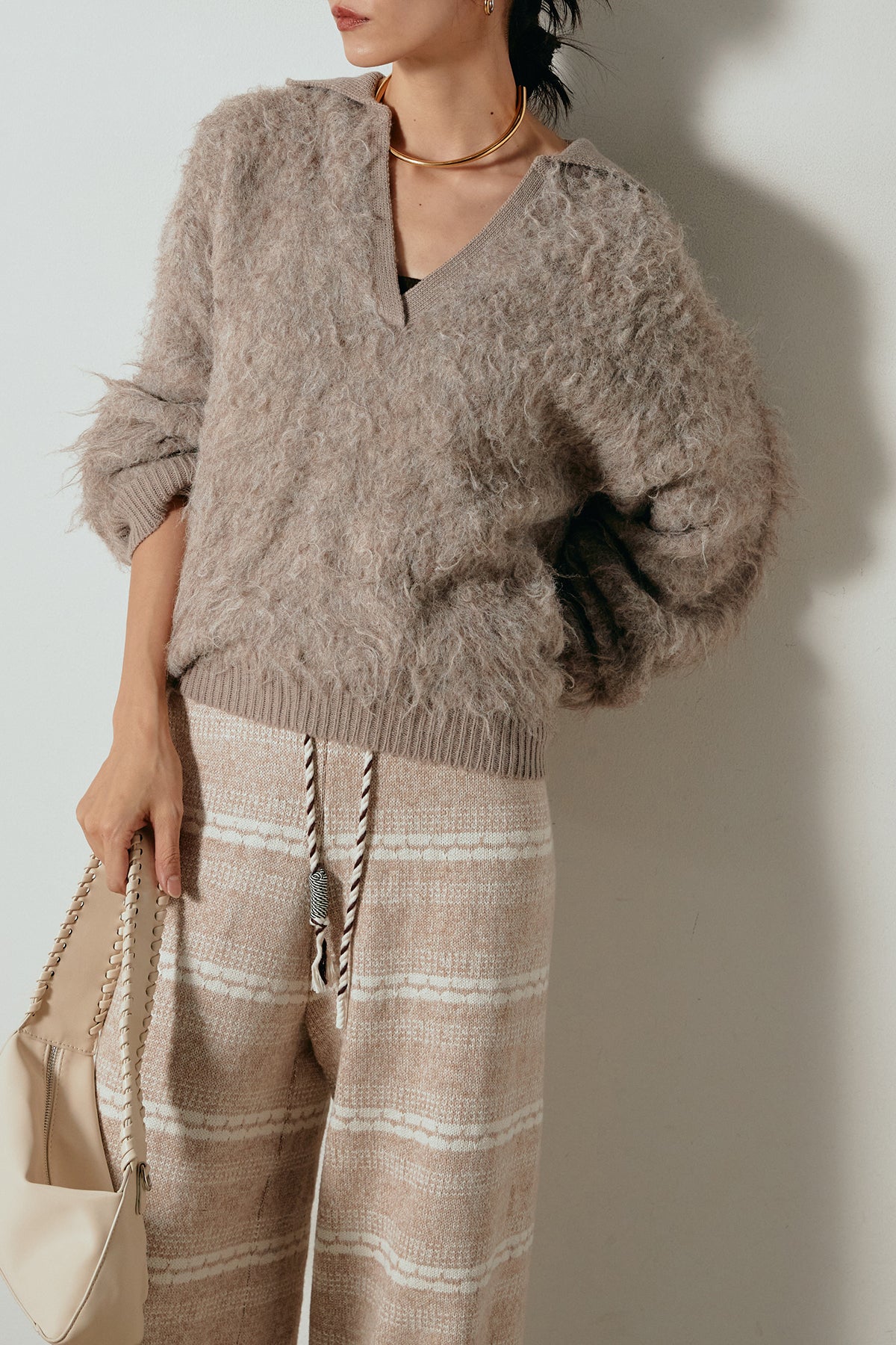 [SET]襟付きシャギーニットポロトップス+マルチライン柄リラックスニットパンツ(2set)