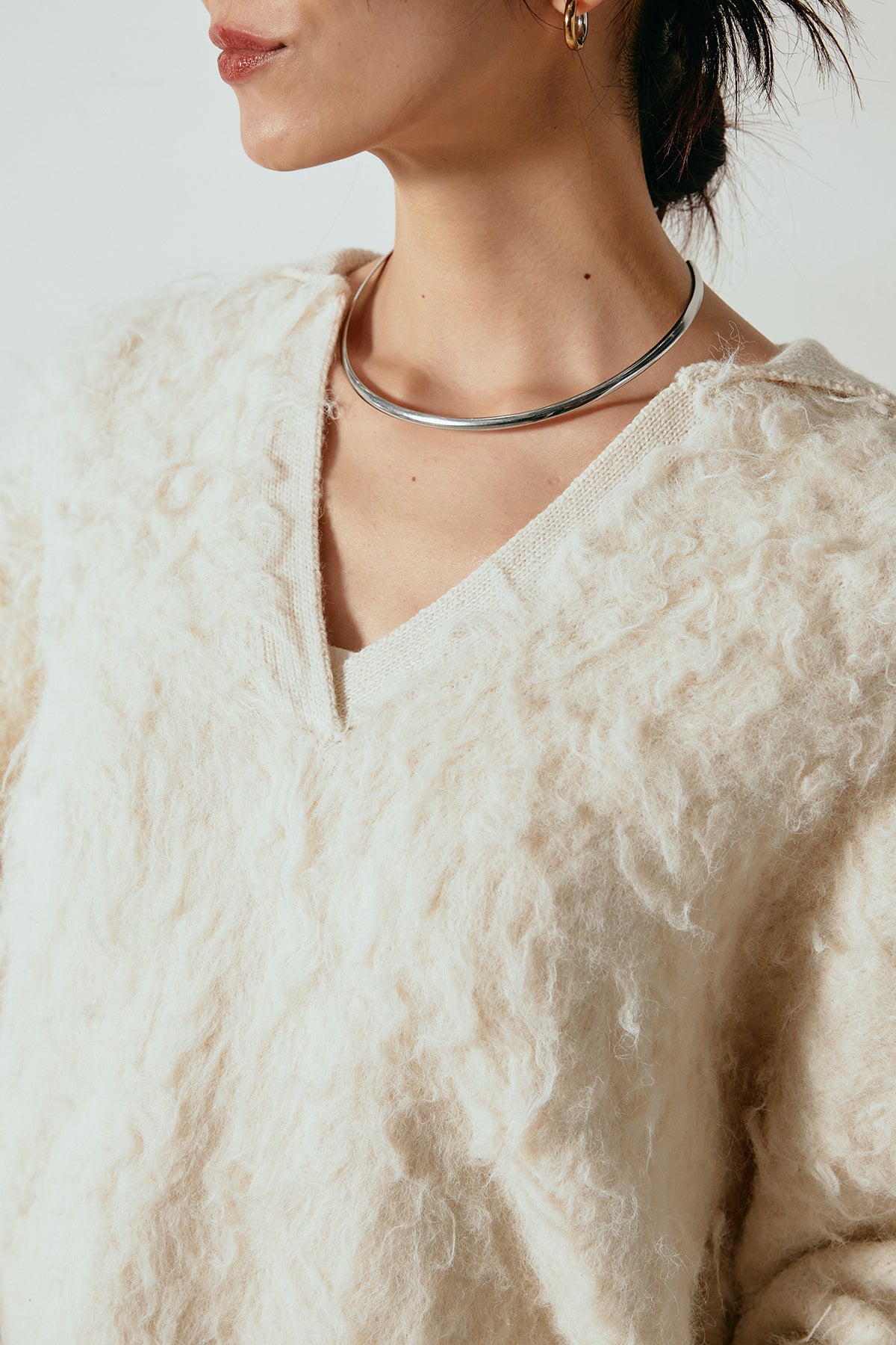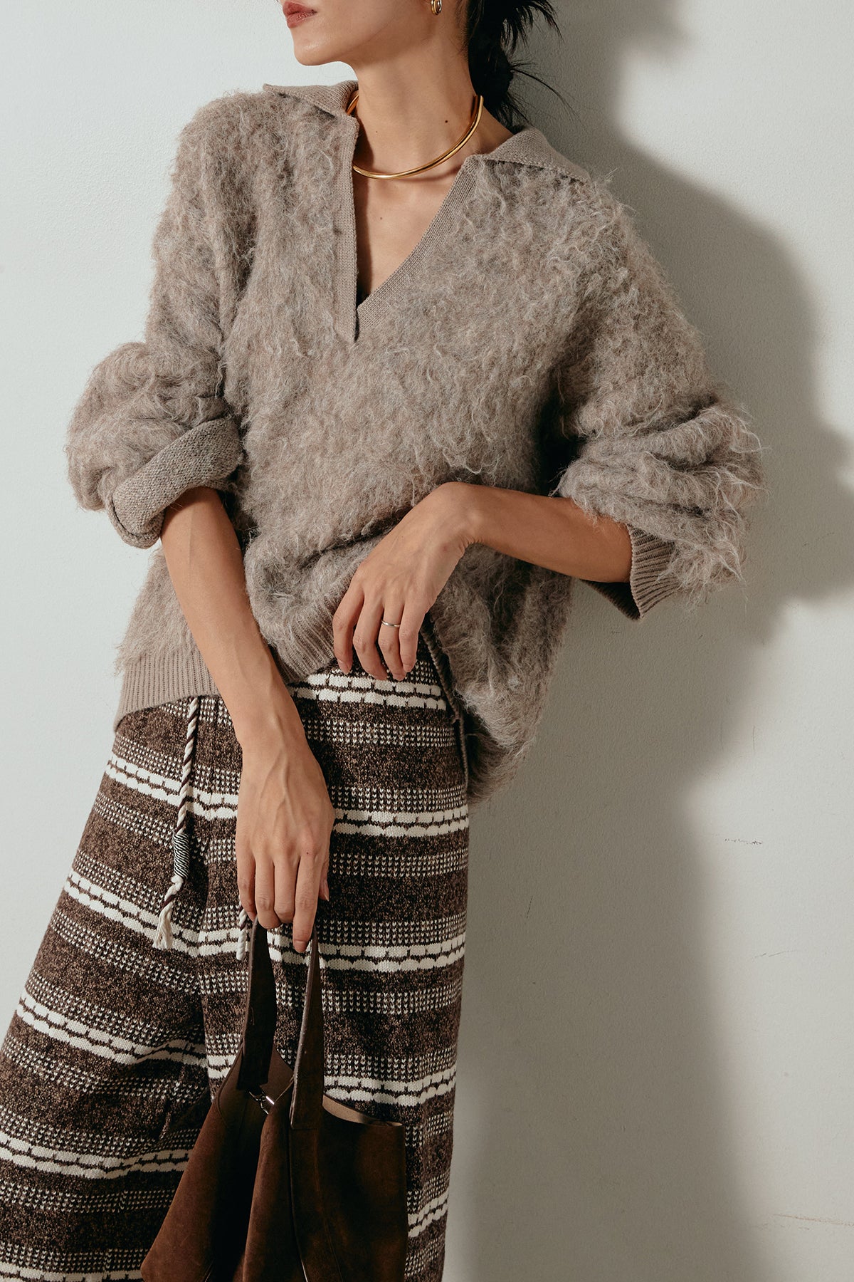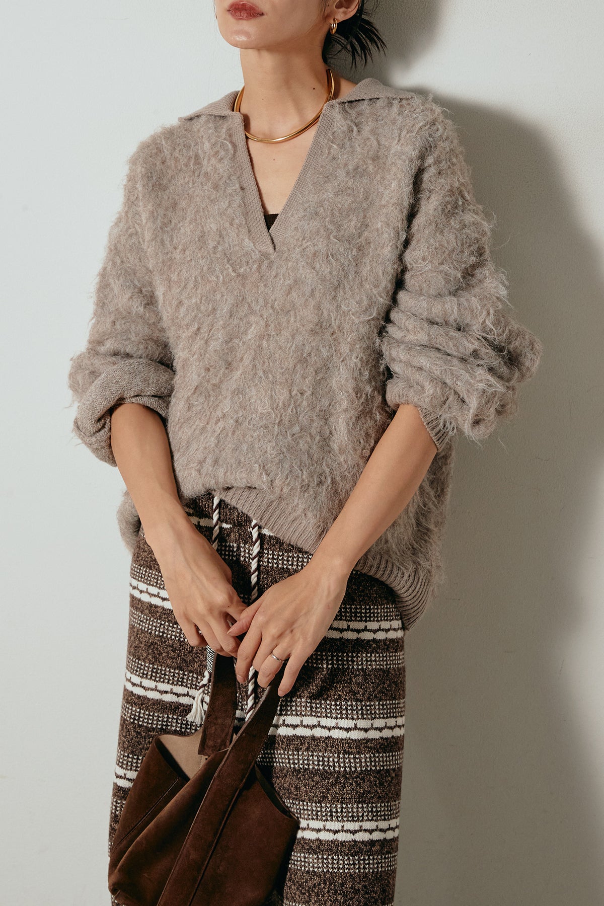 ふんわりとしたシャギー素材が目を惹くニットポロトップス。柔らかな質感がシーズンらしい温もりを感じさせ、程よいボリューム感の袖がこなれた印象をプラスします。襟付きデザインで顔まわりをすっきり見せつつ、カジュアルにも上品にも着こなせる一枚。スカートにもパンツにも合わせやすく、幅広いスタイリングを楽しめます。