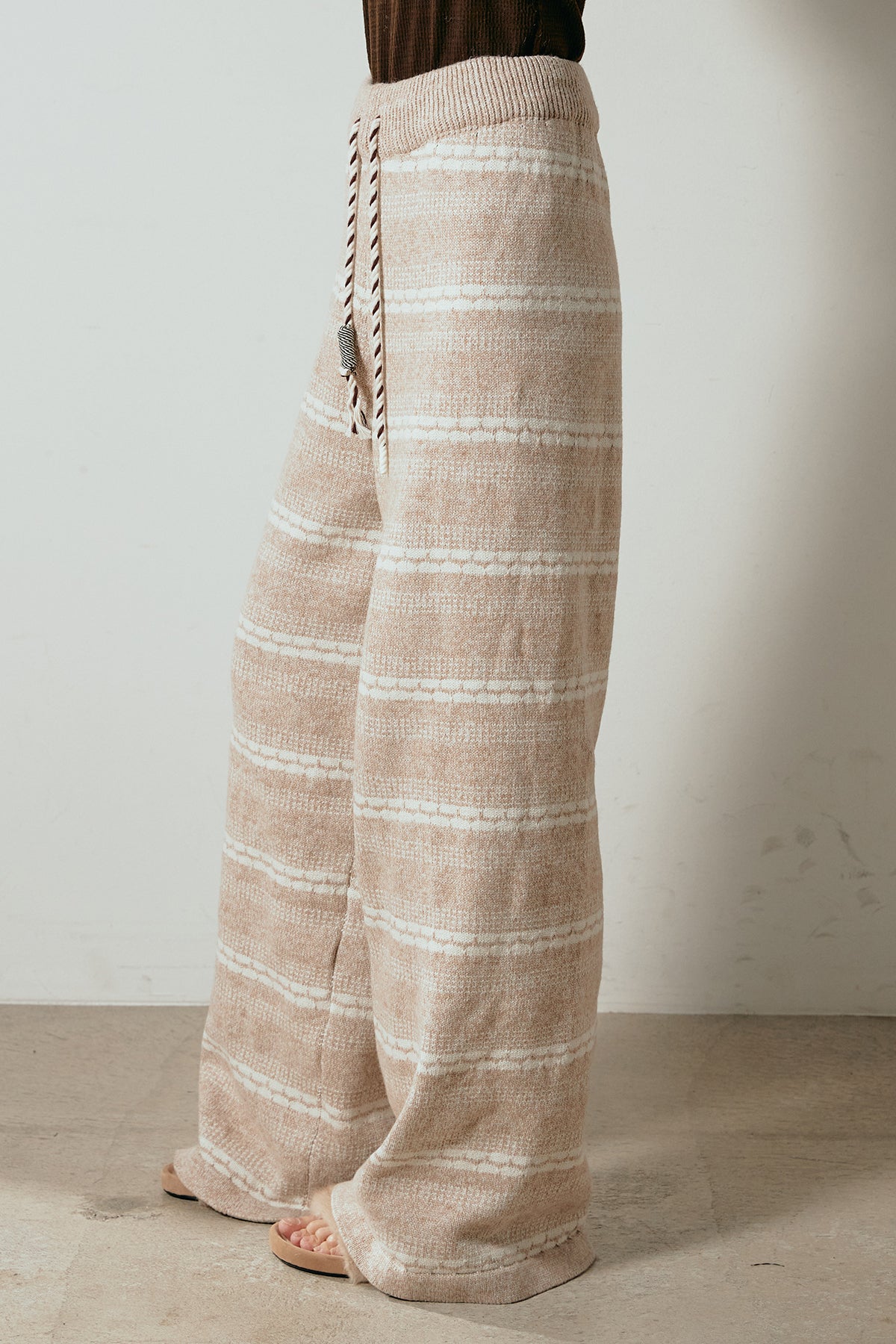 マルチライン柄がアクセントになったリラックスニットパンツ。 柔らかく伸縮性のあるニット素材で、ストレスフリーな穿き心地を叶えます。 ウエストはドローストリング仕様でサイズ調整も可能。 ルーズなシルエットが抜け感を生み、シンプルなトップスを合わせるだけでこなれた雰囲気に仕上がります。