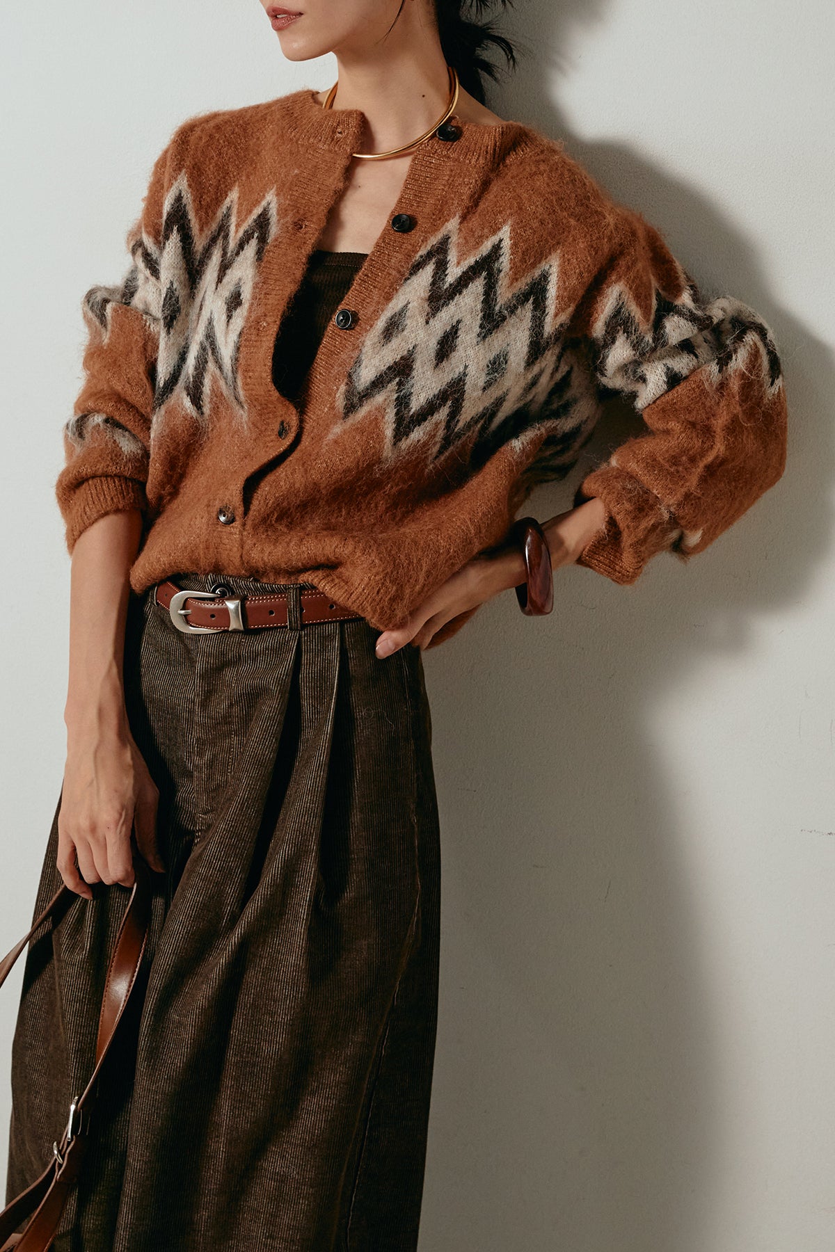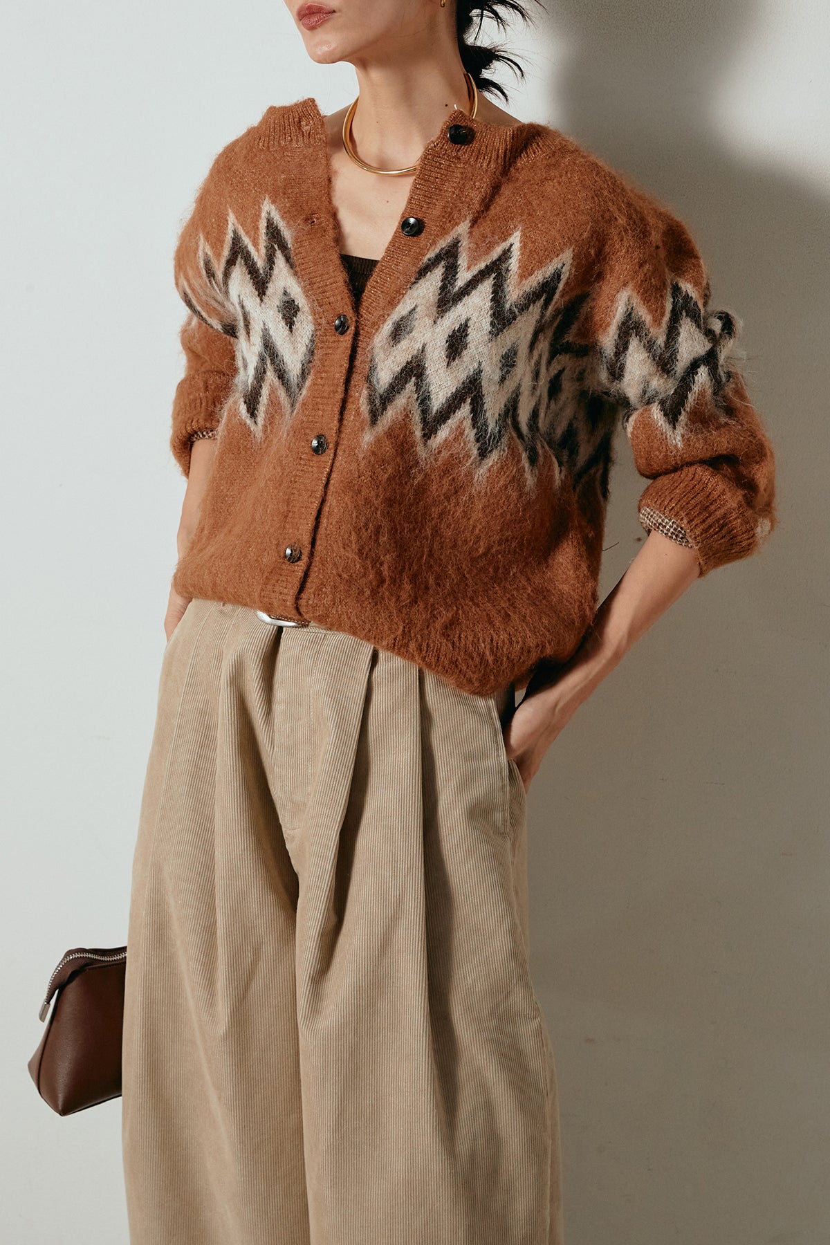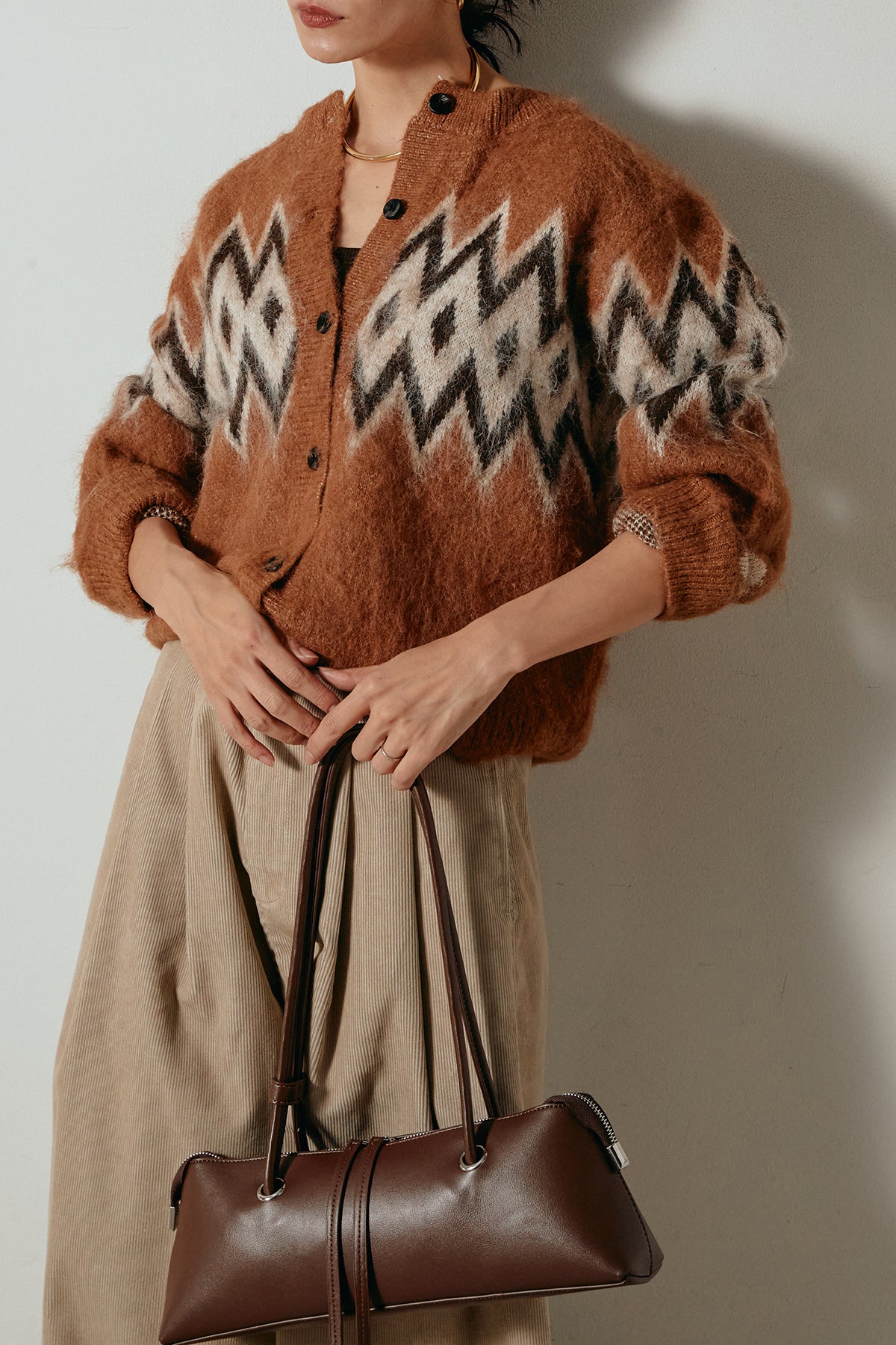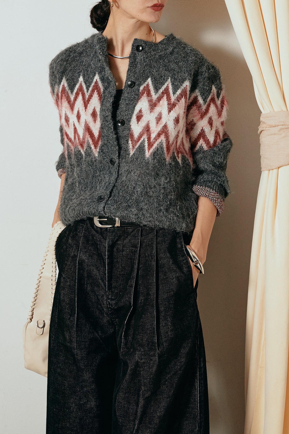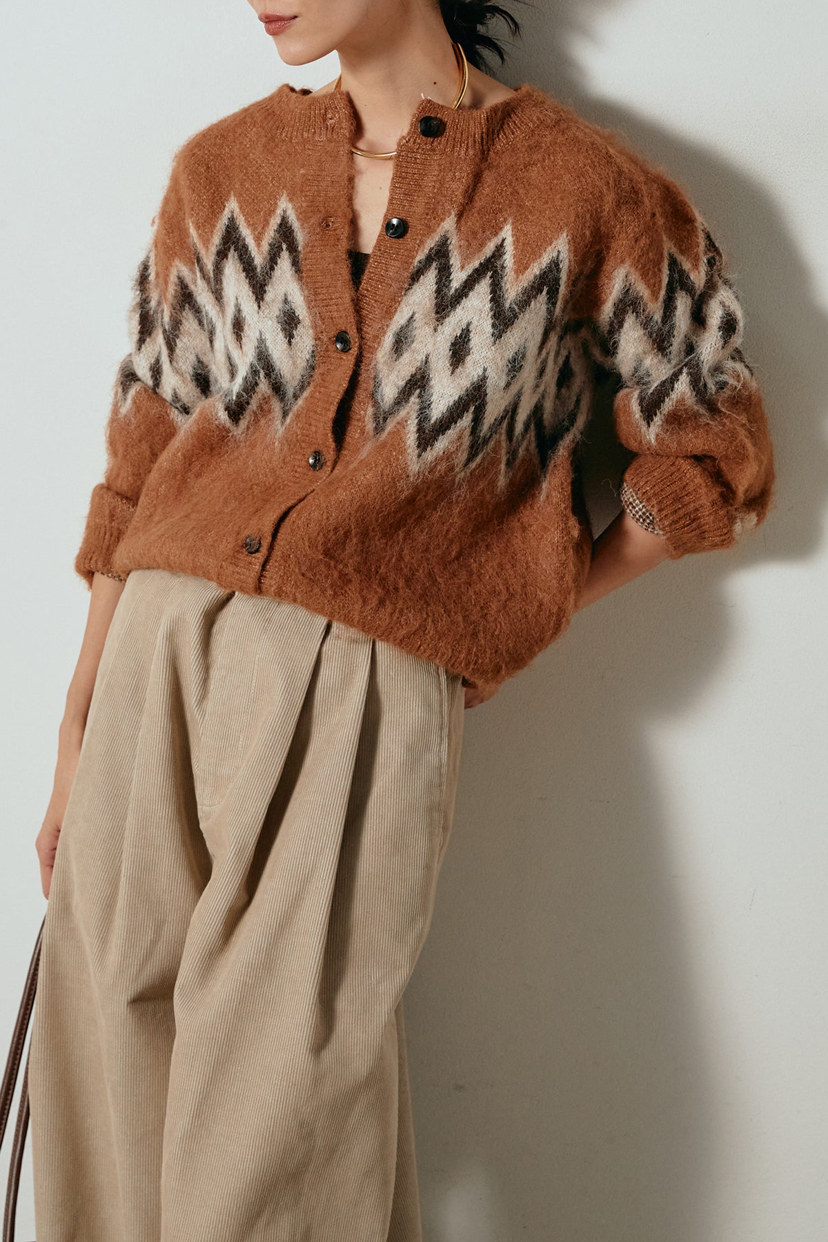 起毛感のある風合いが魅力のノルディック柄ニットカーディガン。 季節感のあるモヘアタッチ素材で、やわらかな印象に仕上げました。 程よいショート丈とゆるめのシルエットが抜け感を生み、どんなボトムともバランスよくマッチ。 一枚で主役になる存在感のあるデザインで、羽織るだけで秋冬ムードを高めてくれるアイテムです。