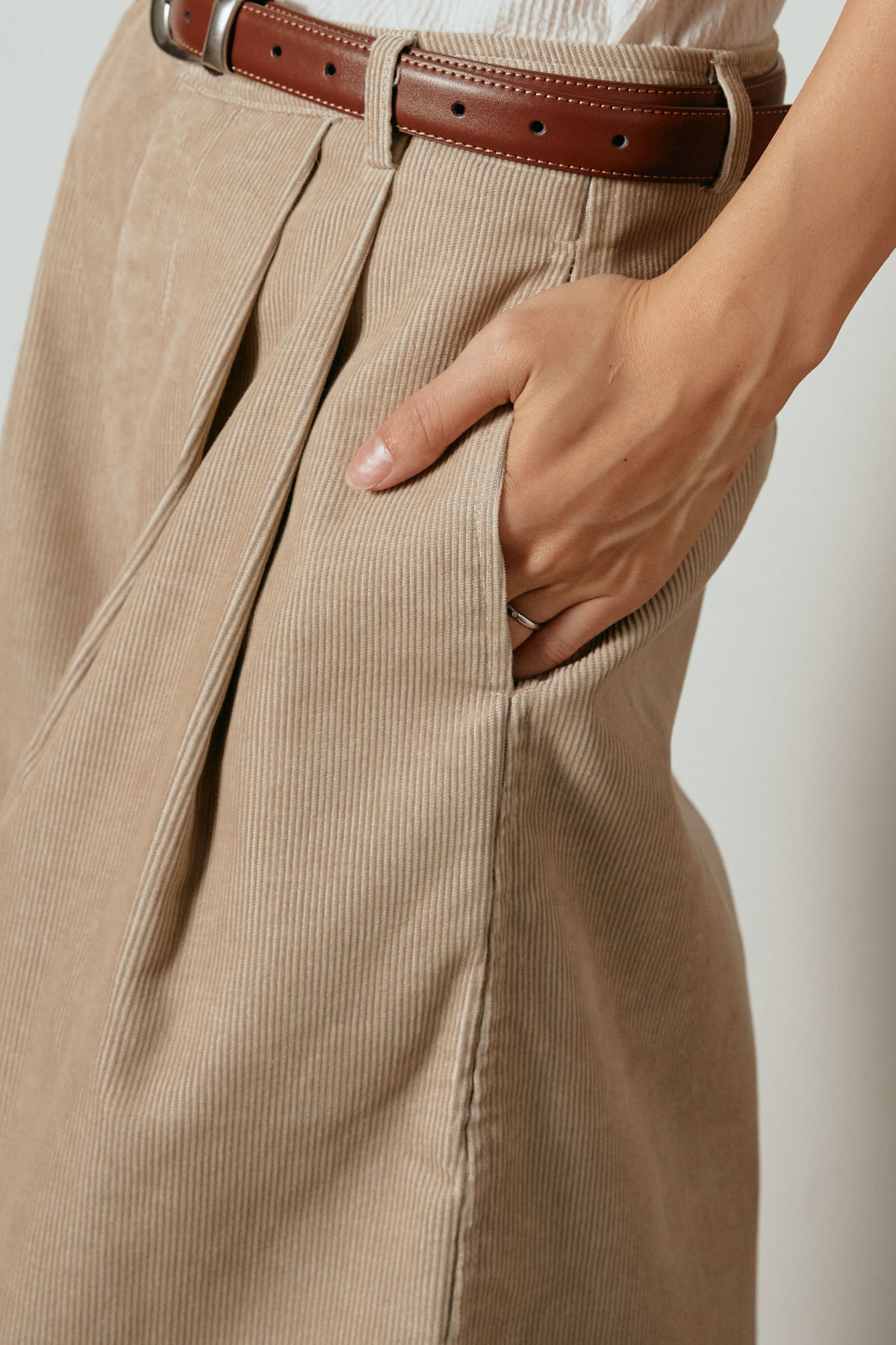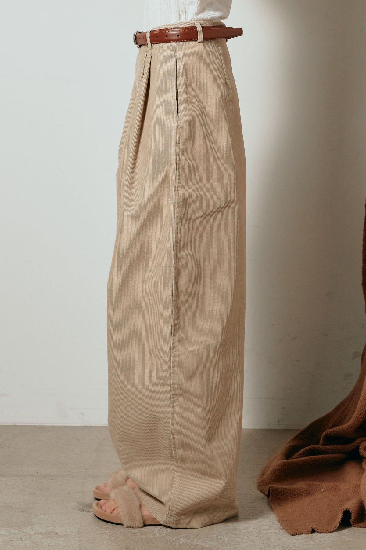 温かみのあるコーデュロイ素材を使用したフロントタックパンツ。程よくゆとりを持たせたワイドシルエットが体型を拾わず、リラクシーな印象に仕上げます。フロントのタックディテールが立体感を生み、脚長効果も◎。トップスをインしてウエストベルトをアクセントにする着こなしもおすすめ。秋冬らしい素材感で、カジュアルからきれいめまで幅広く活躍する一本です。