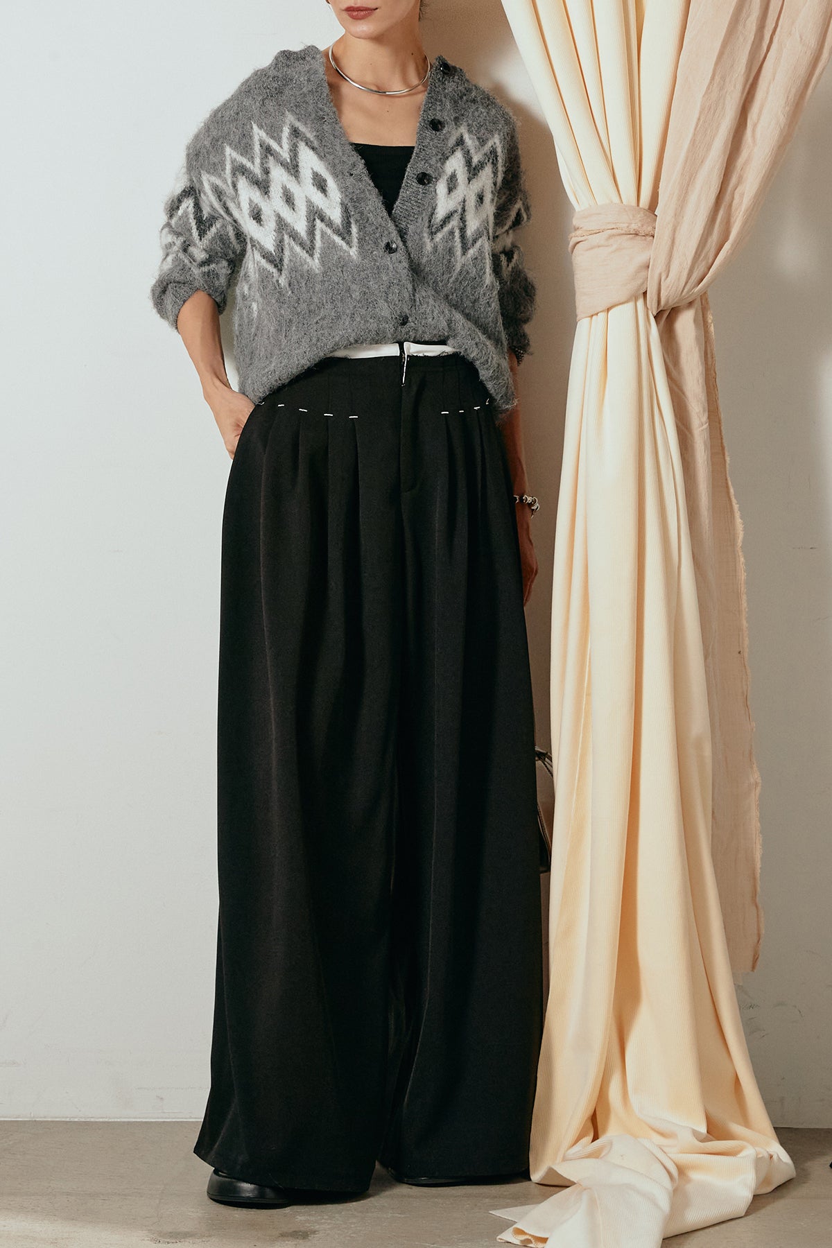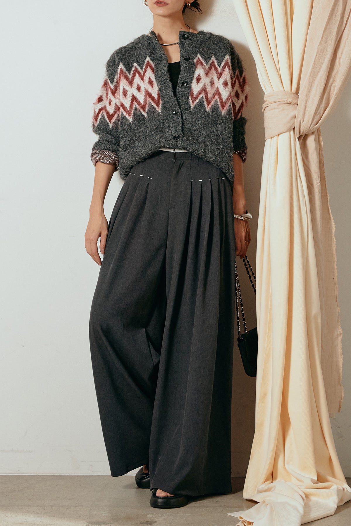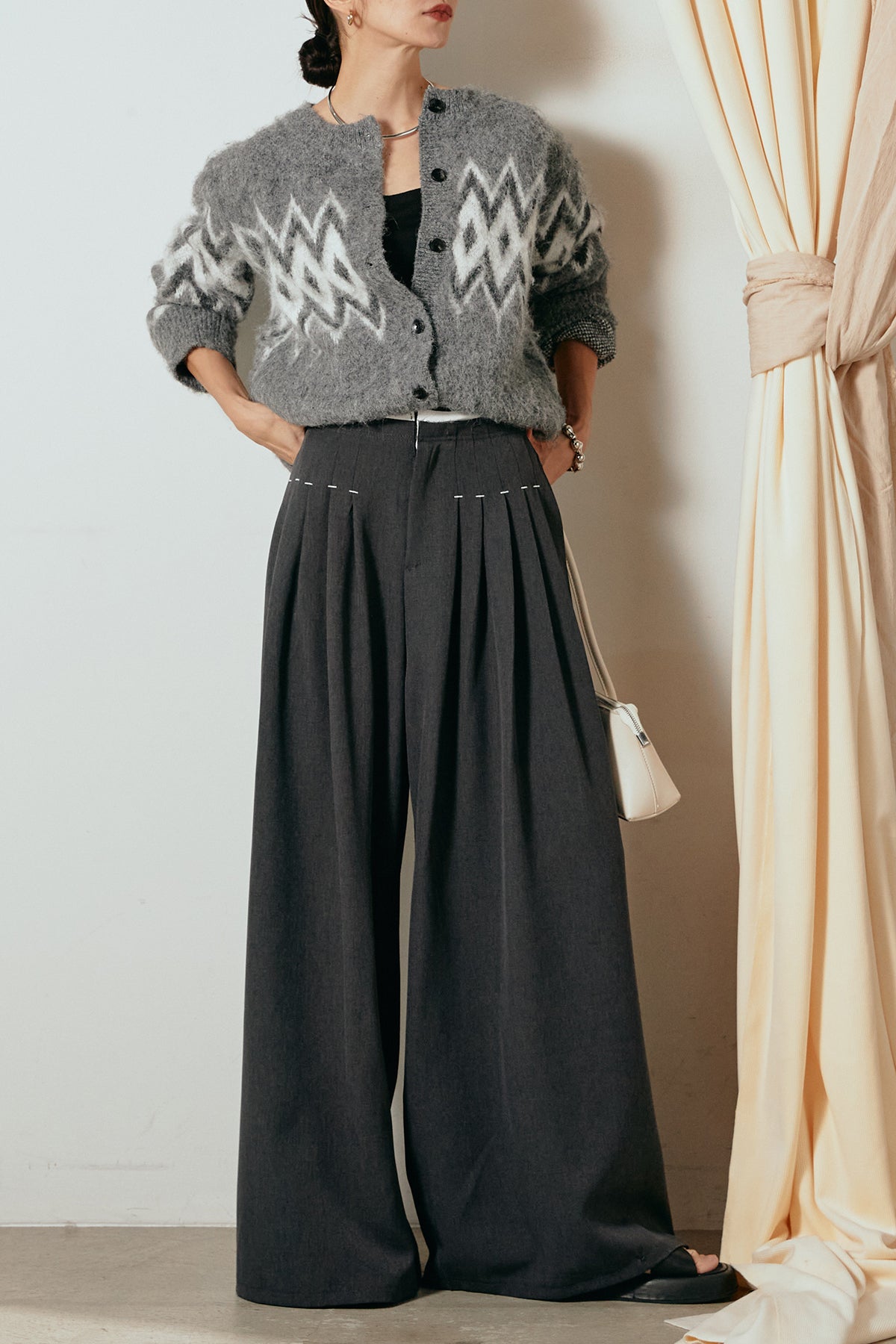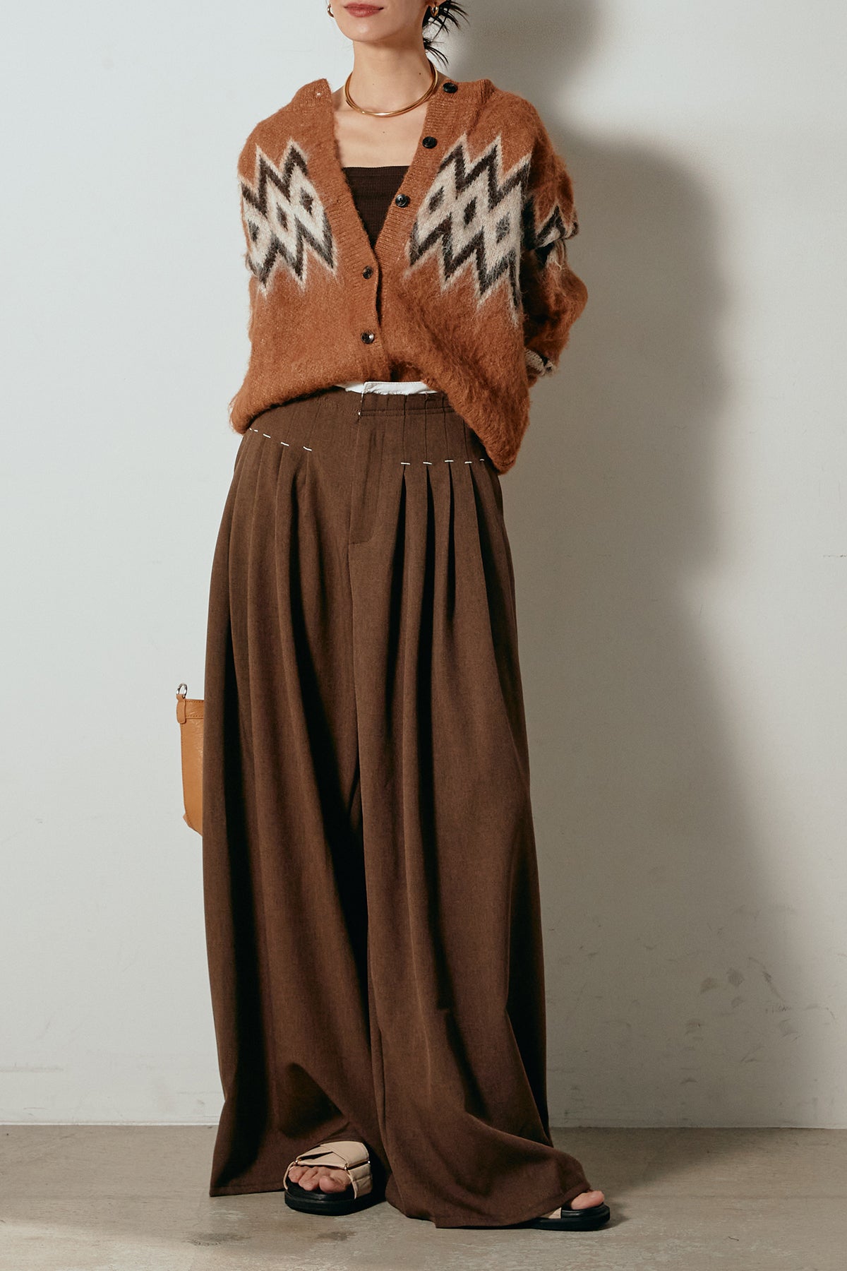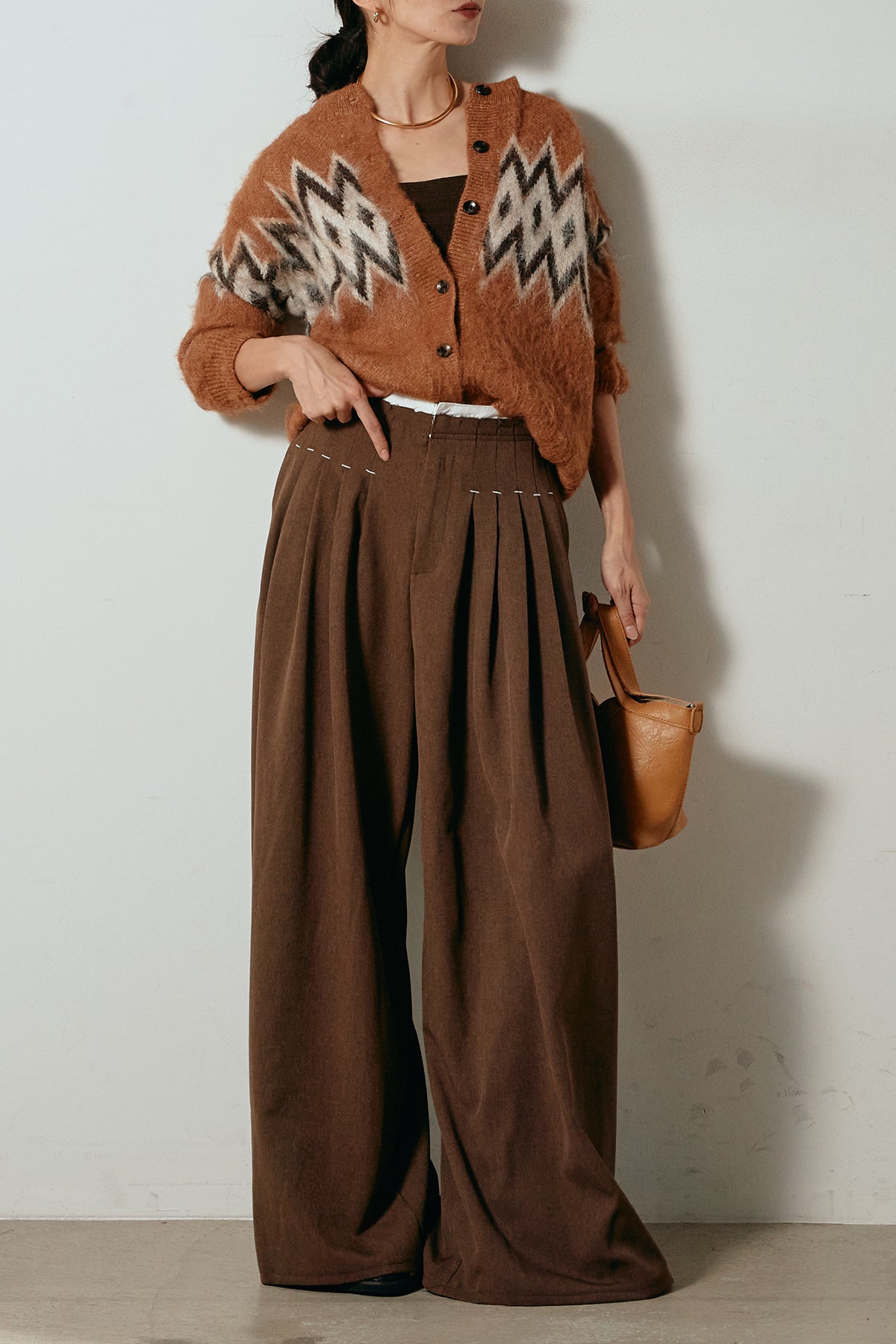[SET]起毛ノルディック柄ニットカーディガン+ウエストステッチデザインワイドスラックス(2set)