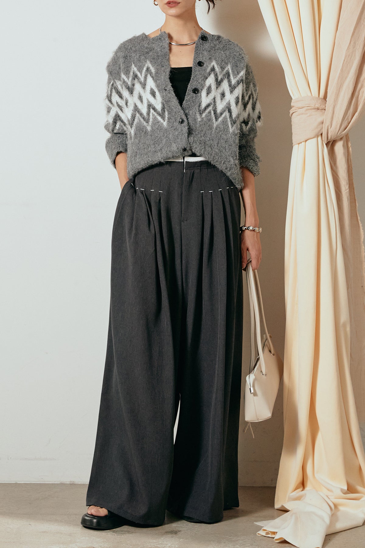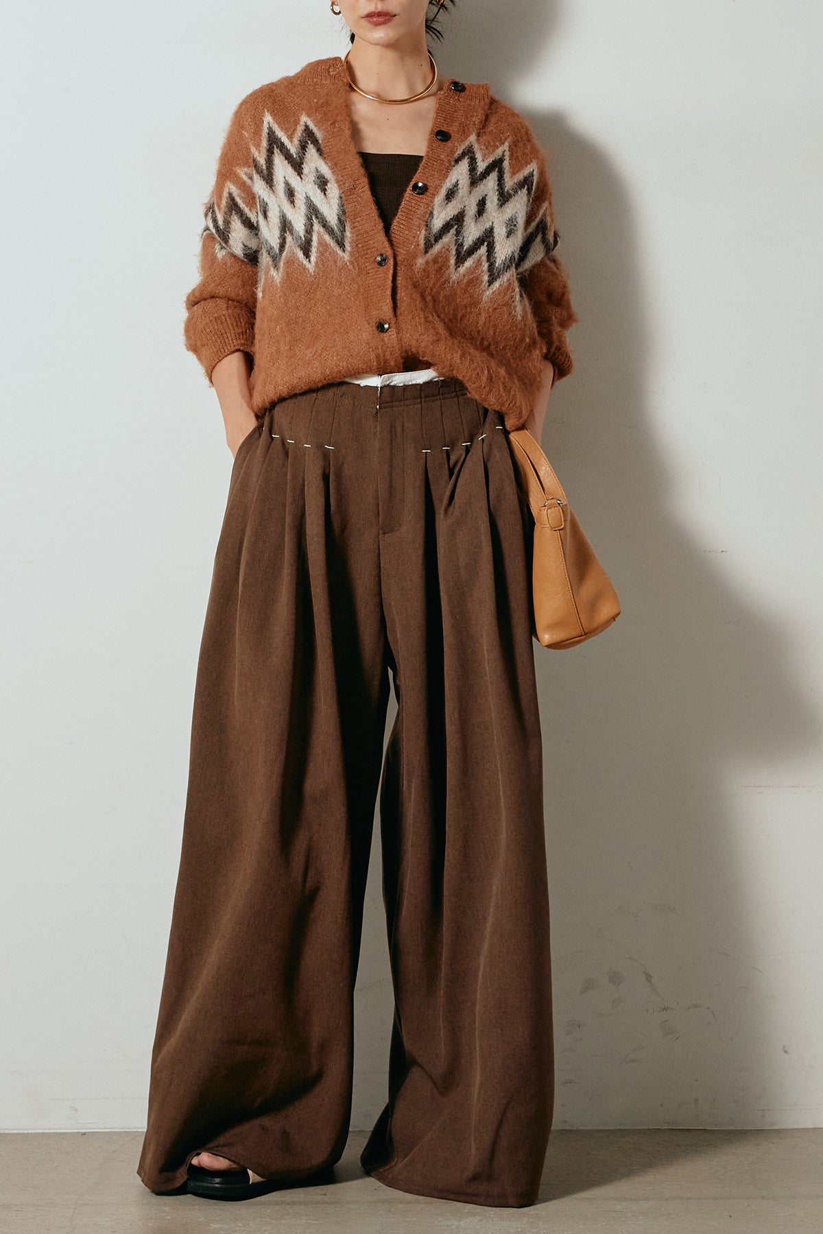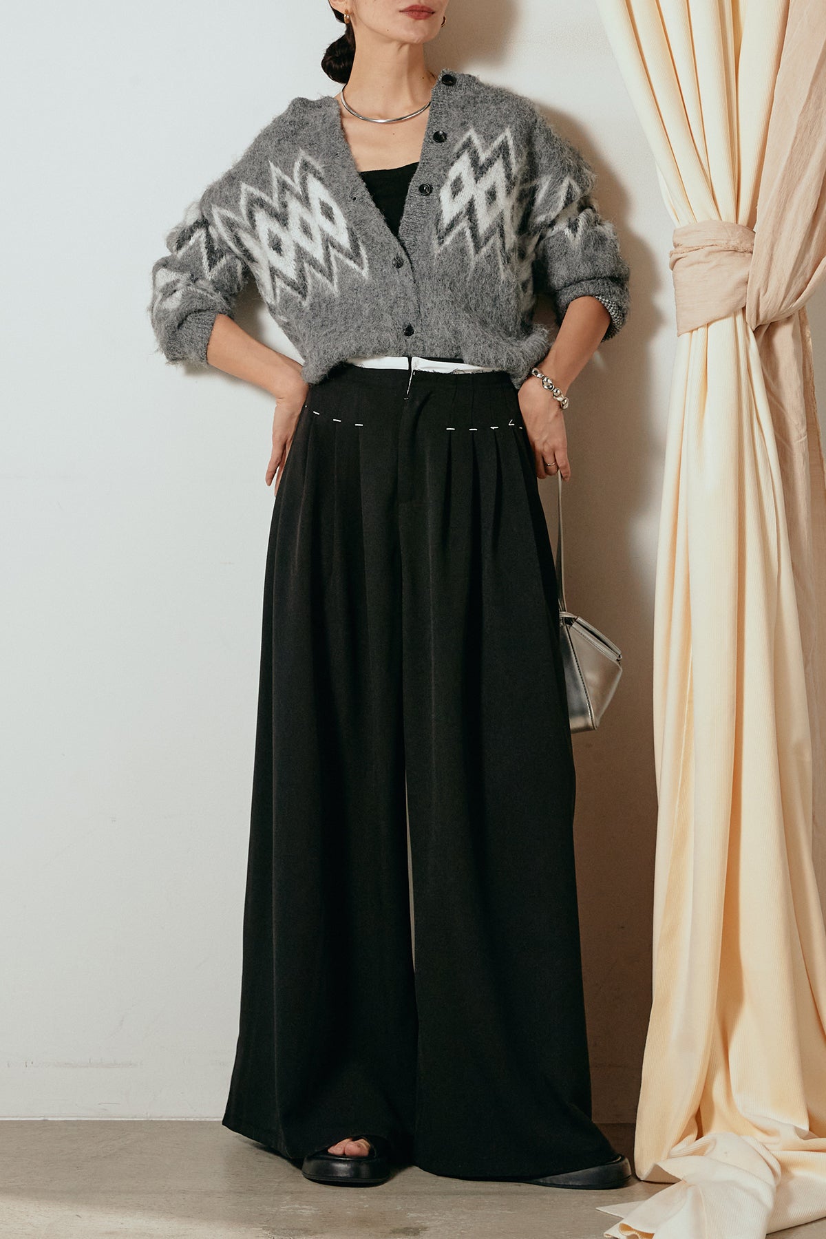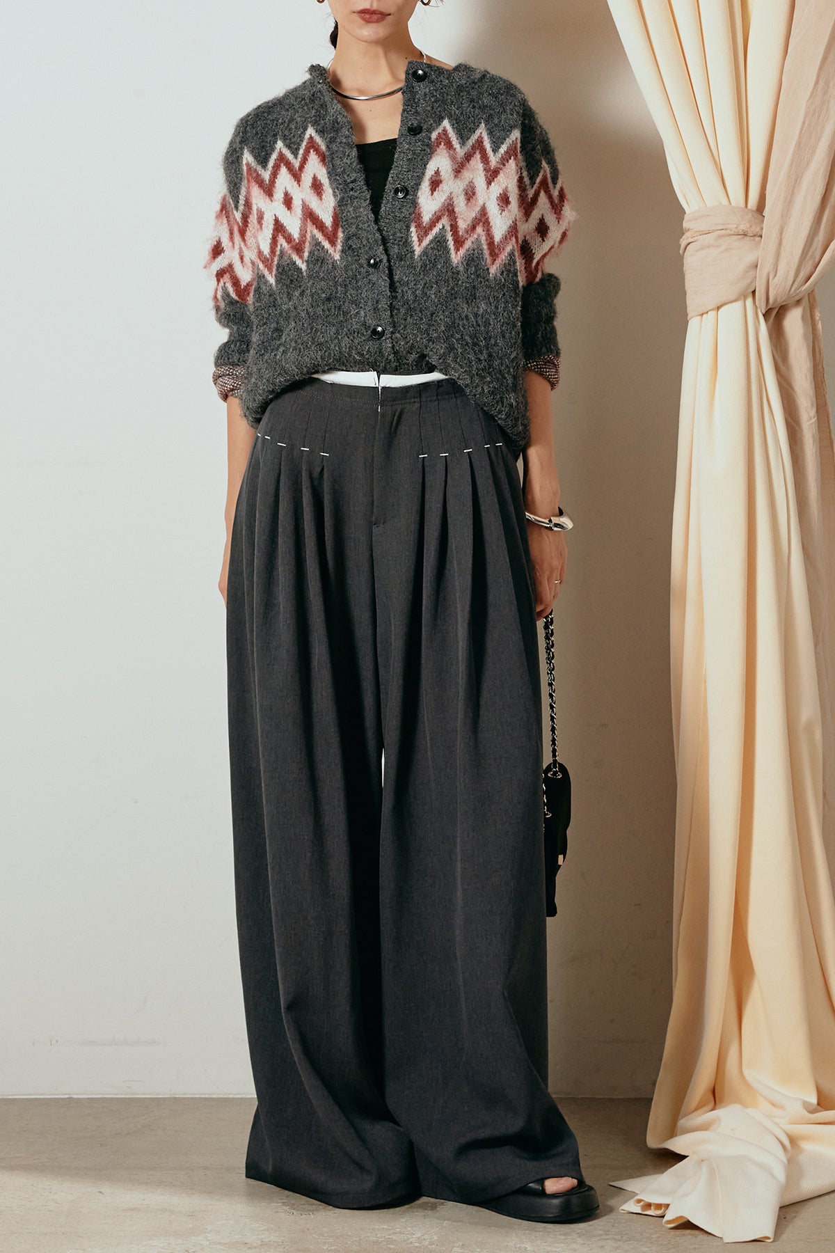 [SET]起毛ノルディック柄ニットカーディガン+ウエストステッチデザインワイドスラックス(2set)