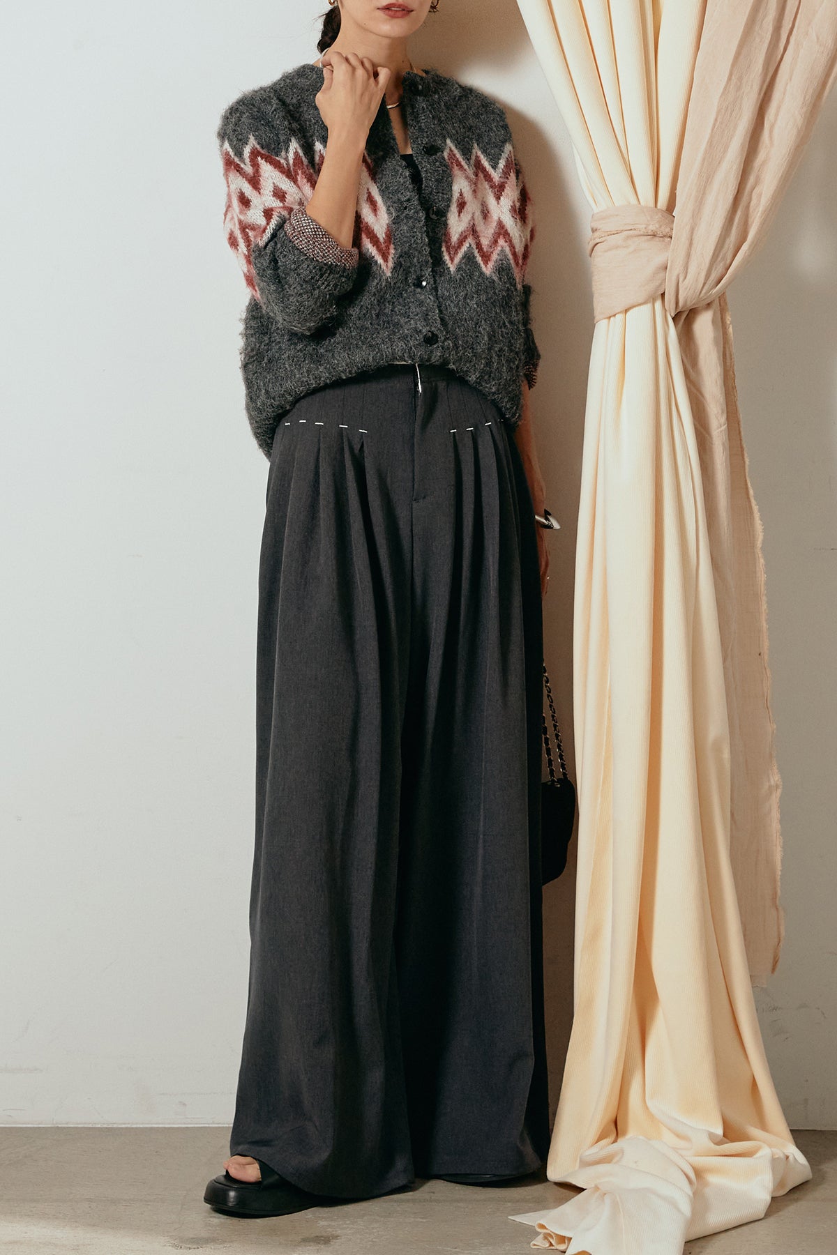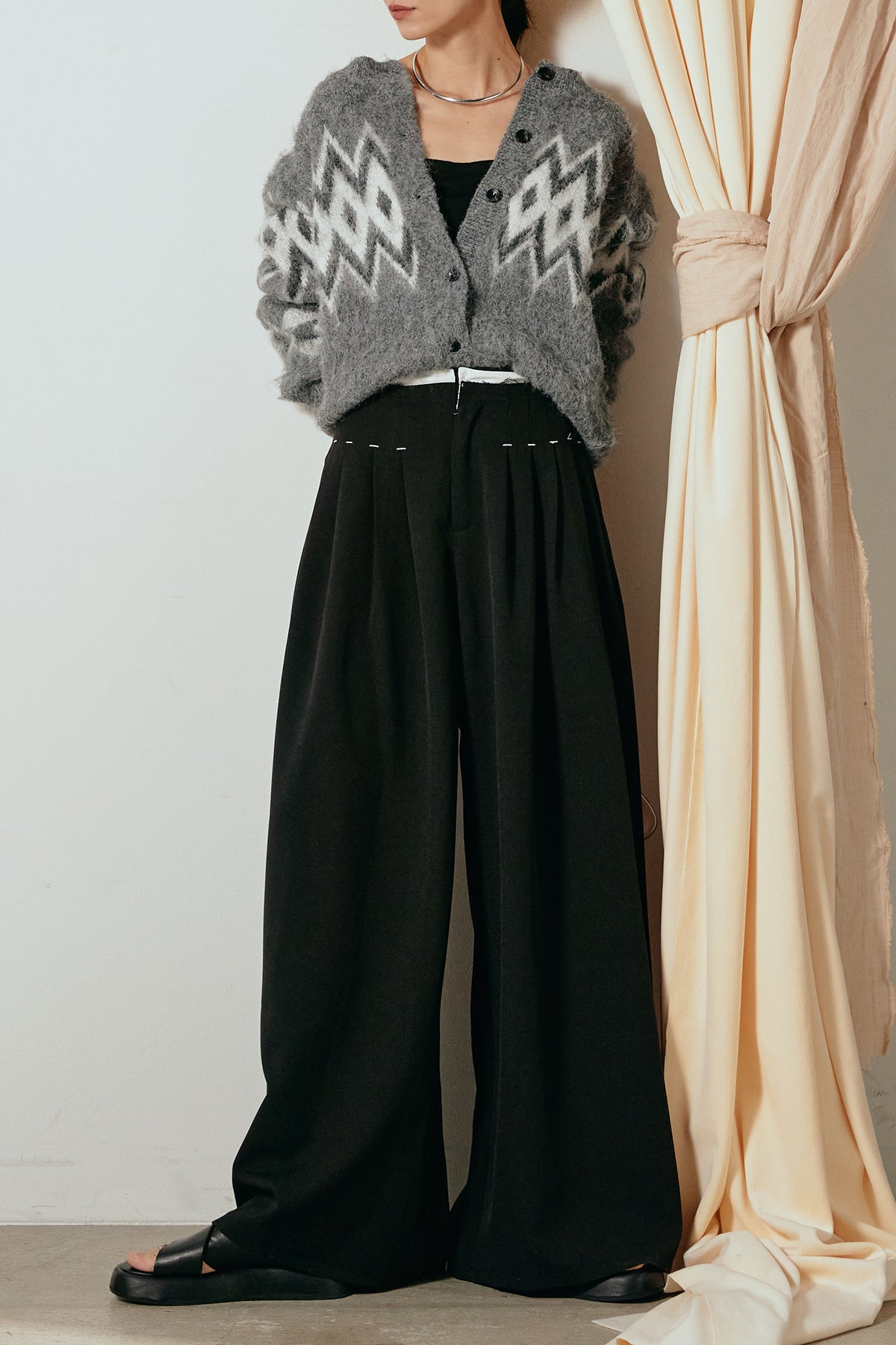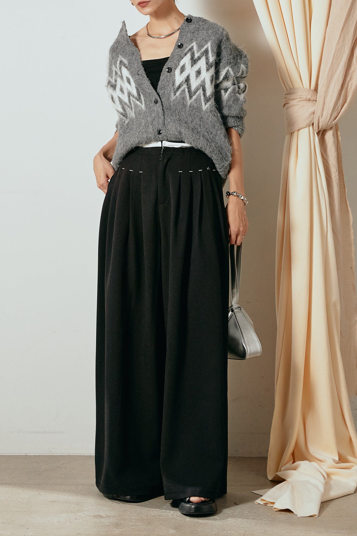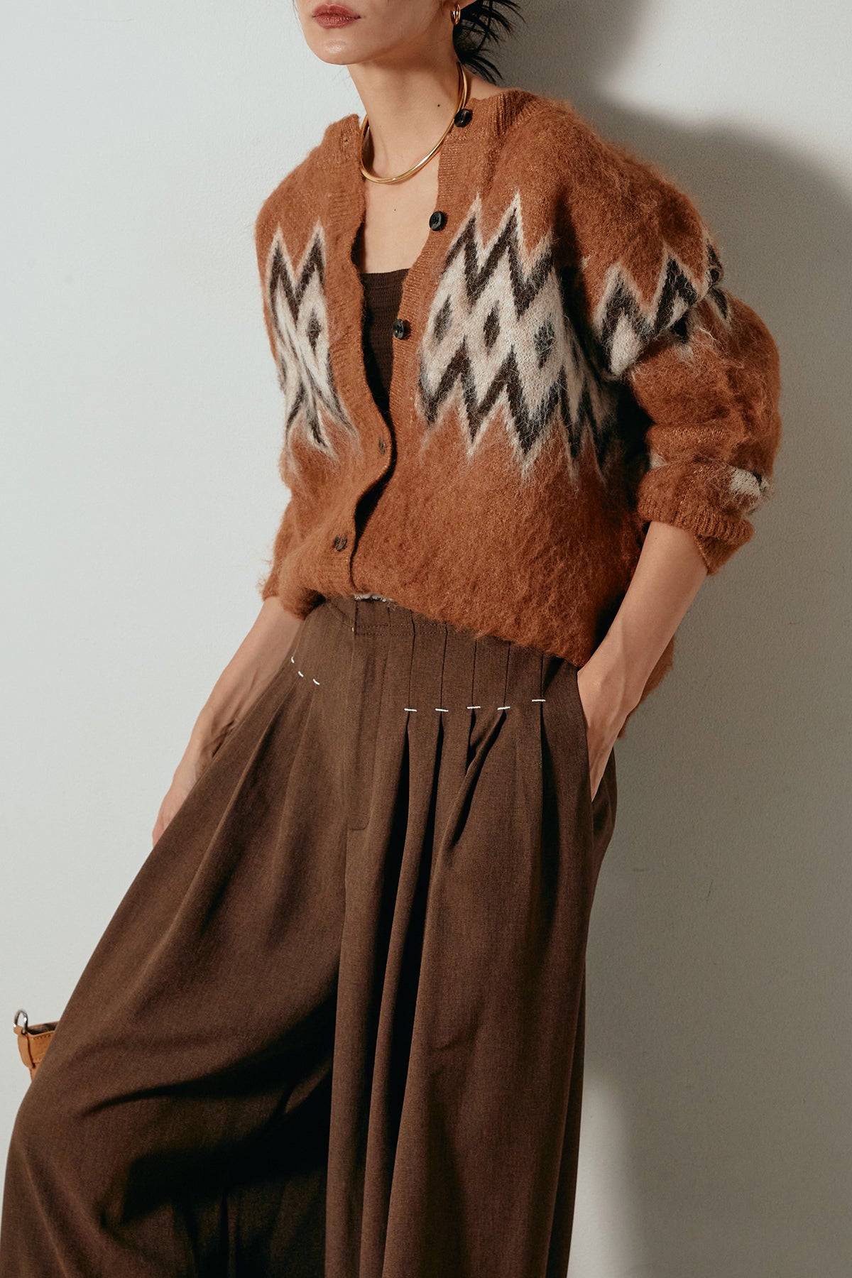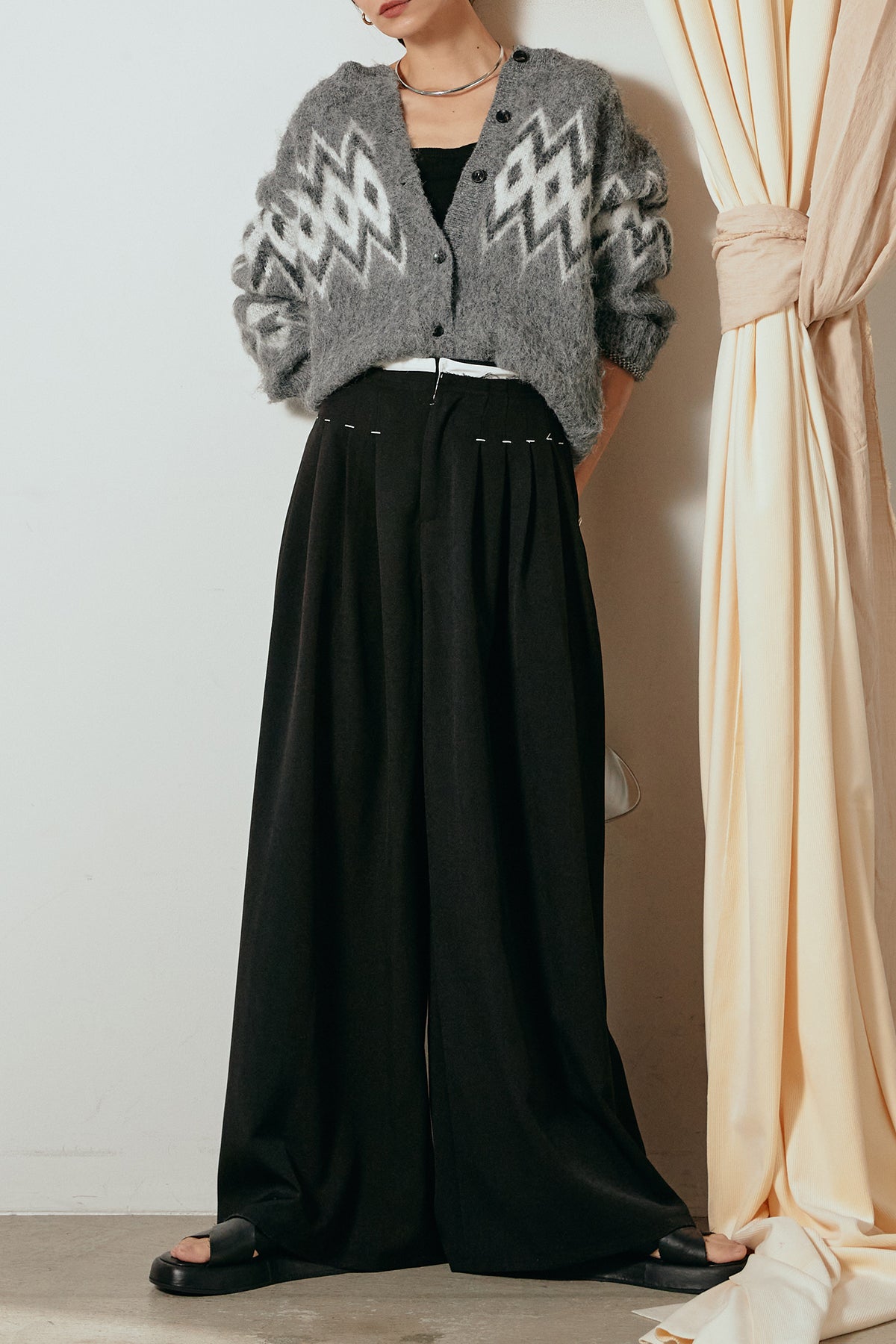 [SET]起毛ノルディック柄ニットカーディガン+ウエストステッチデザインワイドスラックス(2set)