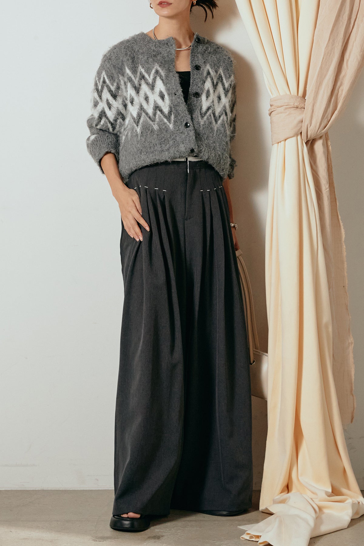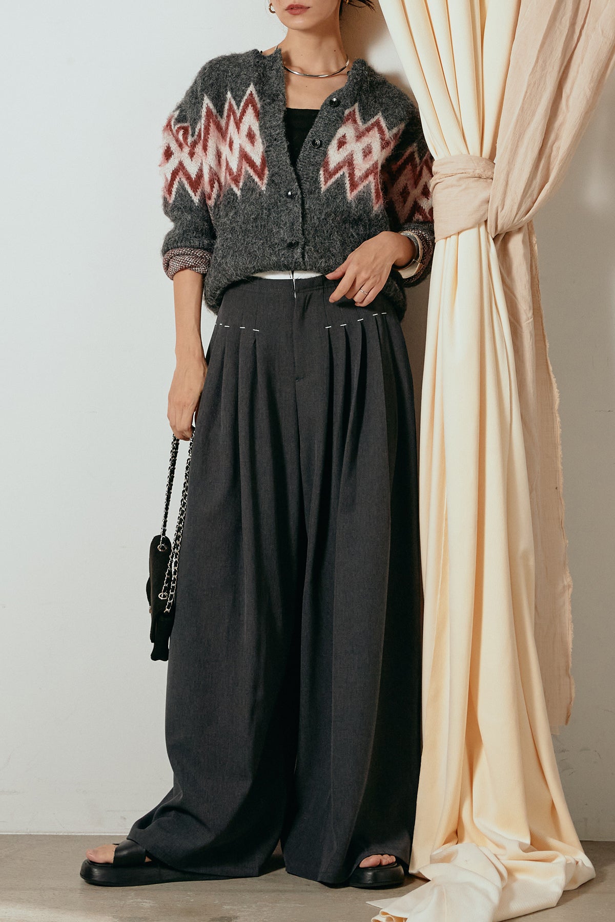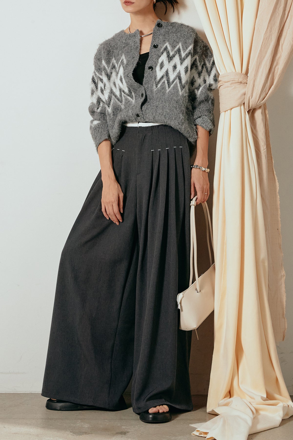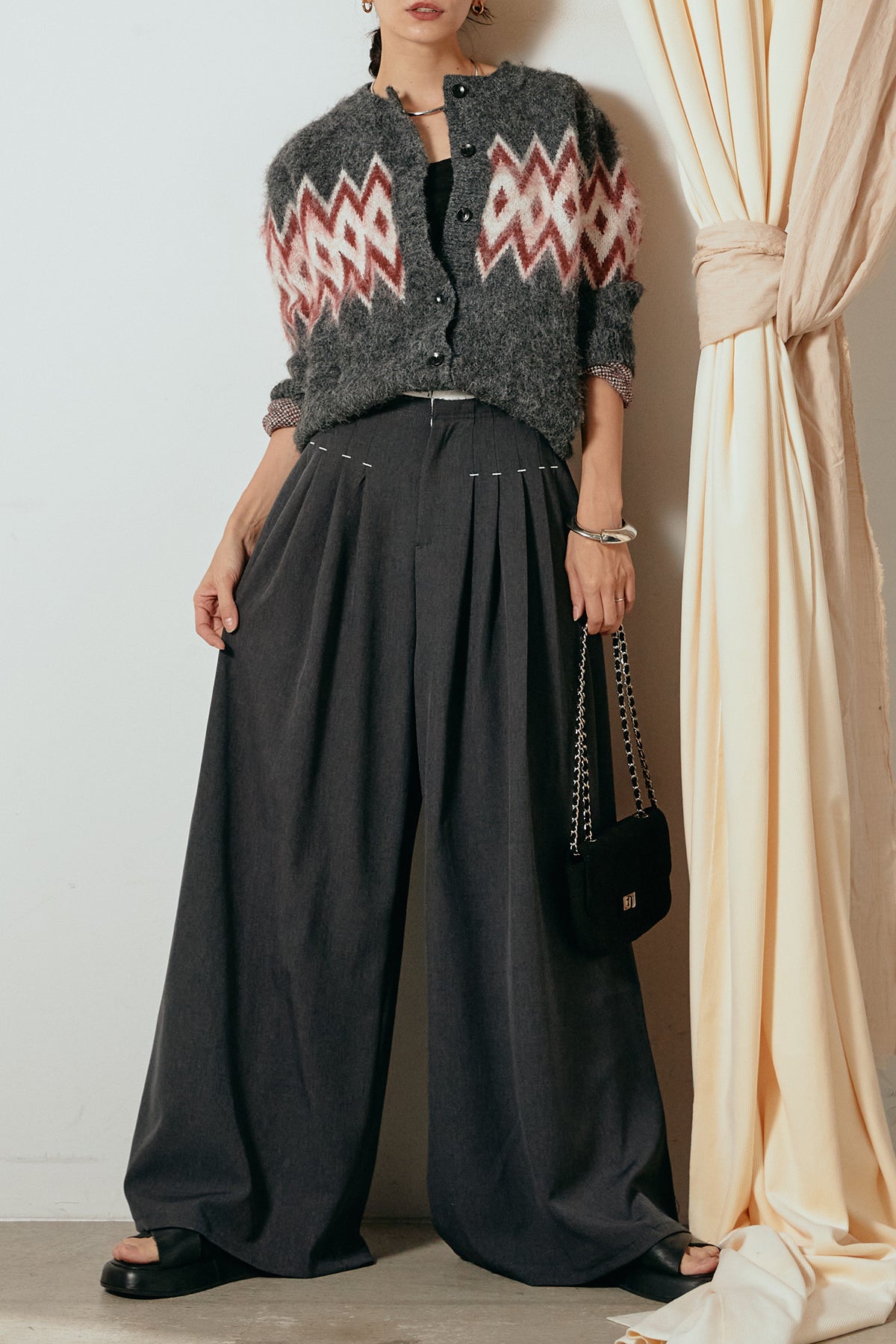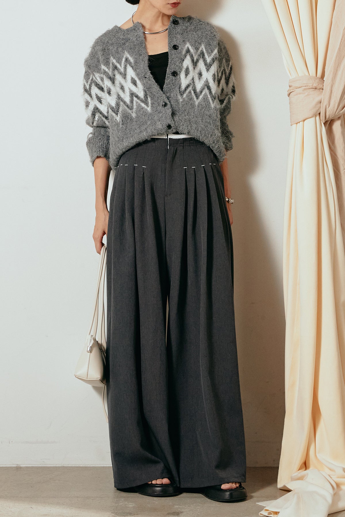 [SET]起毛ノルディック柄ニットカーディガン+ウエストステッチデザインワイドスラックス(2set)