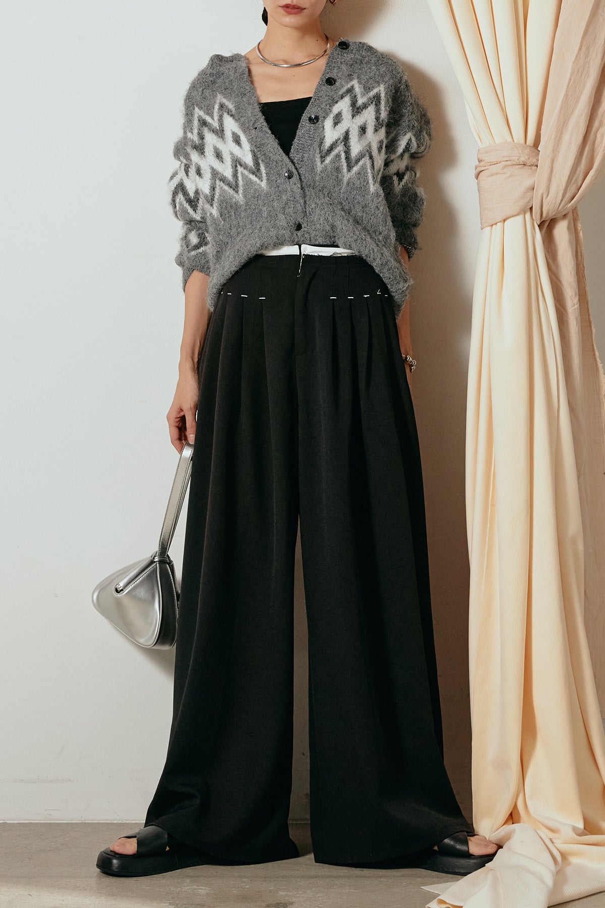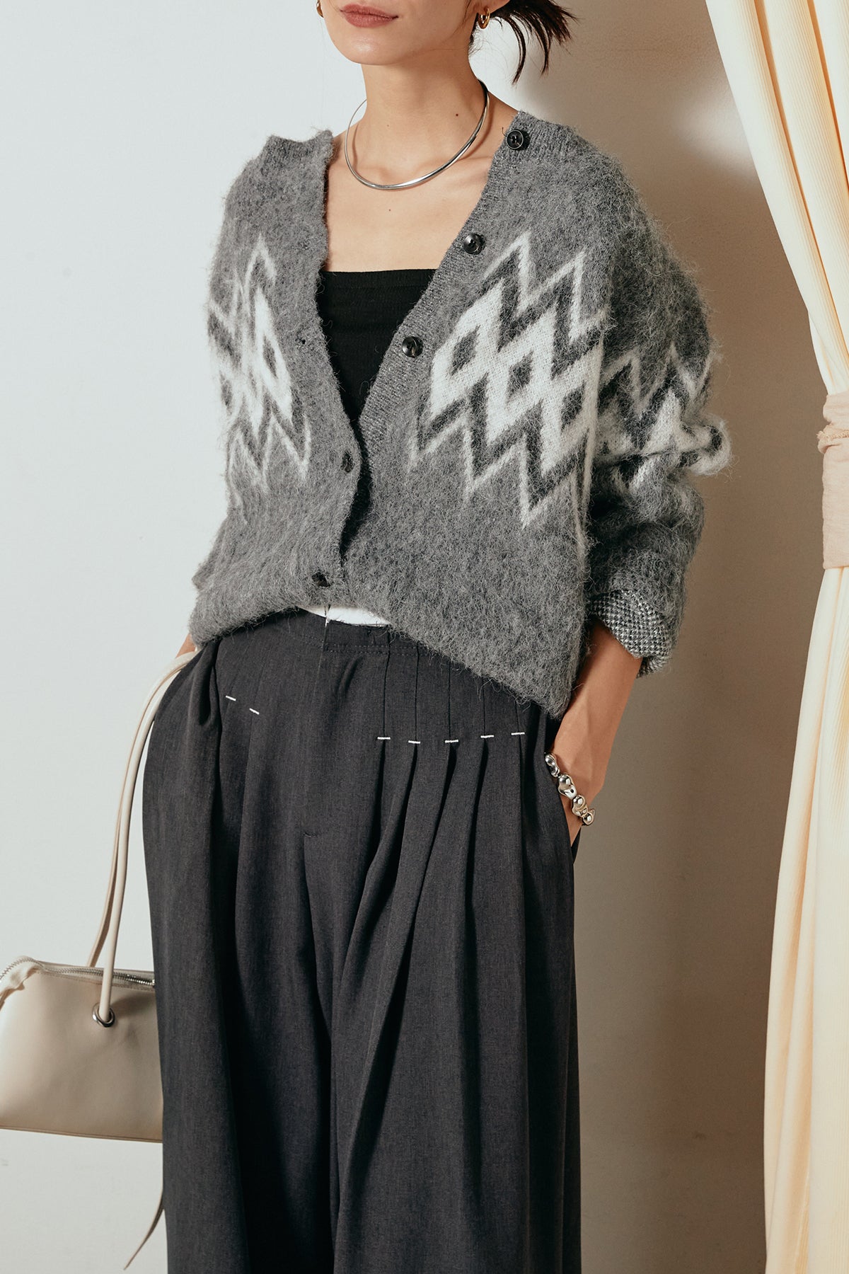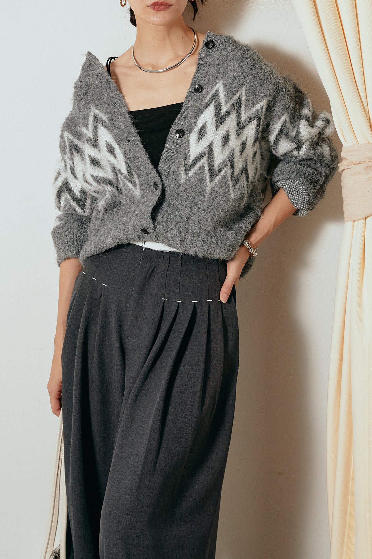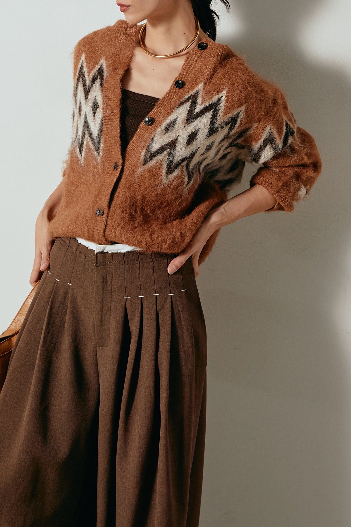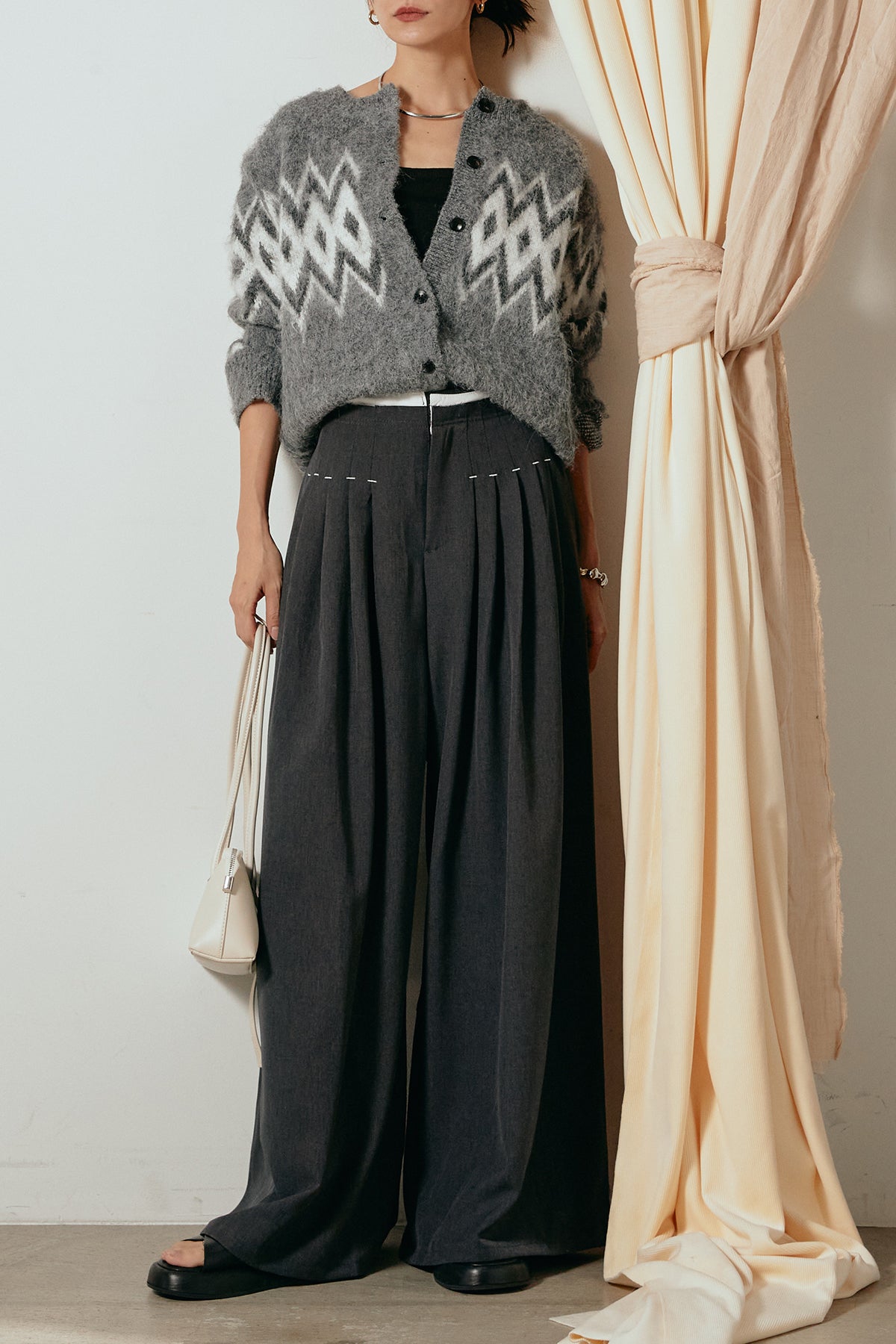 [SET]起毛ノルディック柄ニットカーディガン+ウエストステッチデザインワイドスラックス(2set)