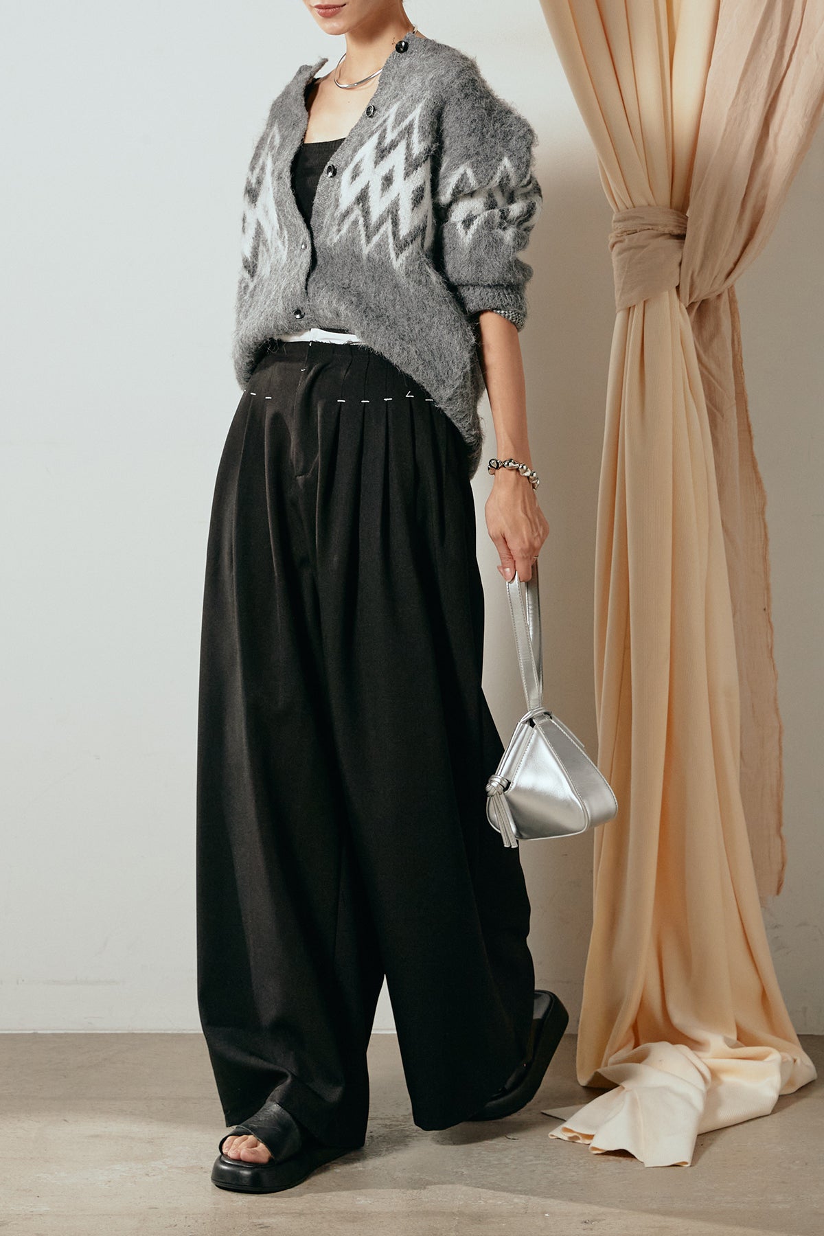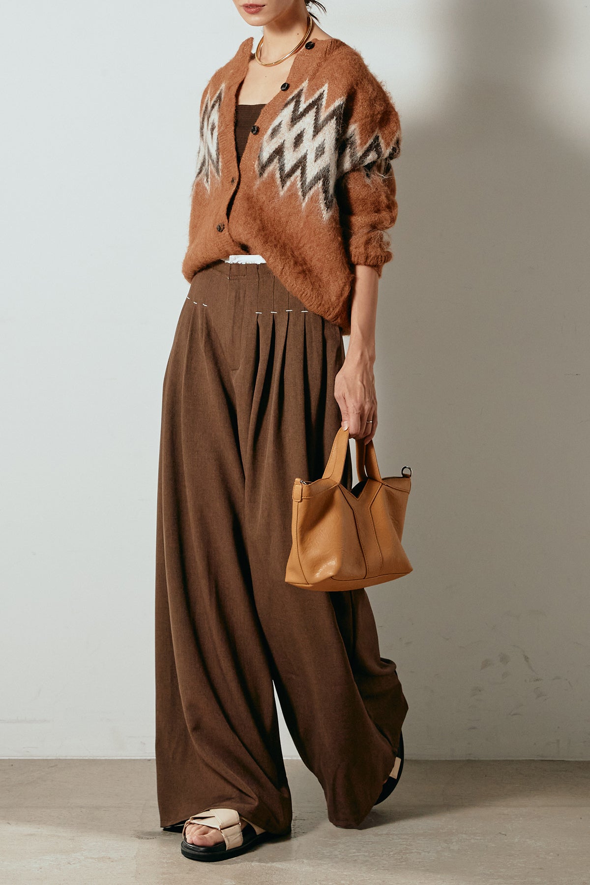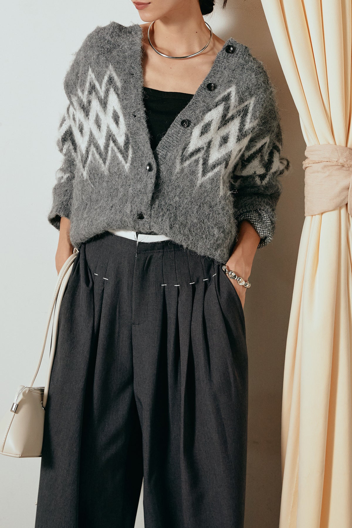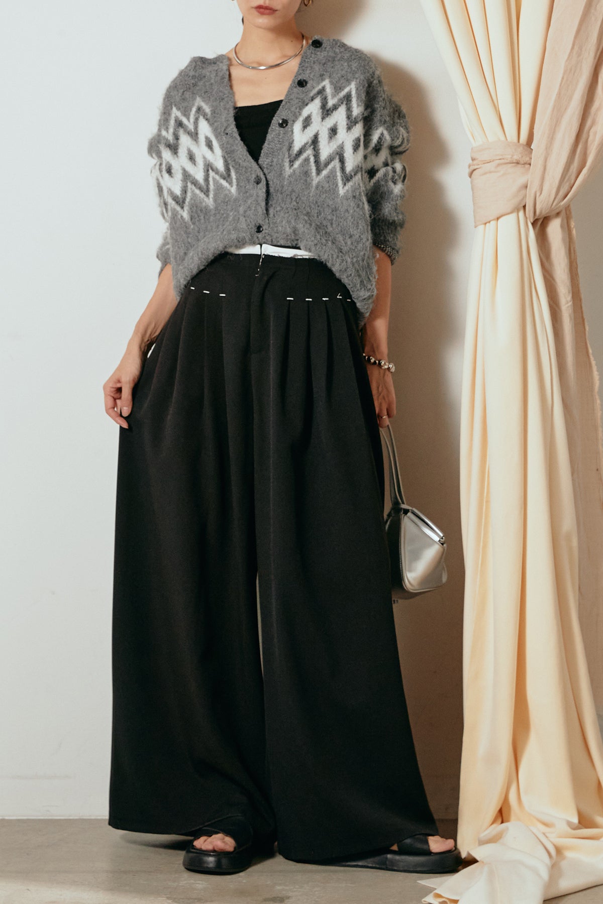 [SET]起毛ノルディック柄ニットカーディガン+ウエストステッチデザインワイドスラックス(2set)