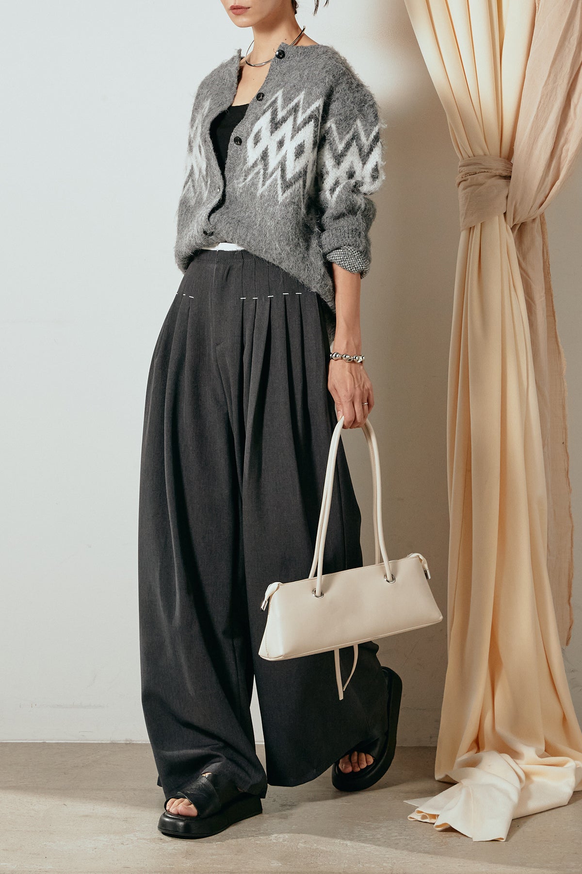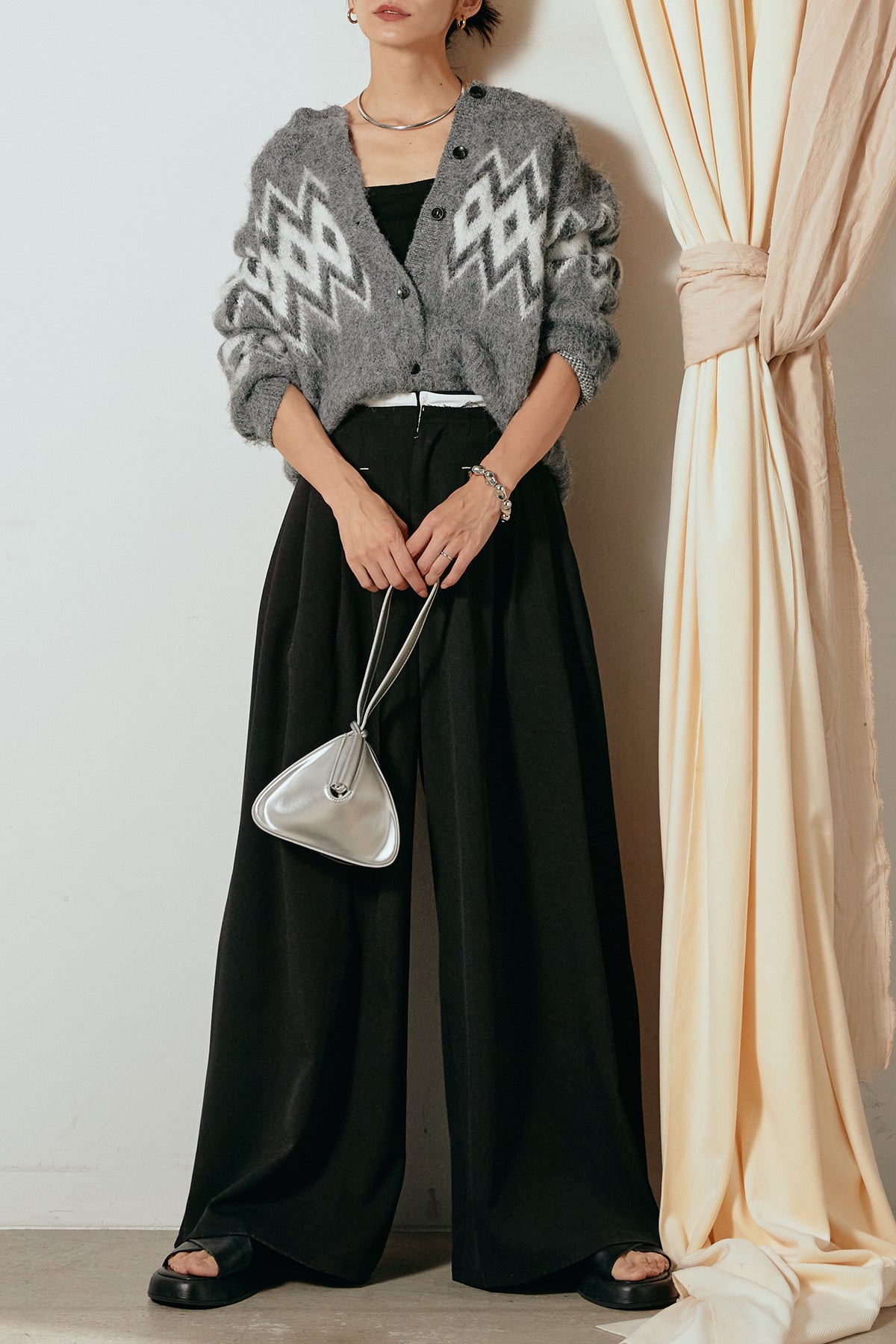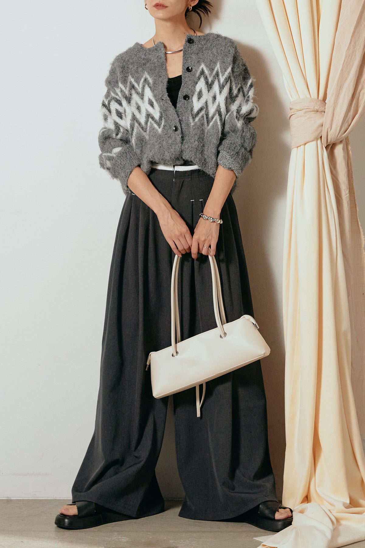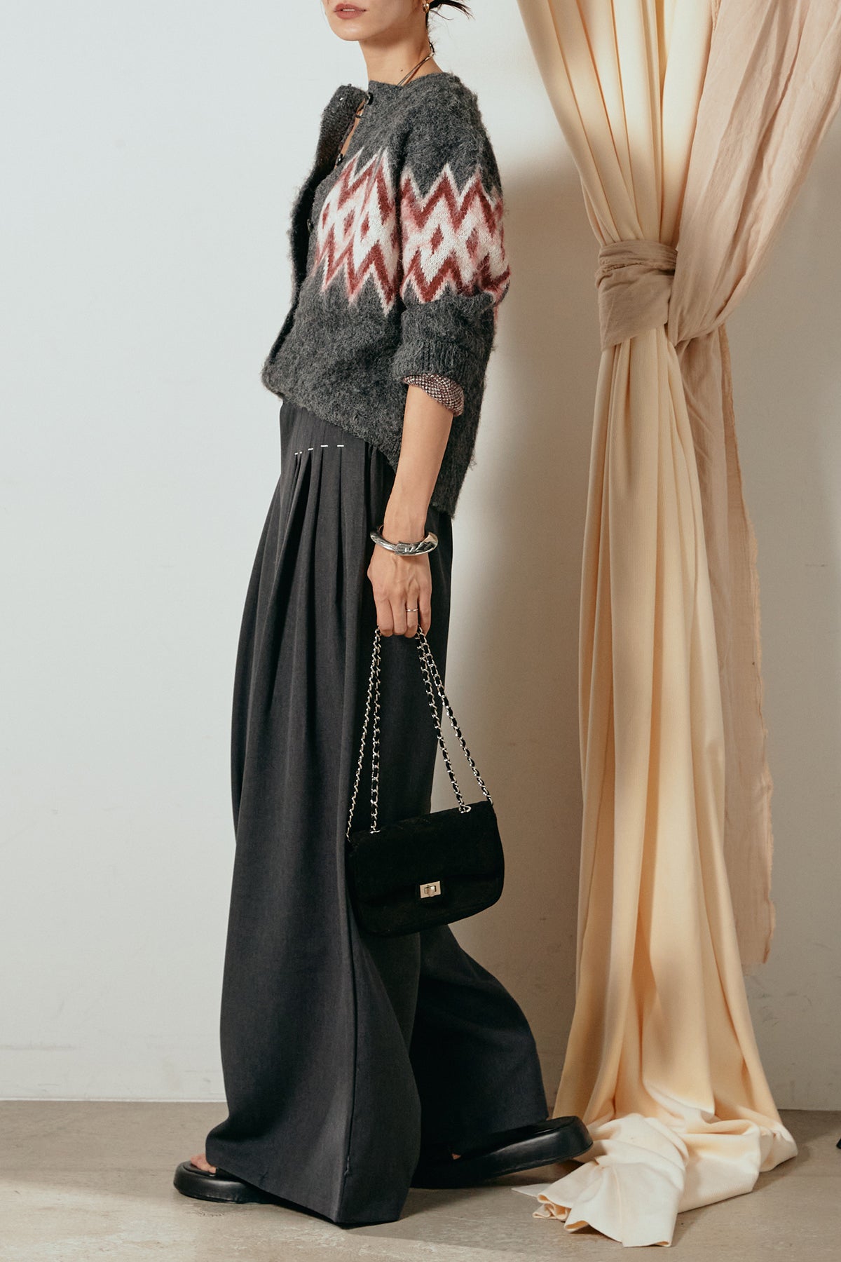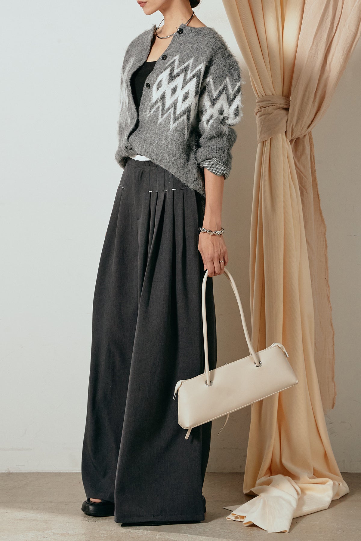 [SET]起毛ノルディック柄ニットカーディガン+ウエストステッチデザインワイドスラックス(2set)