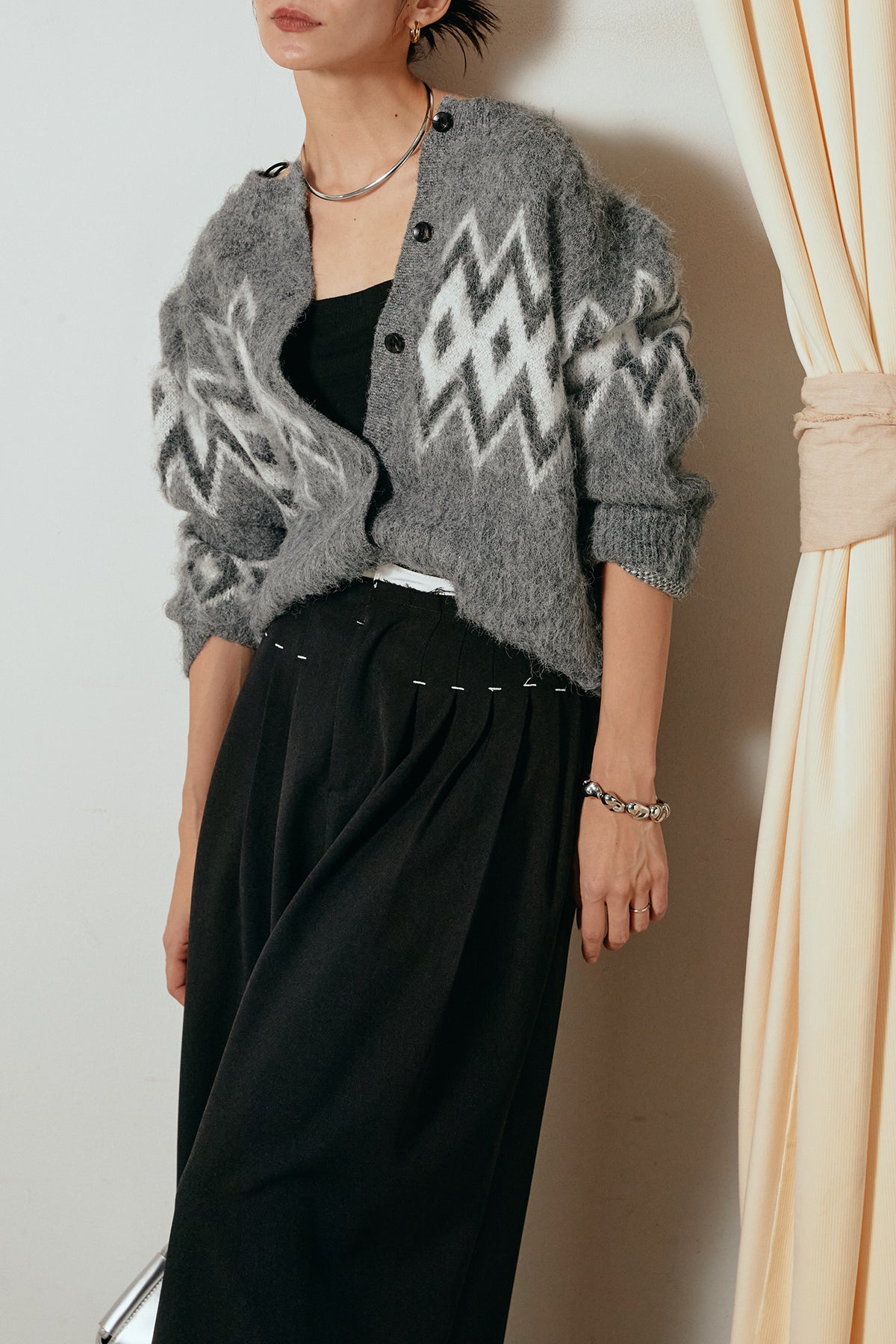 起毛感のある風合いが魅力のノルディック柄ニットカーディガン。 季節感のあるモヘアタッチ素材で、やわらかな印象に仕上げました。 程よいショート丈とゆるめのシルエットが抜け感を生み、どんなボトムともバランスよくマッチ。 一枚で主役になる存在感のあるデザインで、羽織るだけで秋冬ムードを高めてくれるアイテムです。