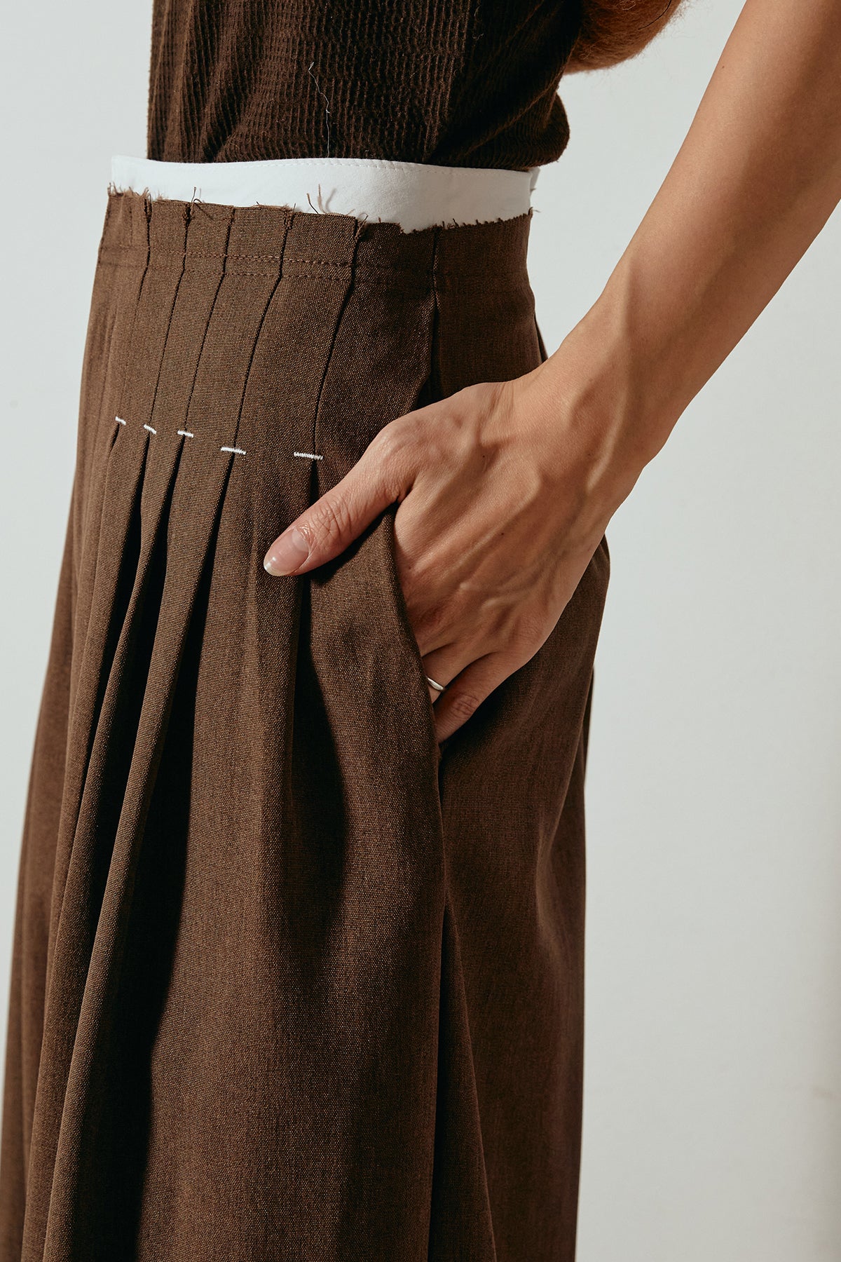 ウエスト部分にあしらわれたステッチデザインが特徴的なワイドスラックス。 深めのタックが生み出す立体的なボリューム感と、落ち感のある生地が美しいシルエットを描きます。 ハイウエスト仕様で脚長効果も抜群。 シンプルながらもディテールにこだわったデザインで、ニットやブラウスなどさまざまなトップスと相性の良い一本です。